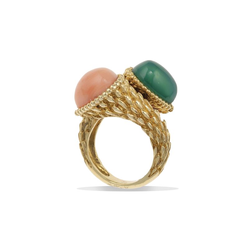 Anello contrarié con corallo rosa e agata verde