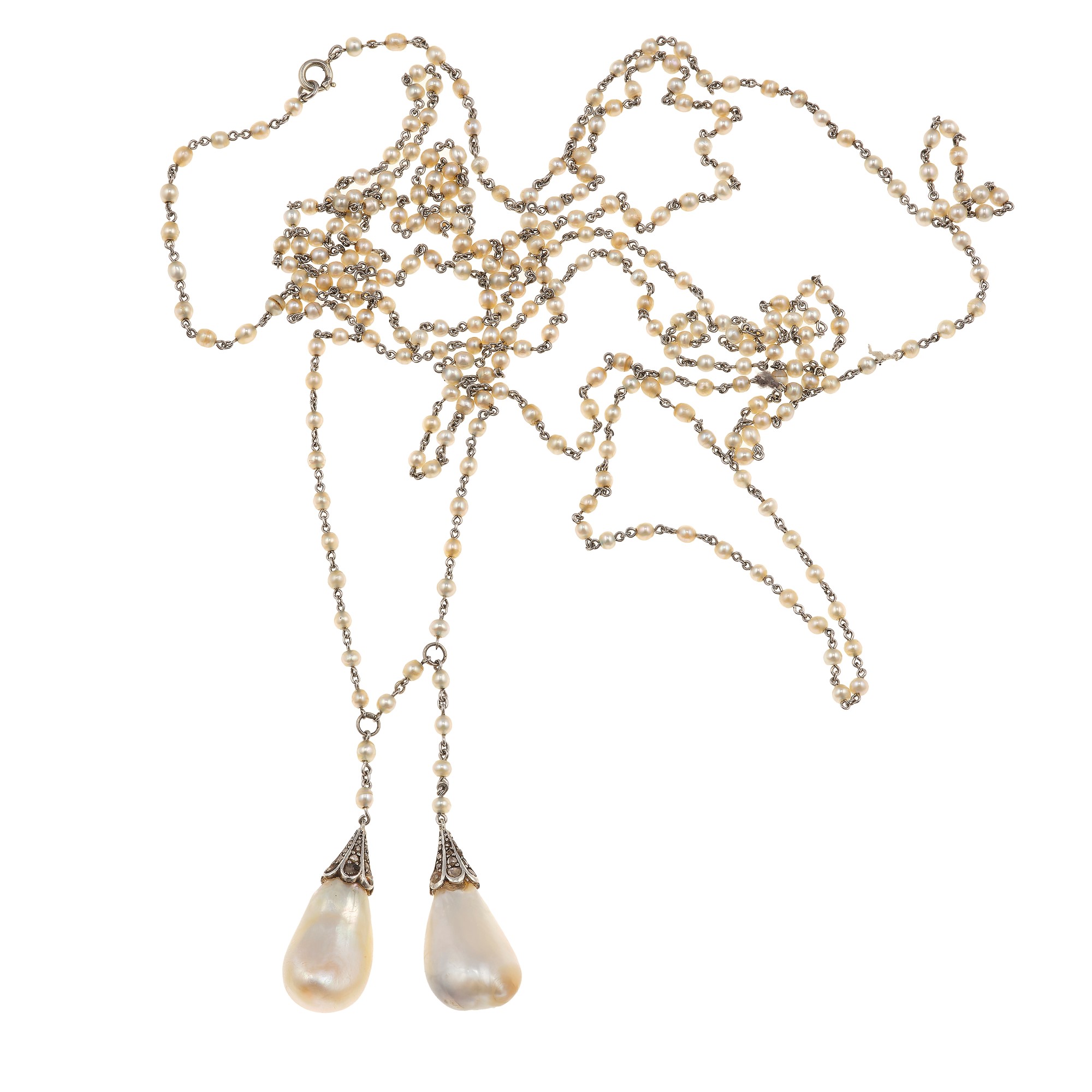 Sautoir con due perle naturali, acqua salata, di ct 18.56 e 21.05 con piccole perline sulla catena