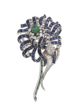 Spilla con zaffiri, diamanti e smeraldo
