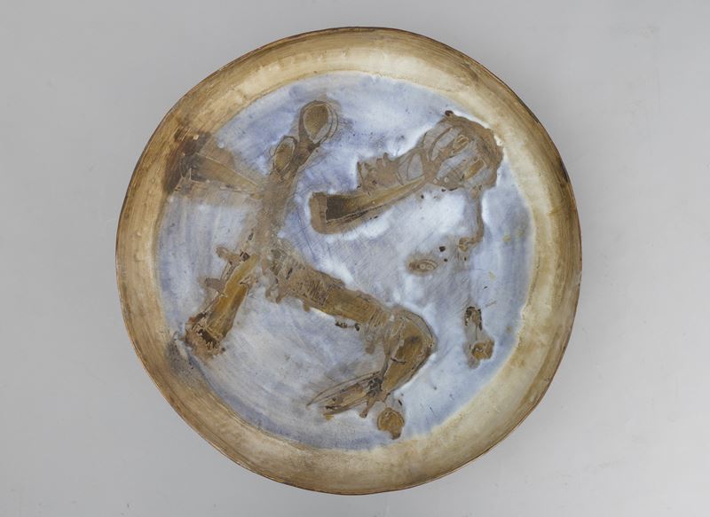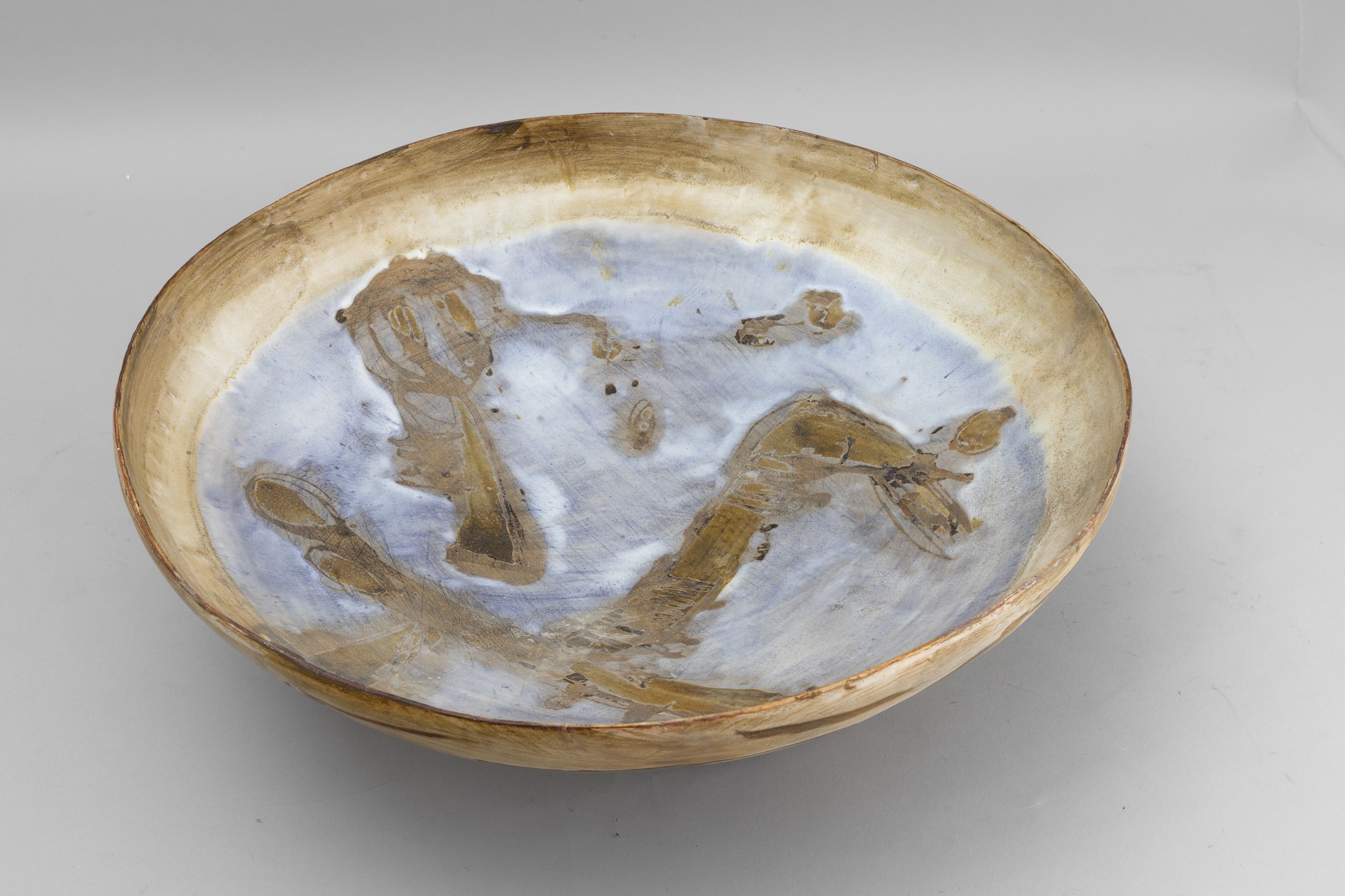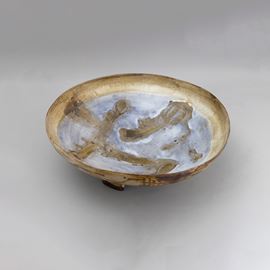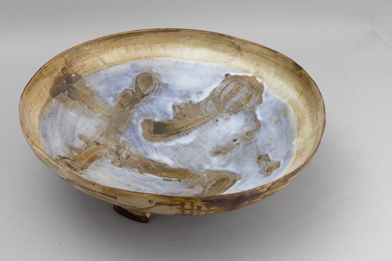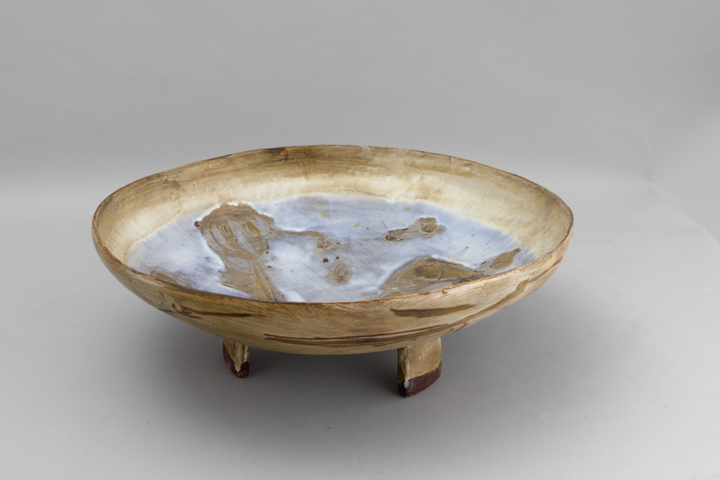 Grande coppa su tre piedi in terracotta maiolicata con decoro astratto.