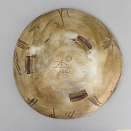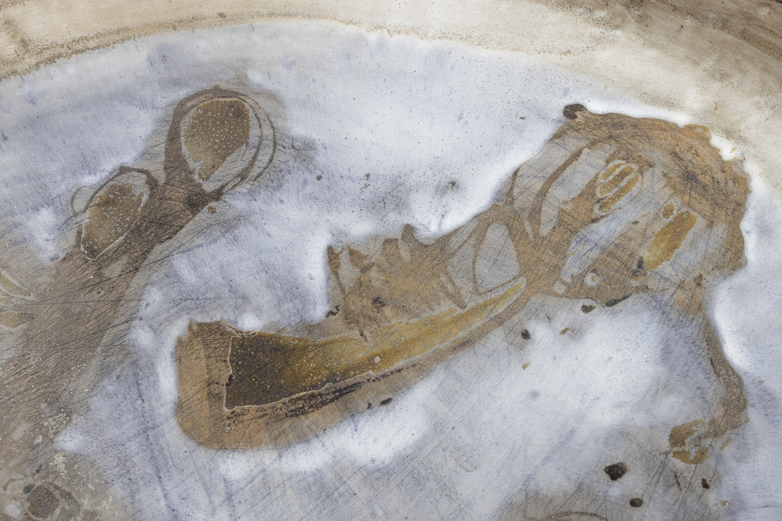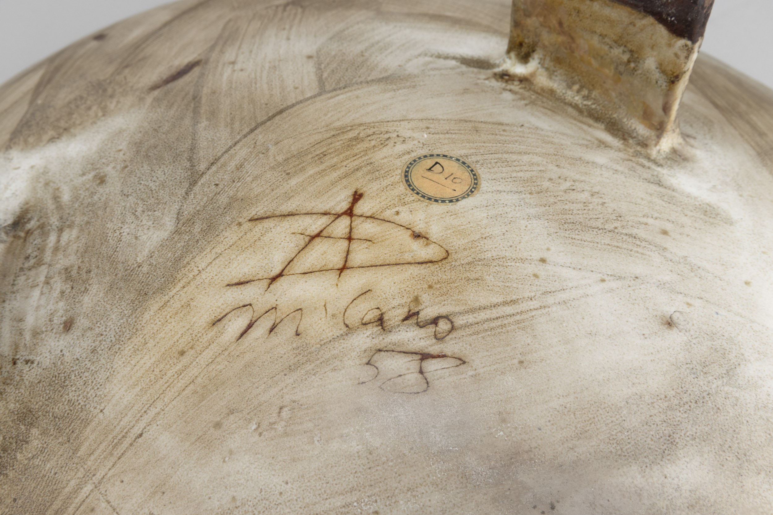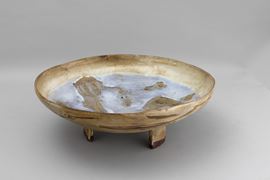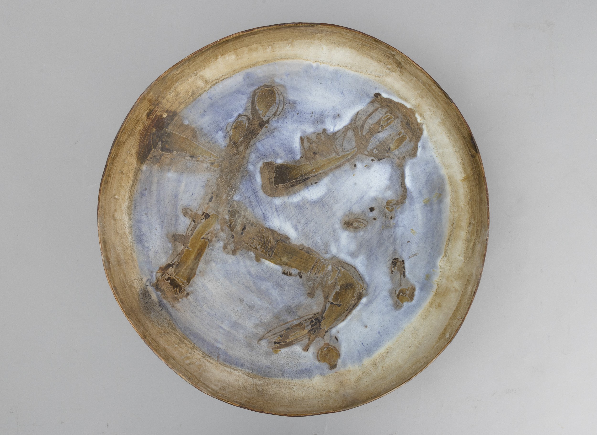 Grande coppa su tre piedi in terracotta maiolicata con decoro astratto.