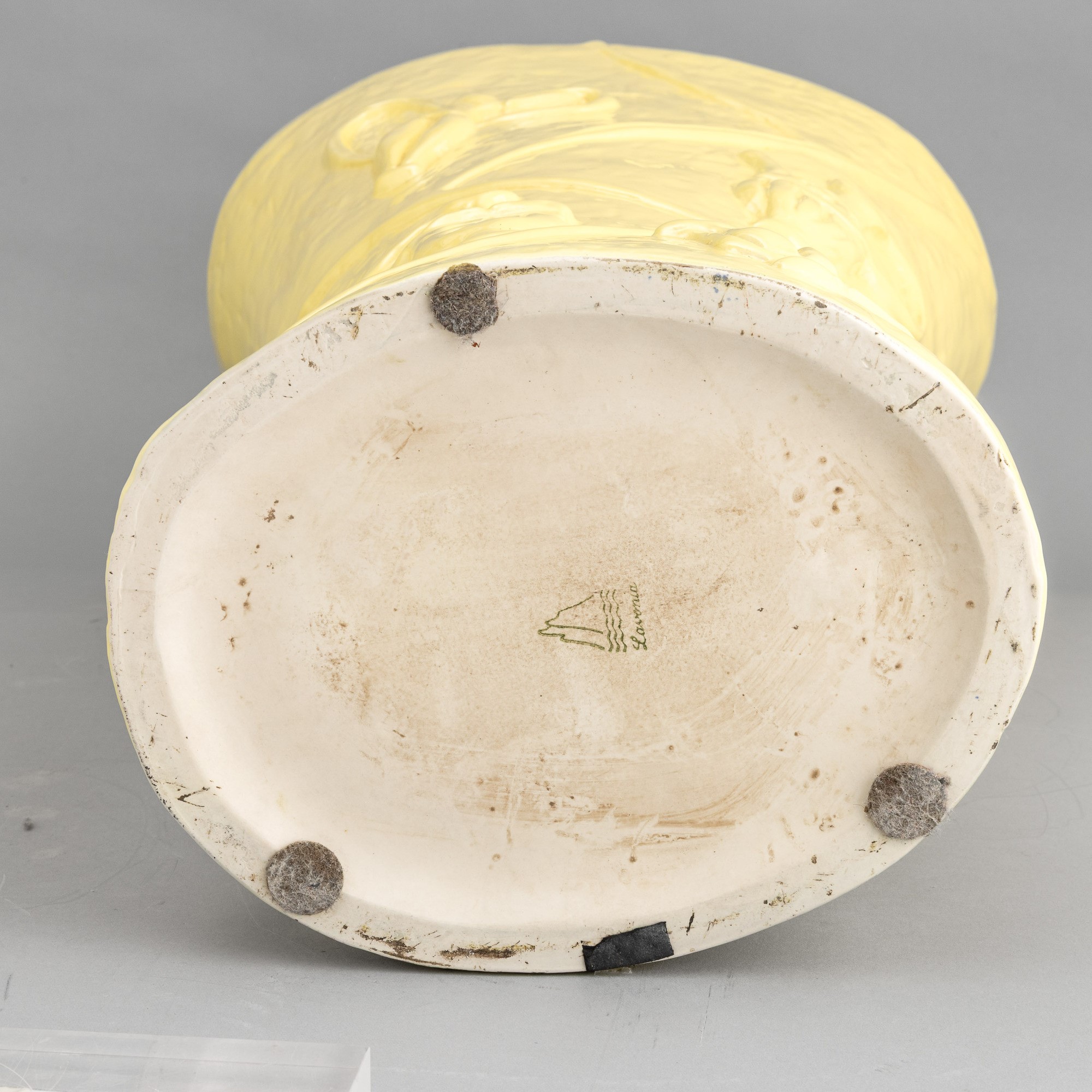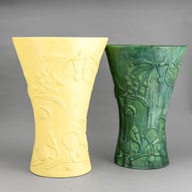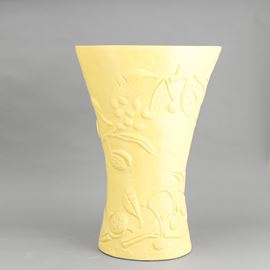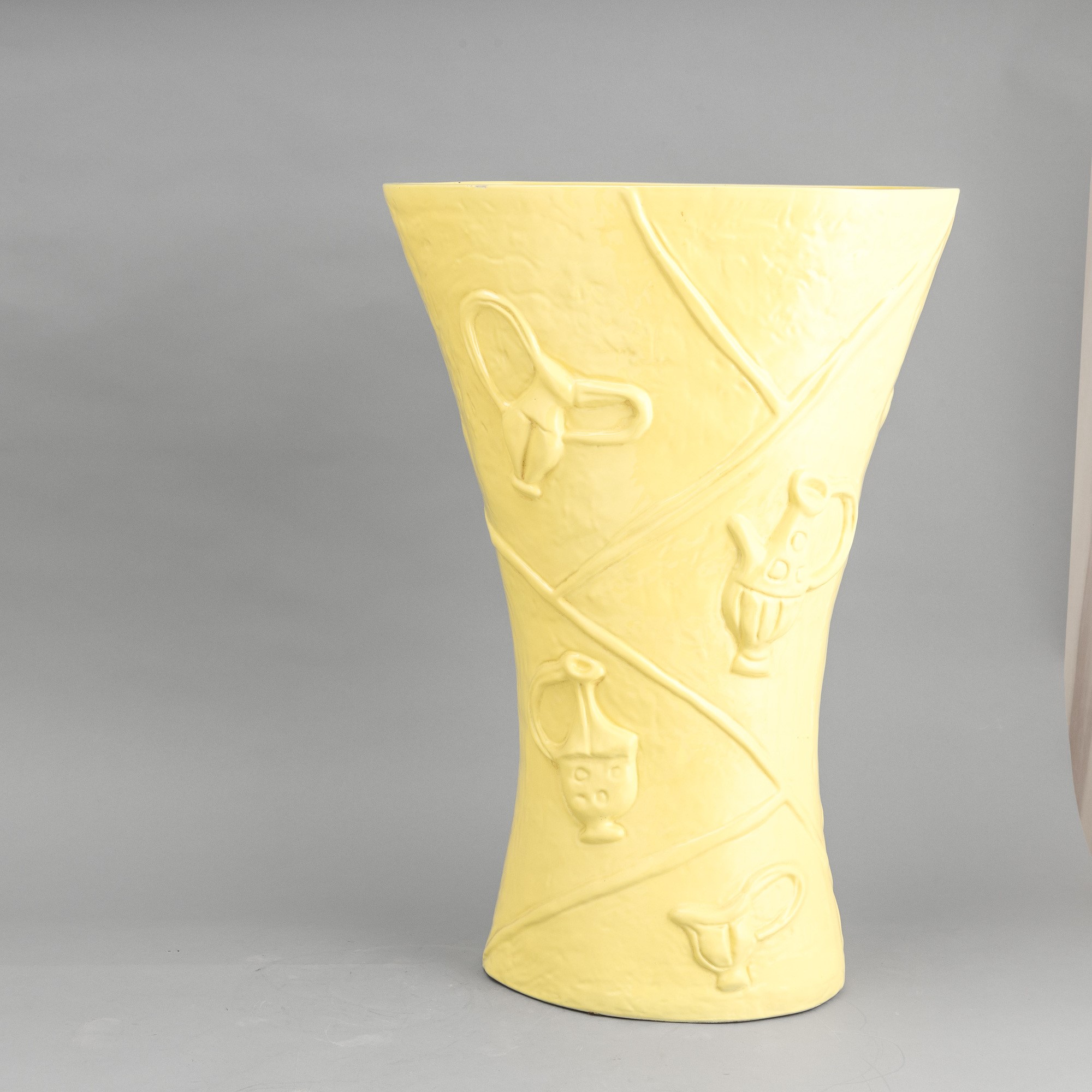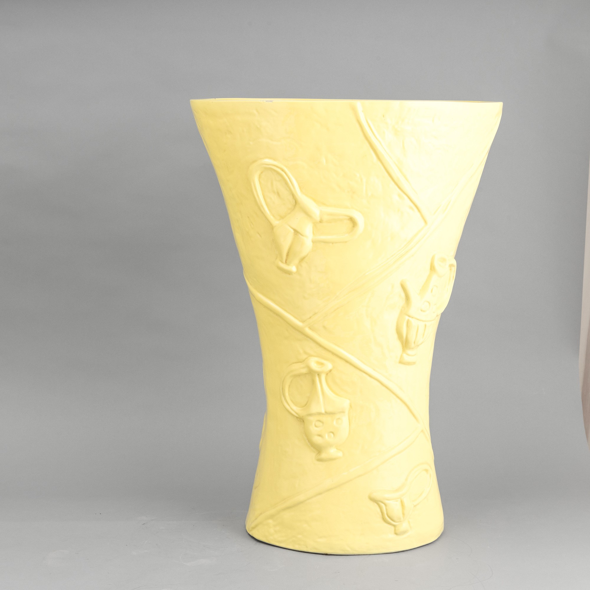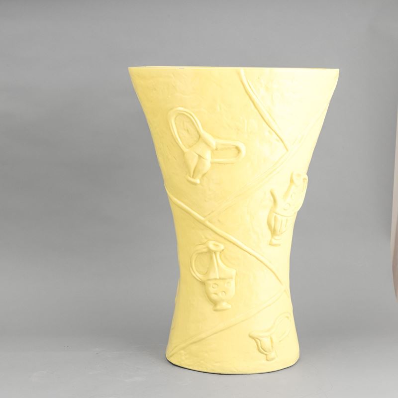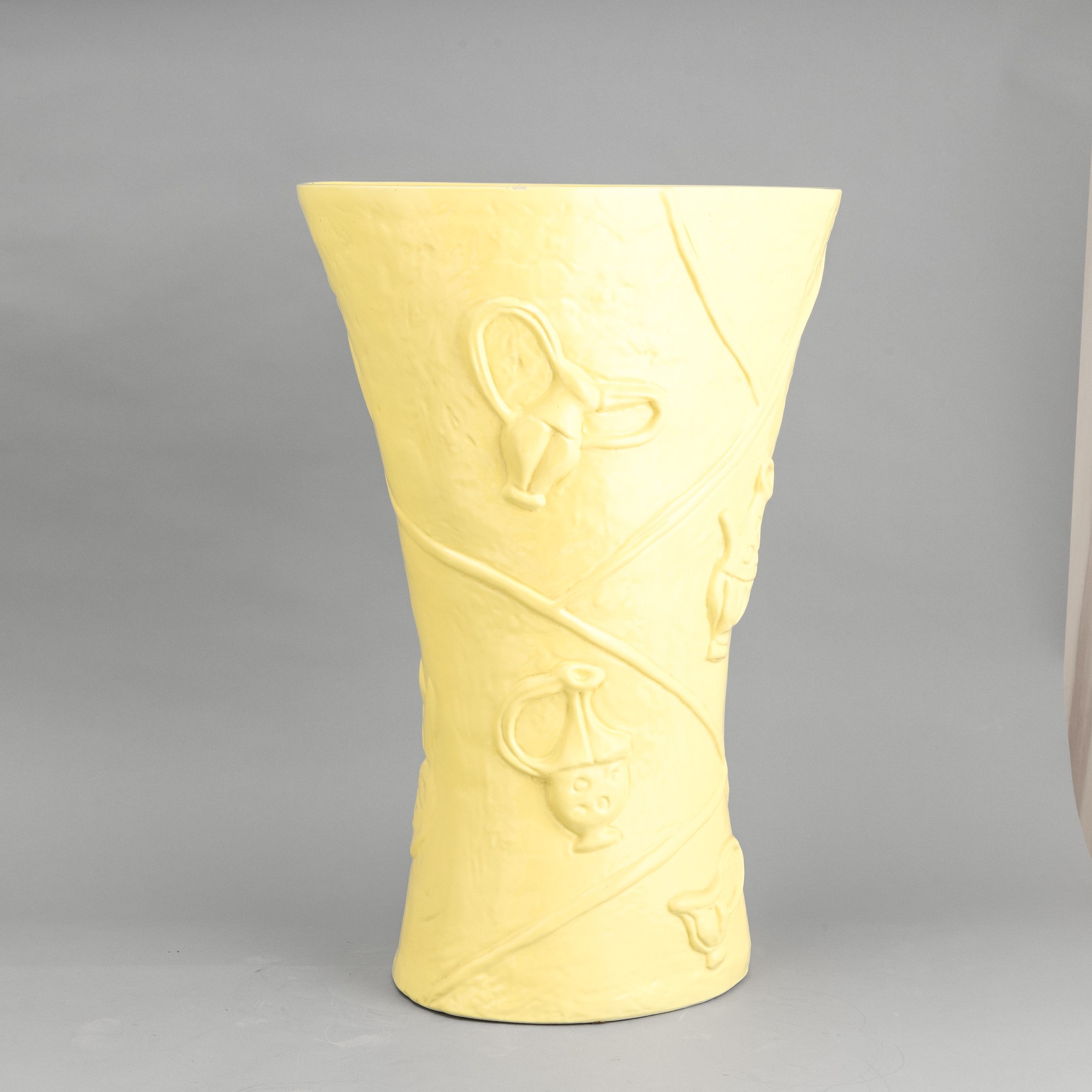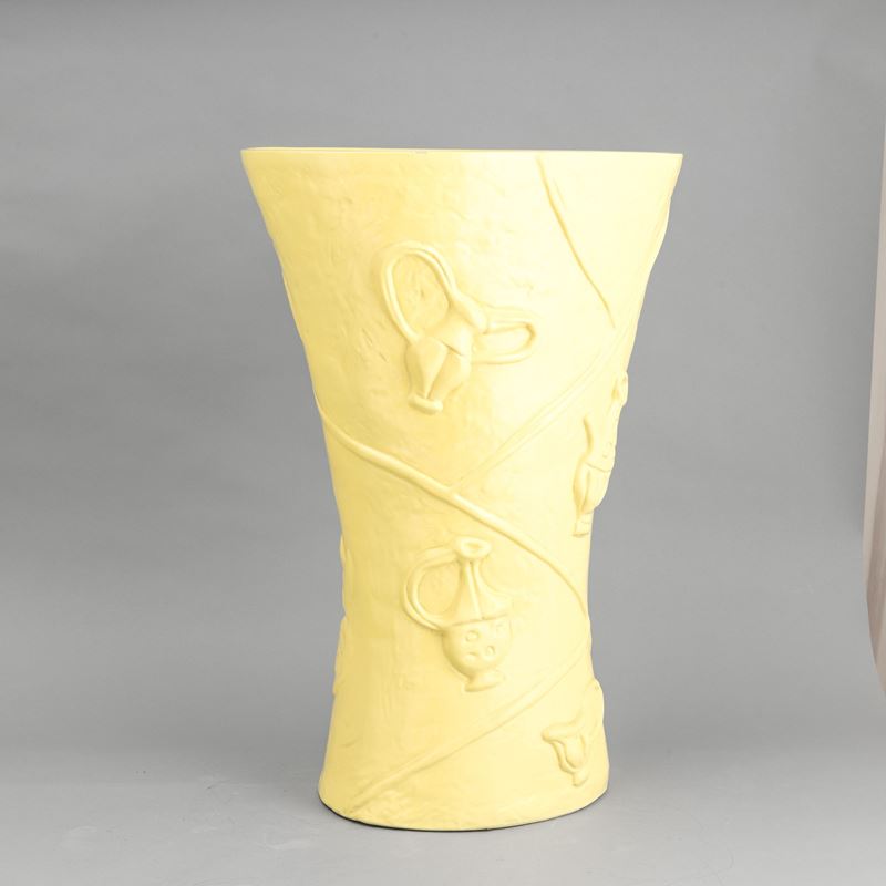Grande vaso portaombrelli a forma di clessidra a sezione ovale in terraglia a colaggio con motivi di rami a rilievo e decoro a smalto giallo limone.