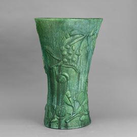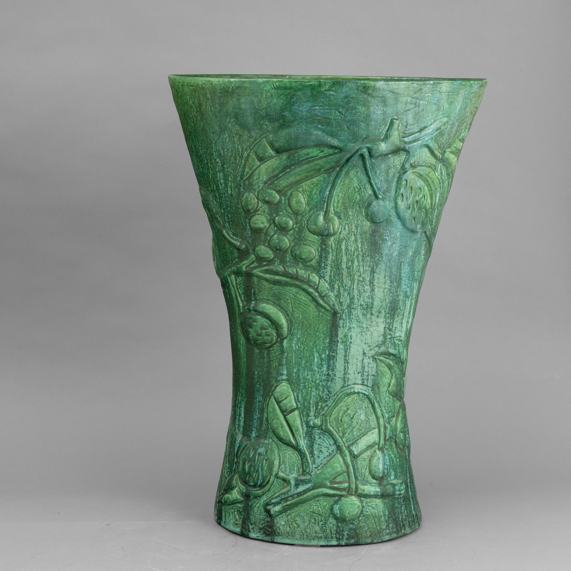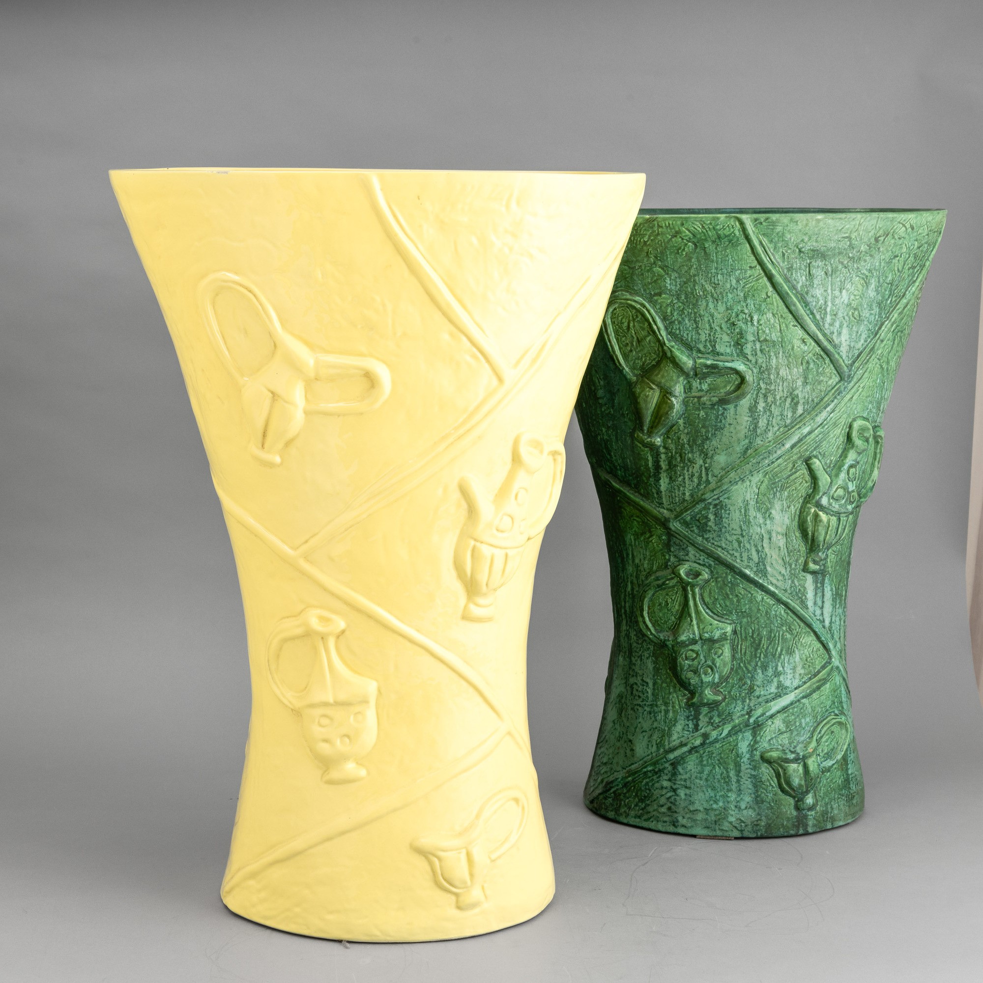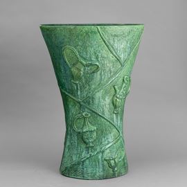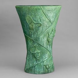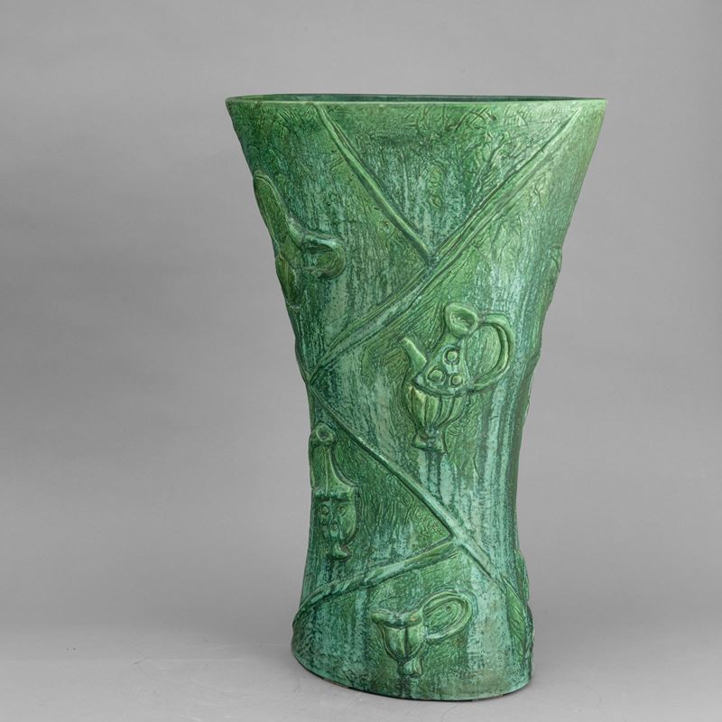 Grande vaso portaombrelli a forma di clessidra a sezione ovale in terraglia a colaggio con motivi di rami di ciliegio e vasi a smalto verde.
