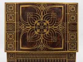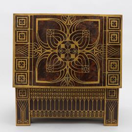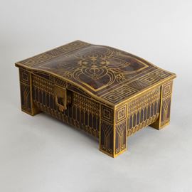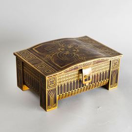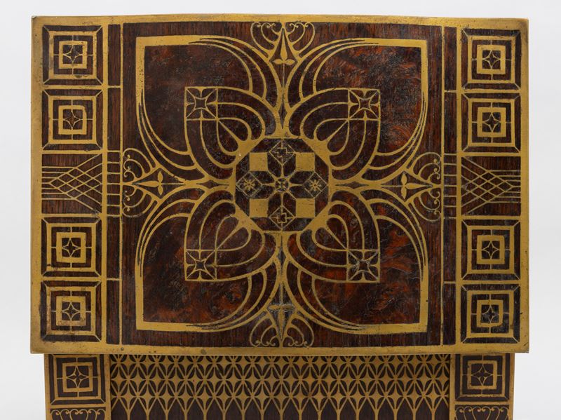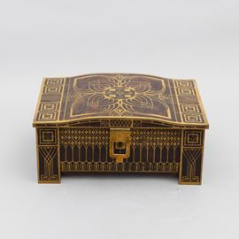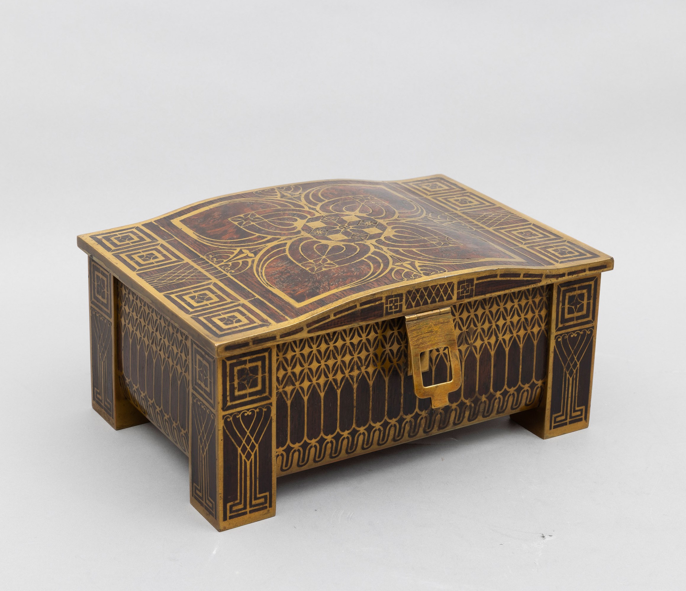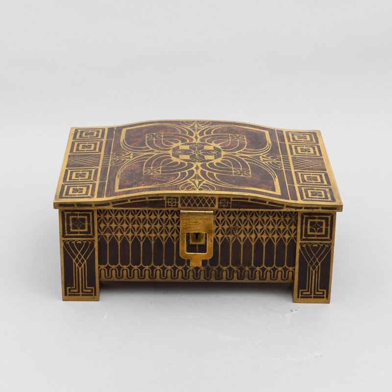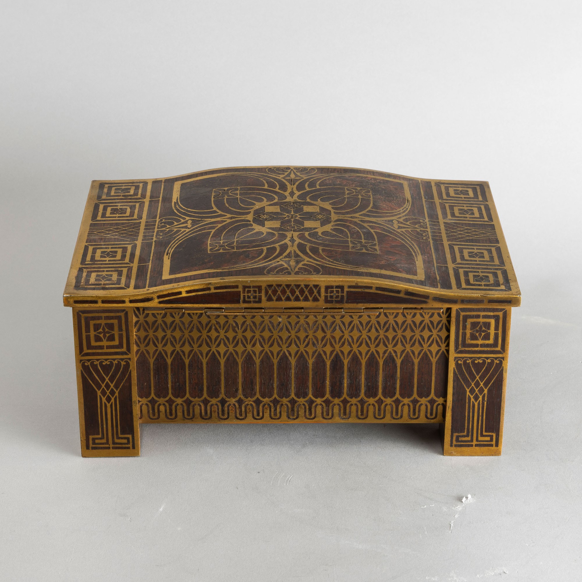 Scatola rettangolare in legno con intarsi geometrici e floreali in ottone.