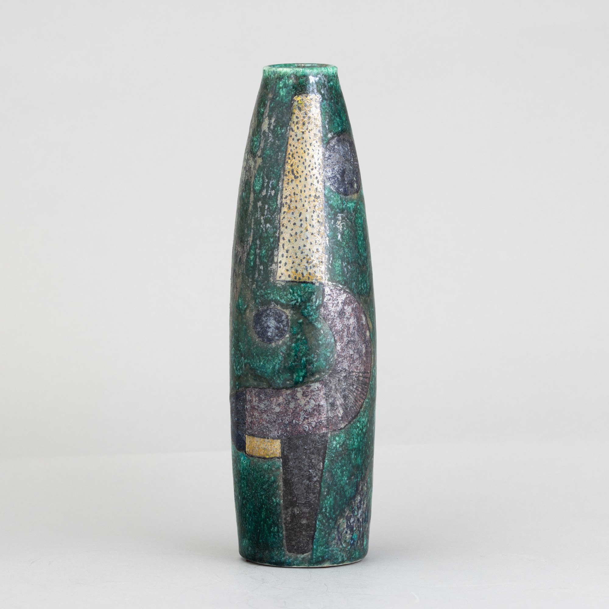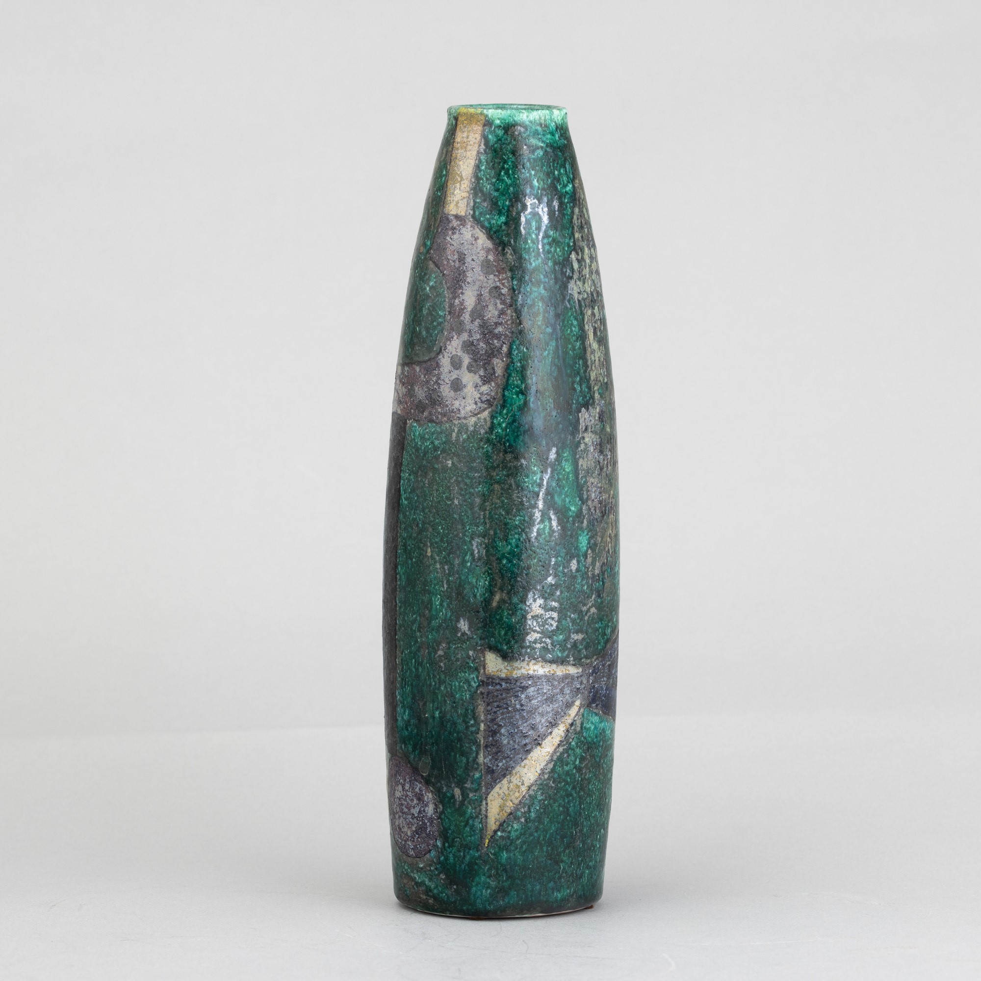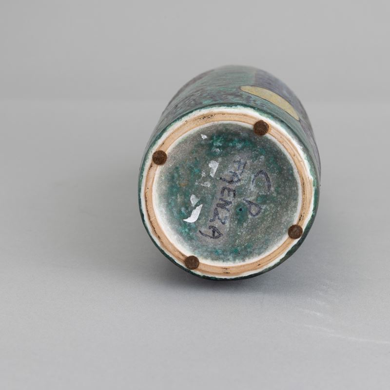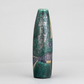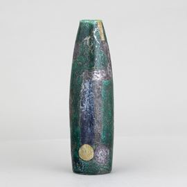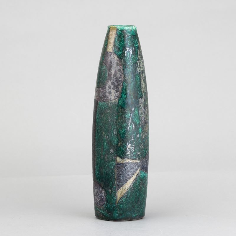 Vaso in forma di sigaro in ceramica maiolicata con decoro astratto a lustri e foglia d'argento.
