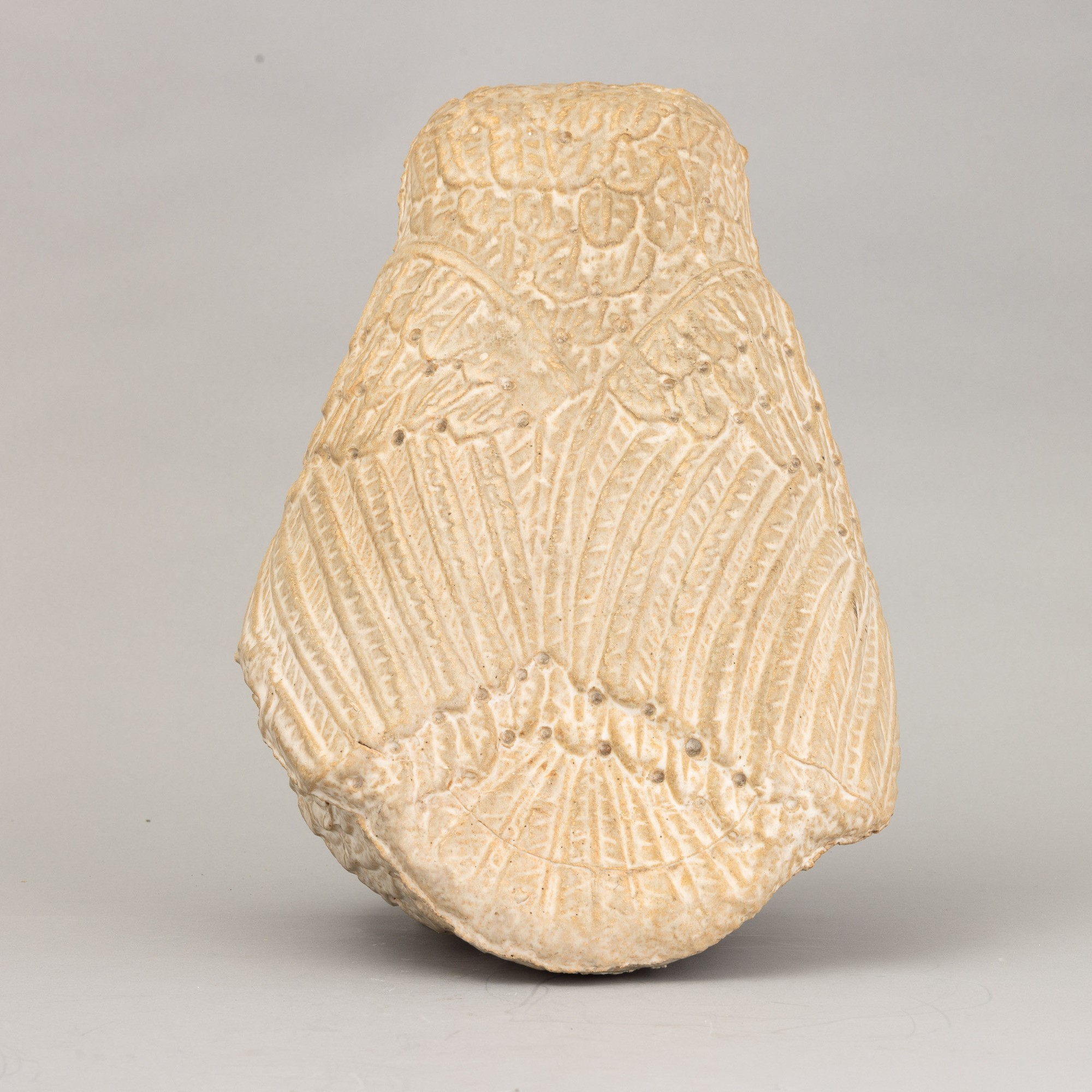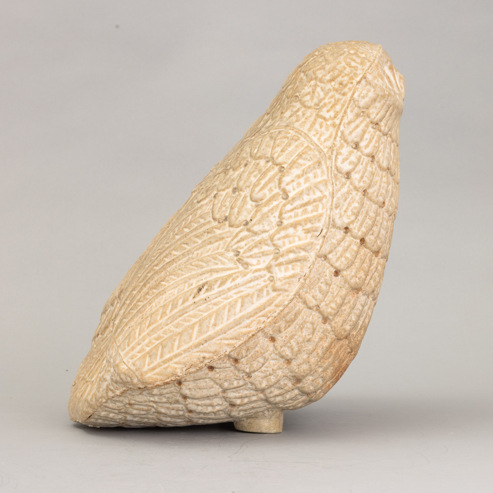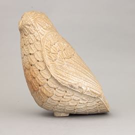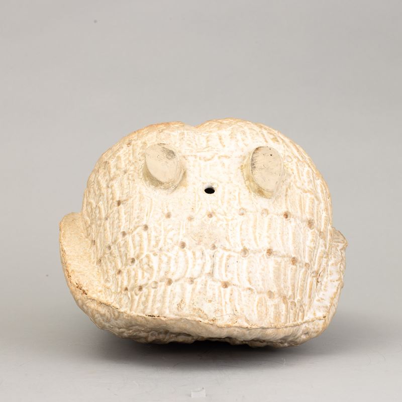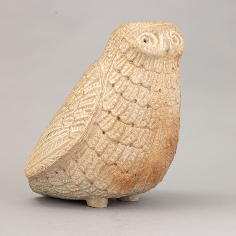 Scultura raffigurante civetta in ceramica a colaggio con decoro di smalto monocromo.