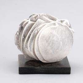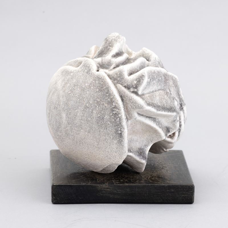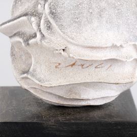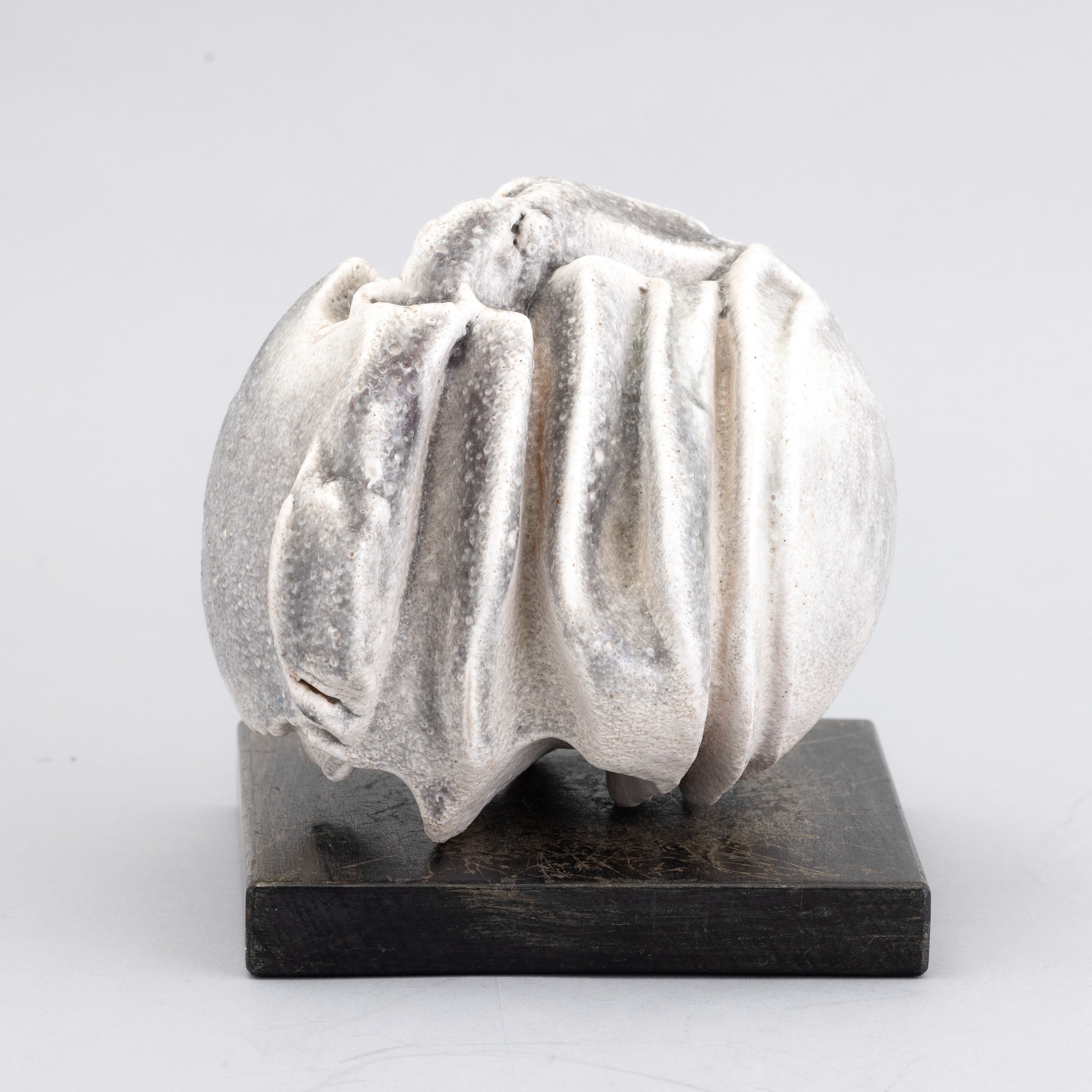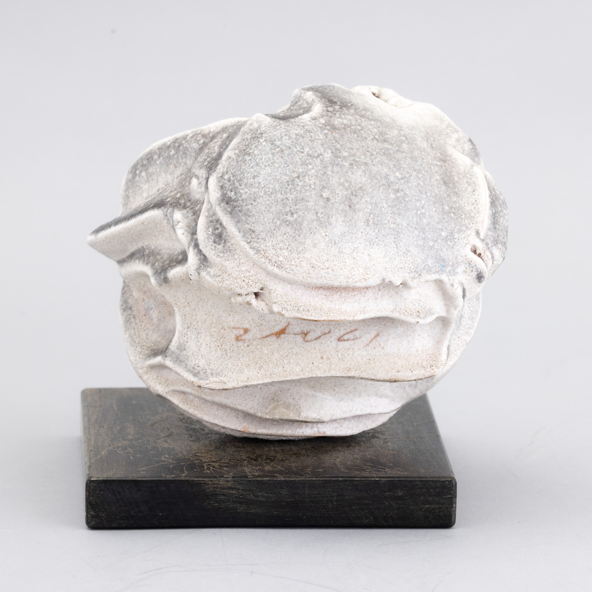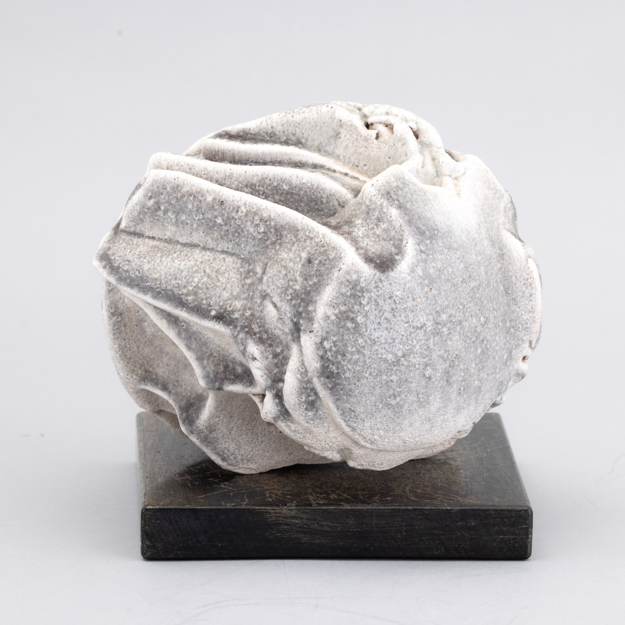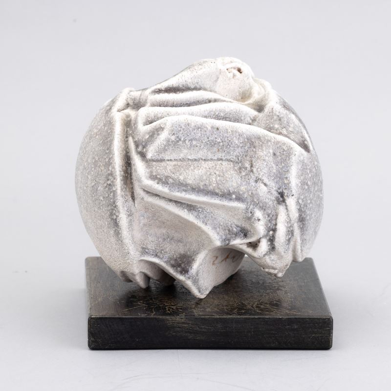 Piccola scultura in grés a stampo con decoro di smalto monocromo. Basamento in legno.