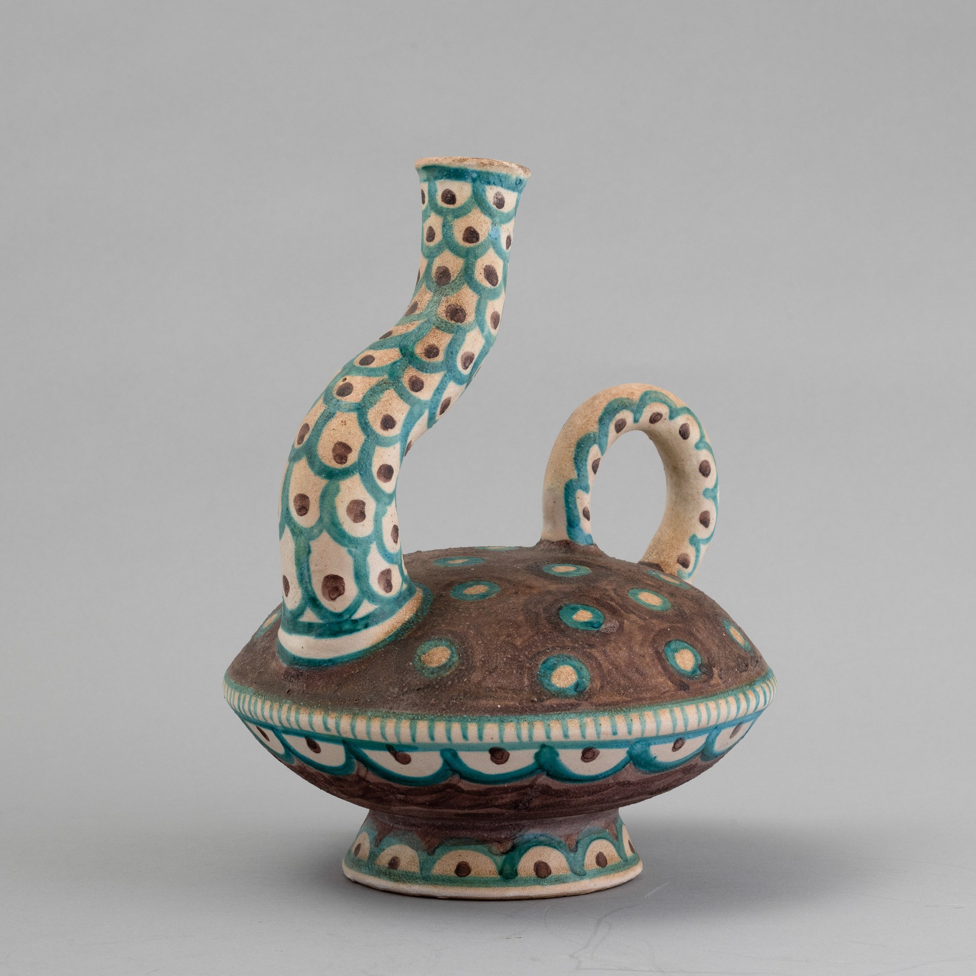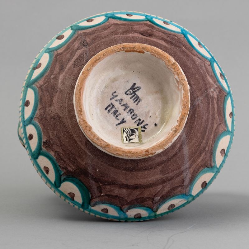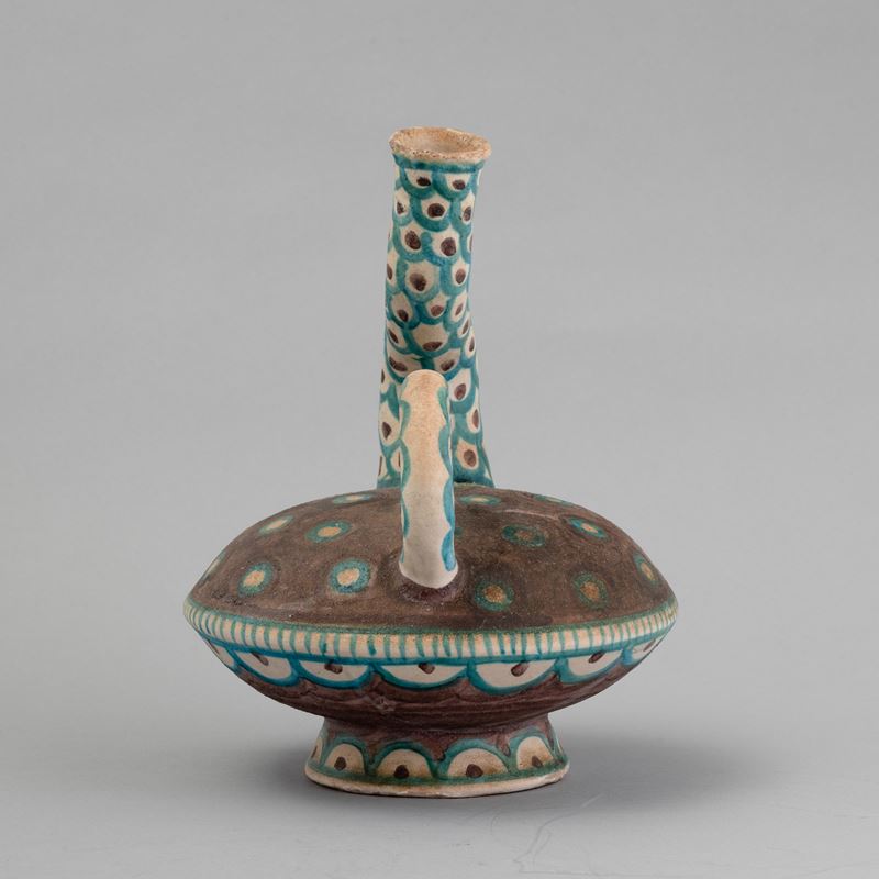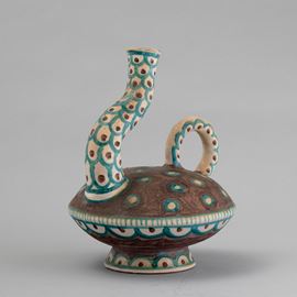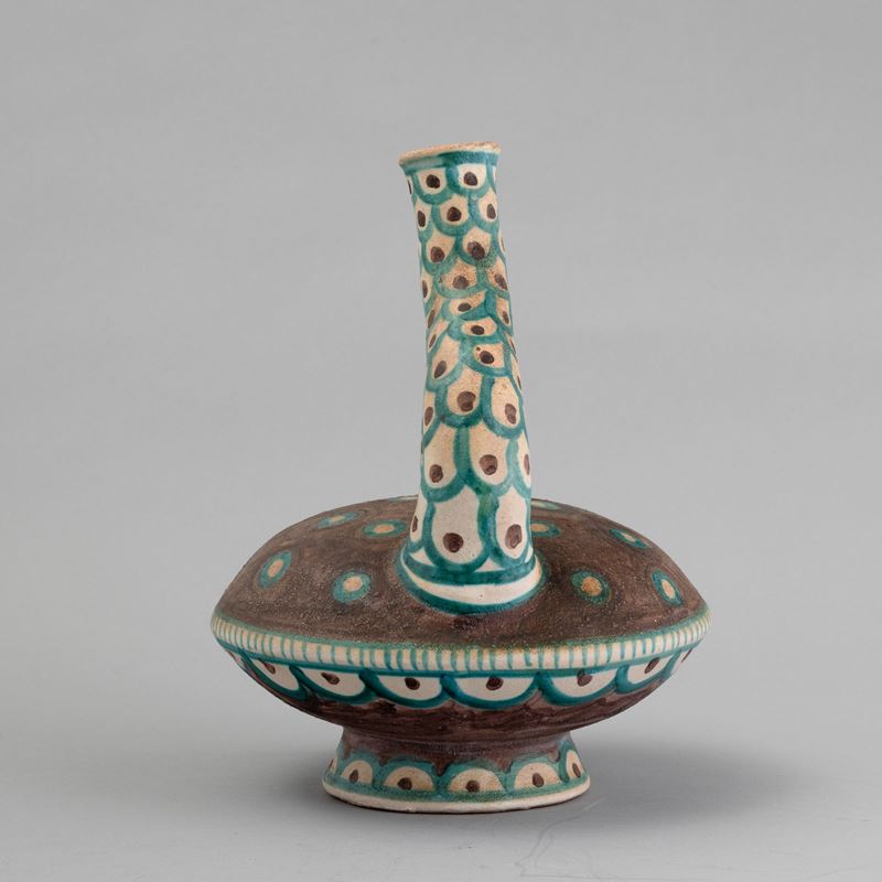 Raro vaso in forma di sfera schiacciata su base troncoconica con collo ricurvo e ansa applicata. Decoro a smalti policromi.
