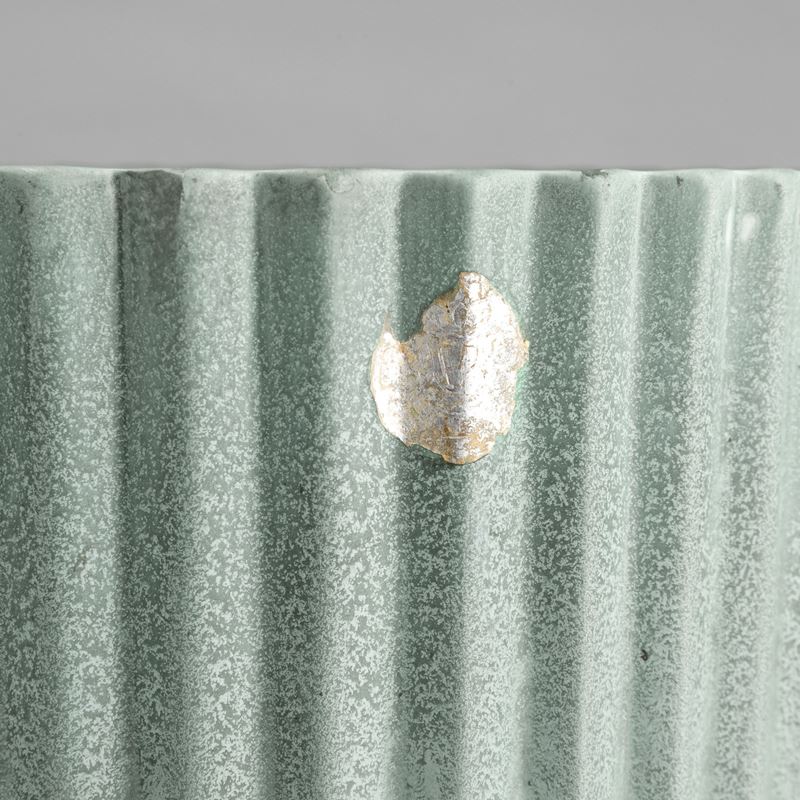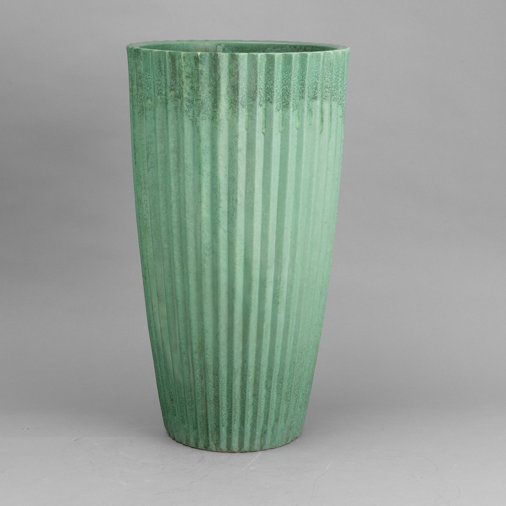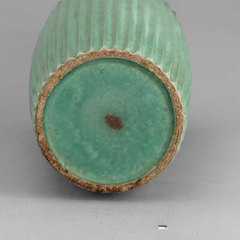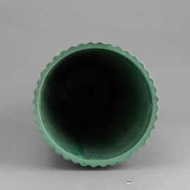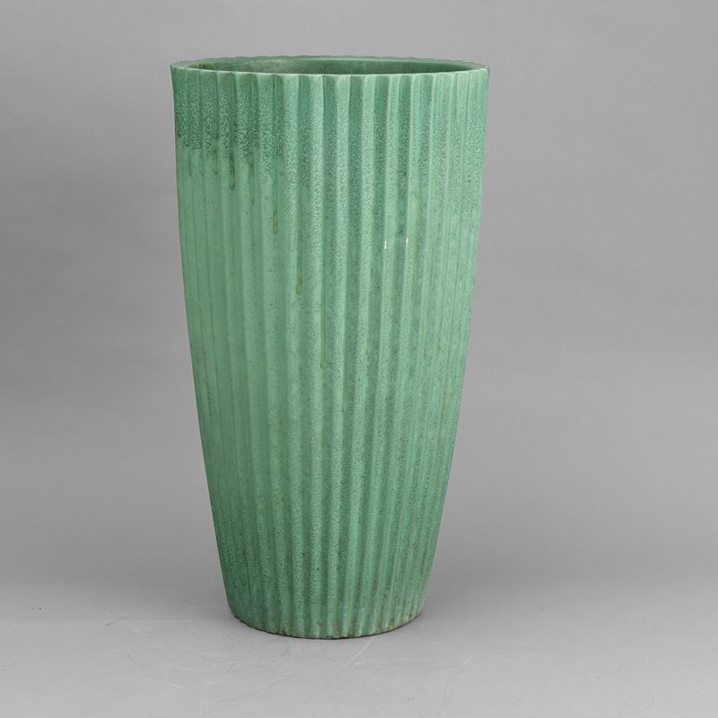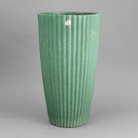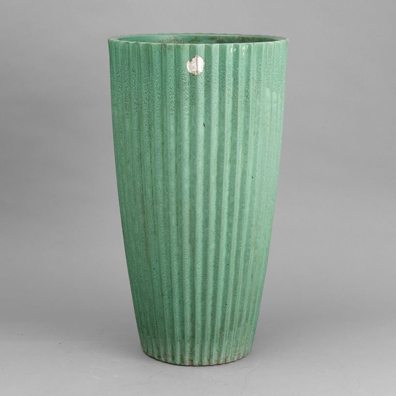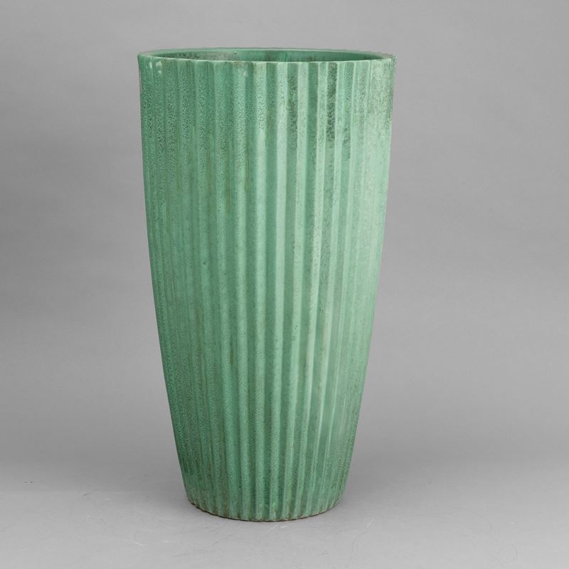 Grande vaso troncoconico portaombrelli in ceramica a smalto verde con decoro di costolature verticali.