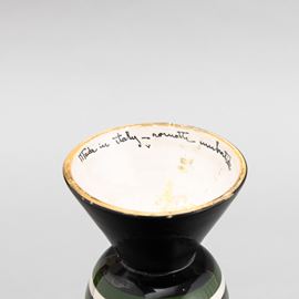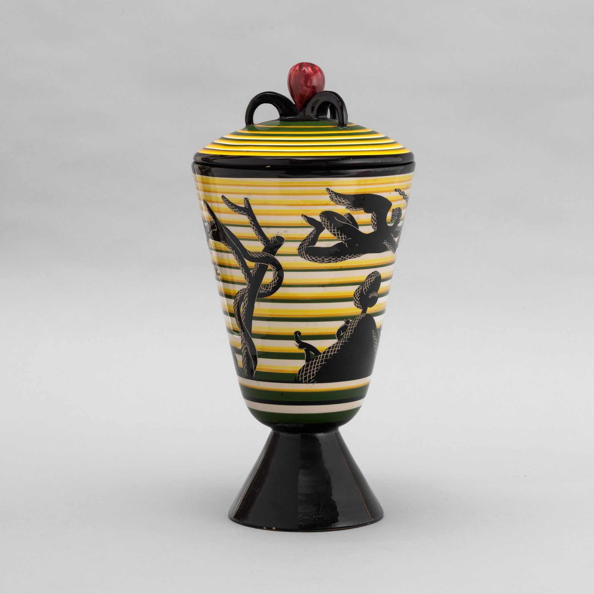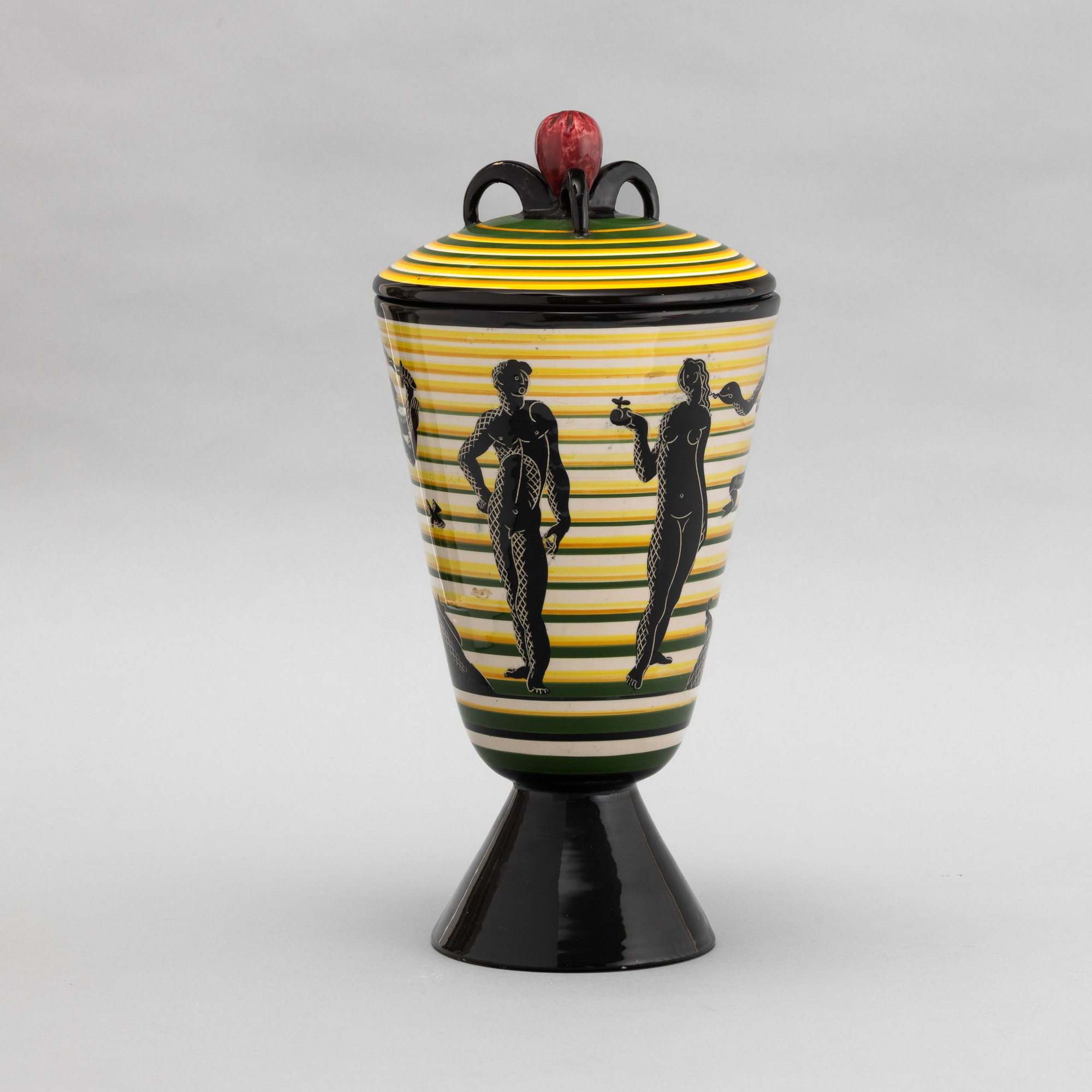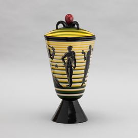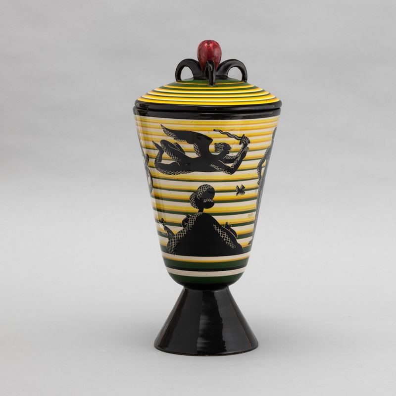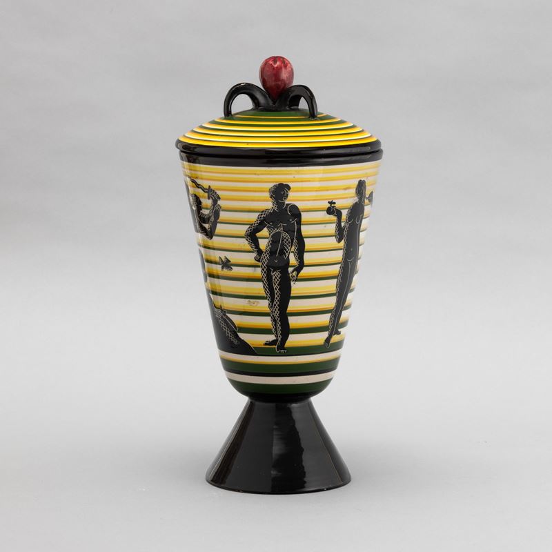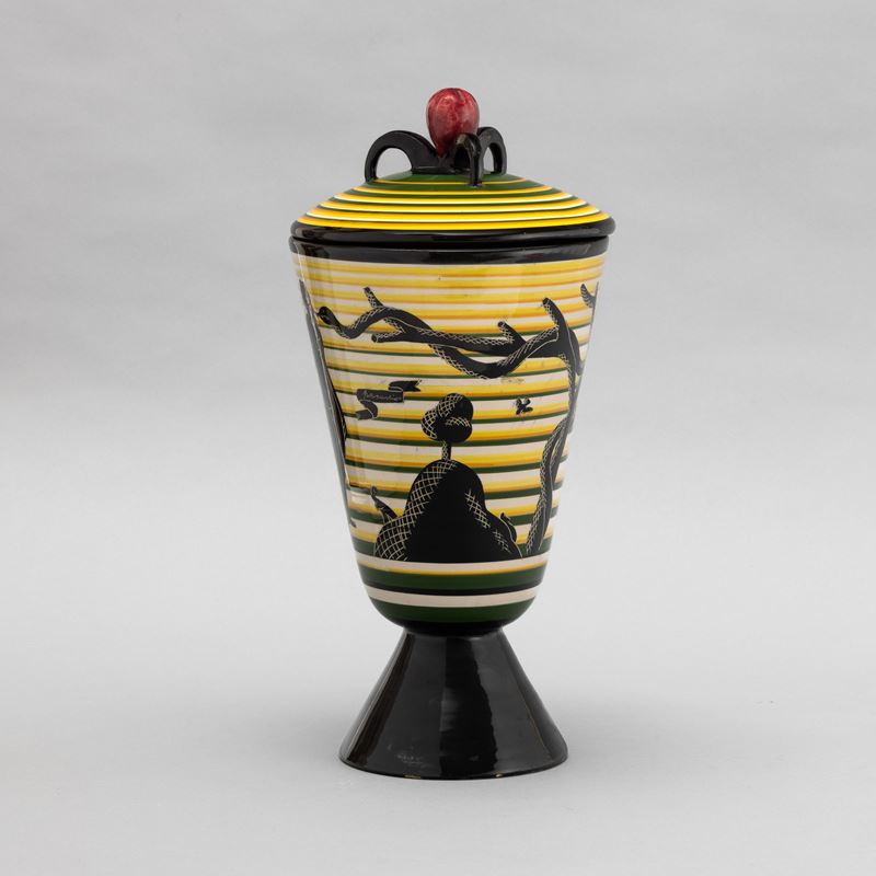 Cista con coperchio su alto piede troncoconico in terracotta maiolicata con presa in forma di frutto. Decoro di paradiso terrestre stilizzato su fondo a fasce orizzontali policrome.