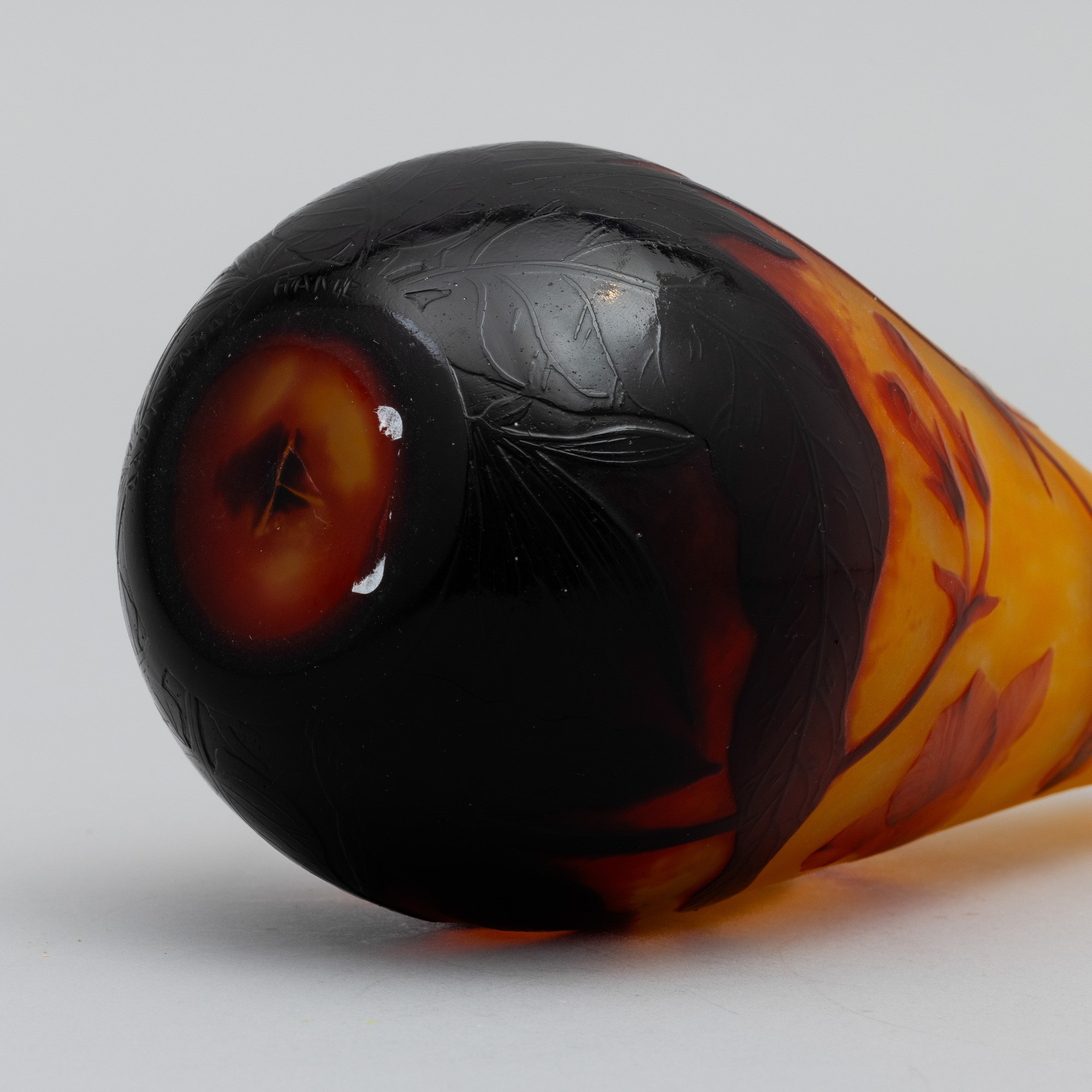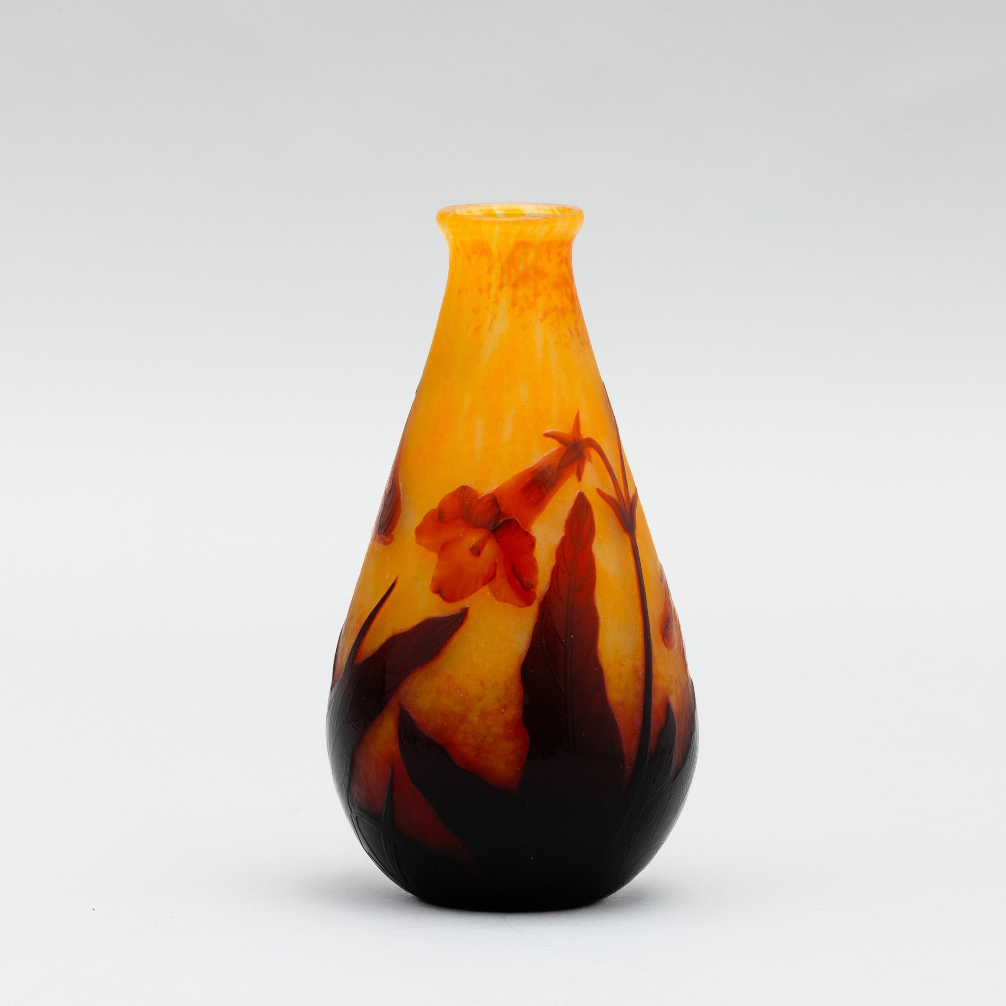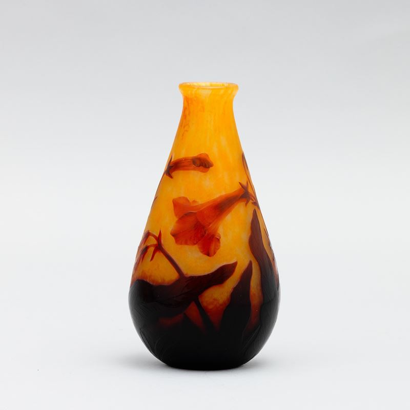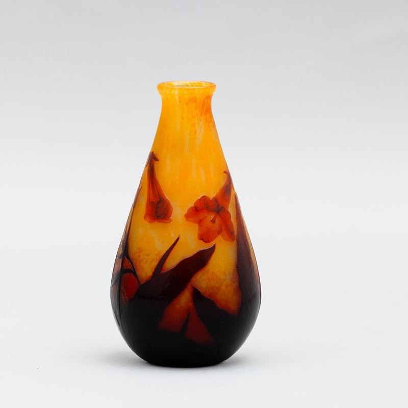 Vaso in forma di goccia in vetro soffiato con decoro di campanule a cammeo.
