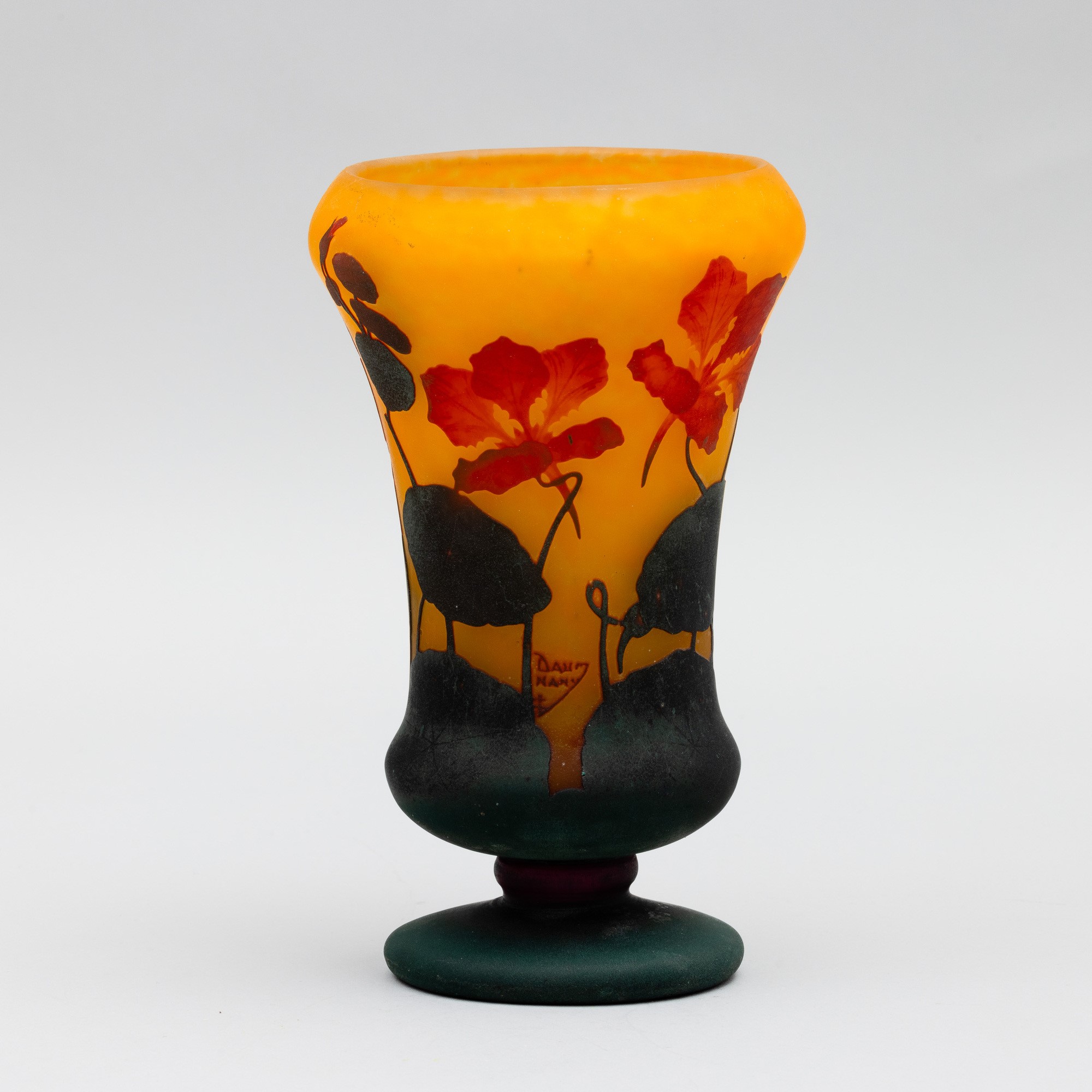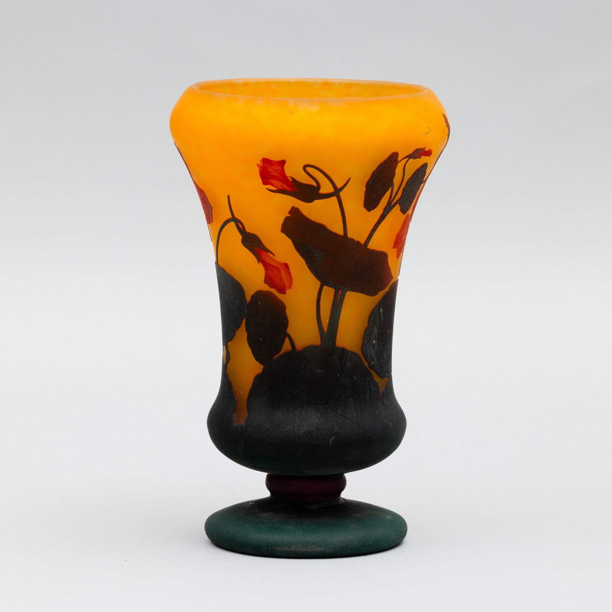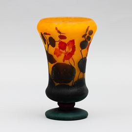 Vaso a cratere in vetro soffiato con decoro di nasturzi a cammeo.
