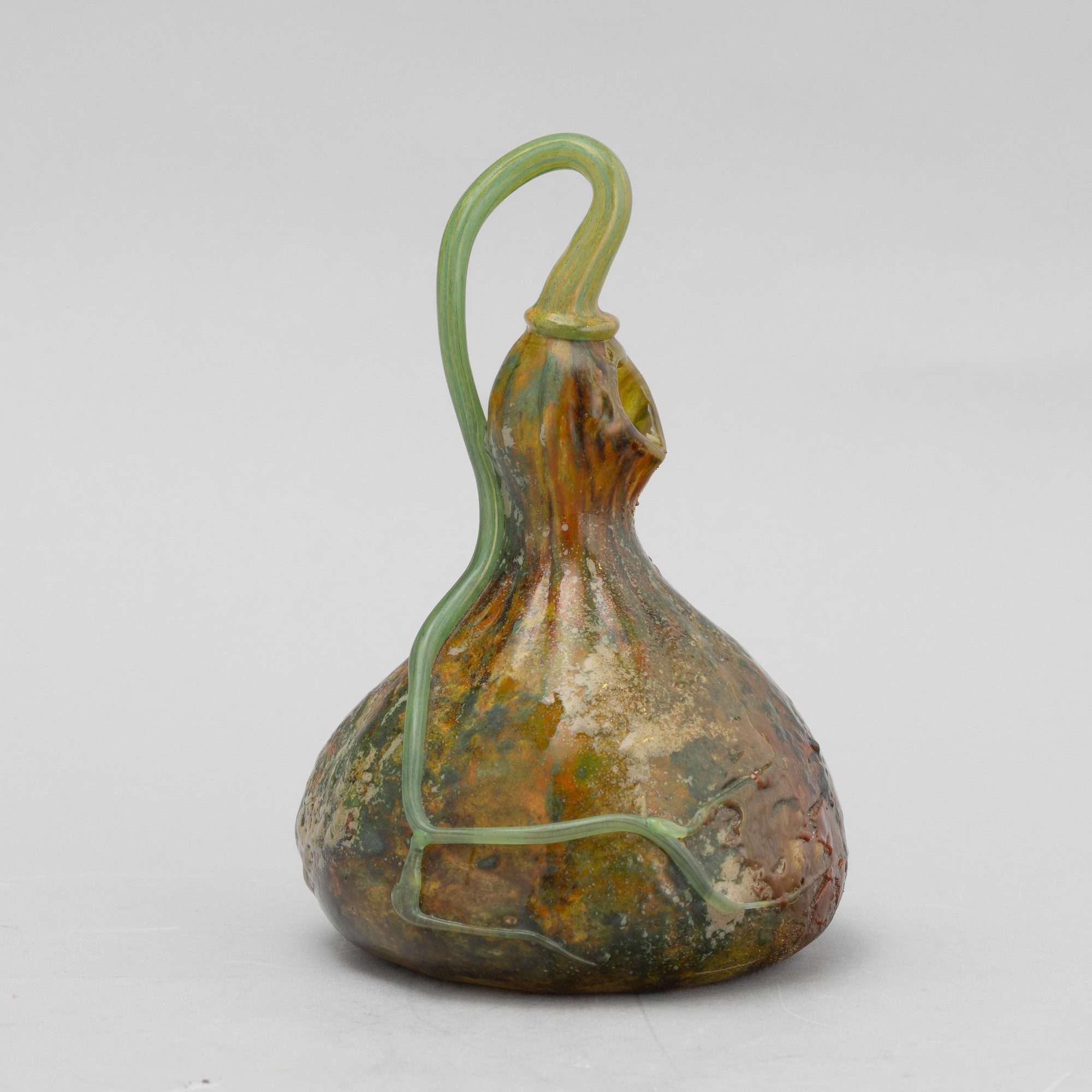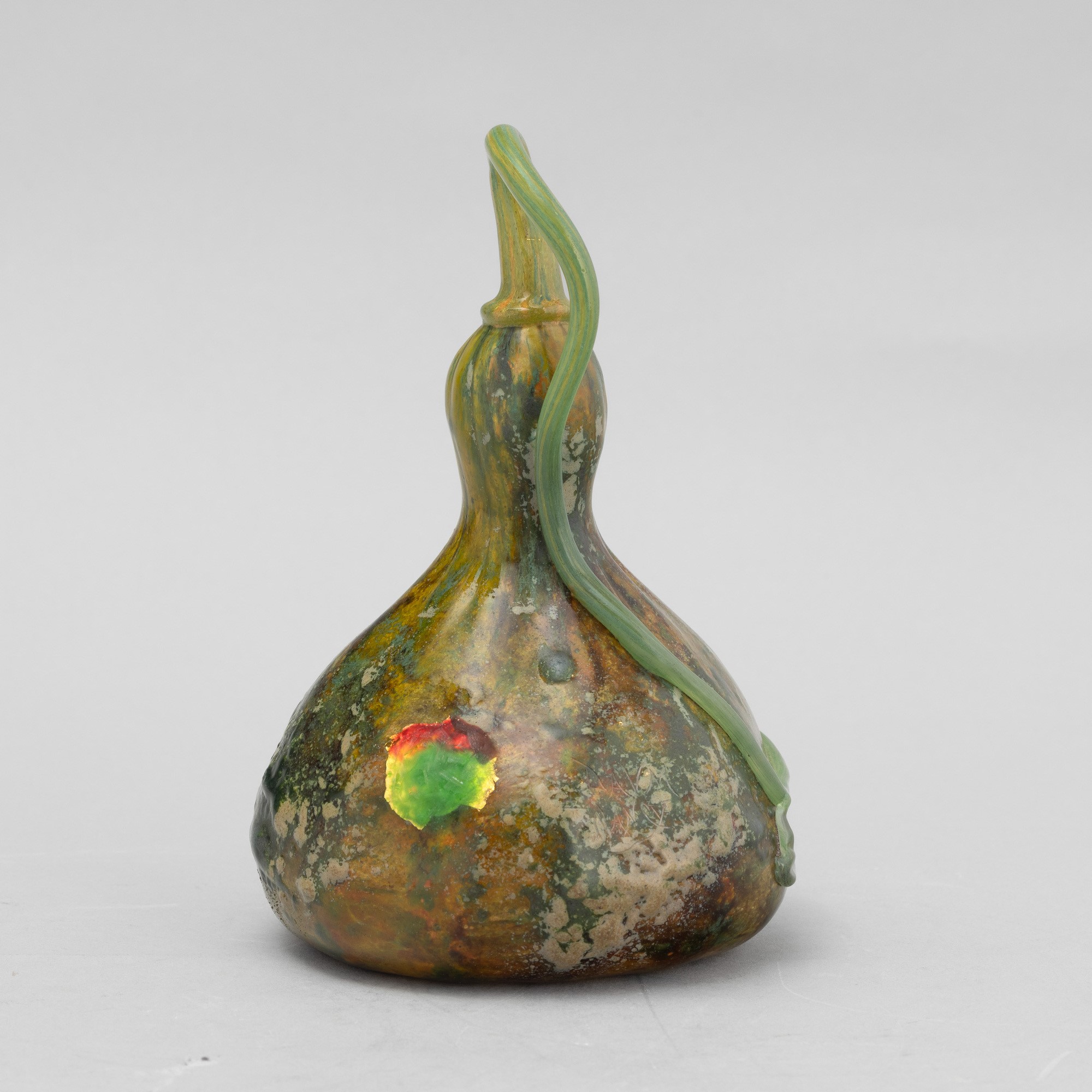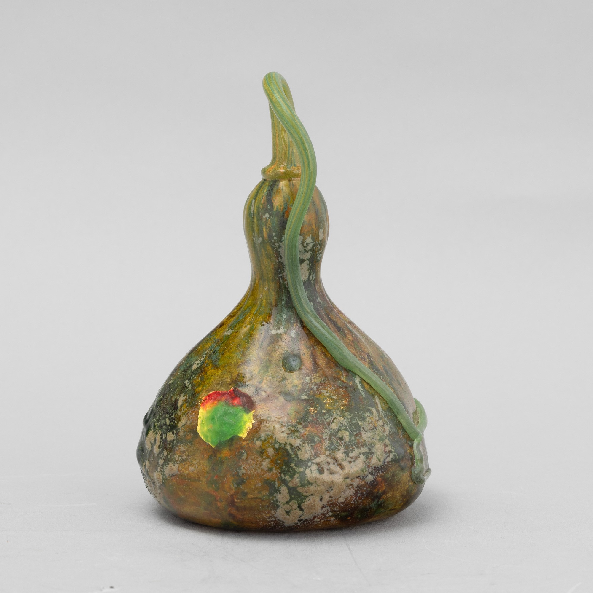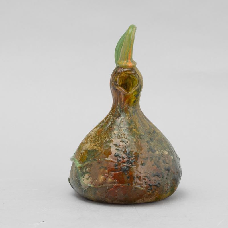 Raro vaso scultura in forma di zucca in pasta vitrea soffiata policroma con lungo picciolo applicato e bocca asimmetrica.
