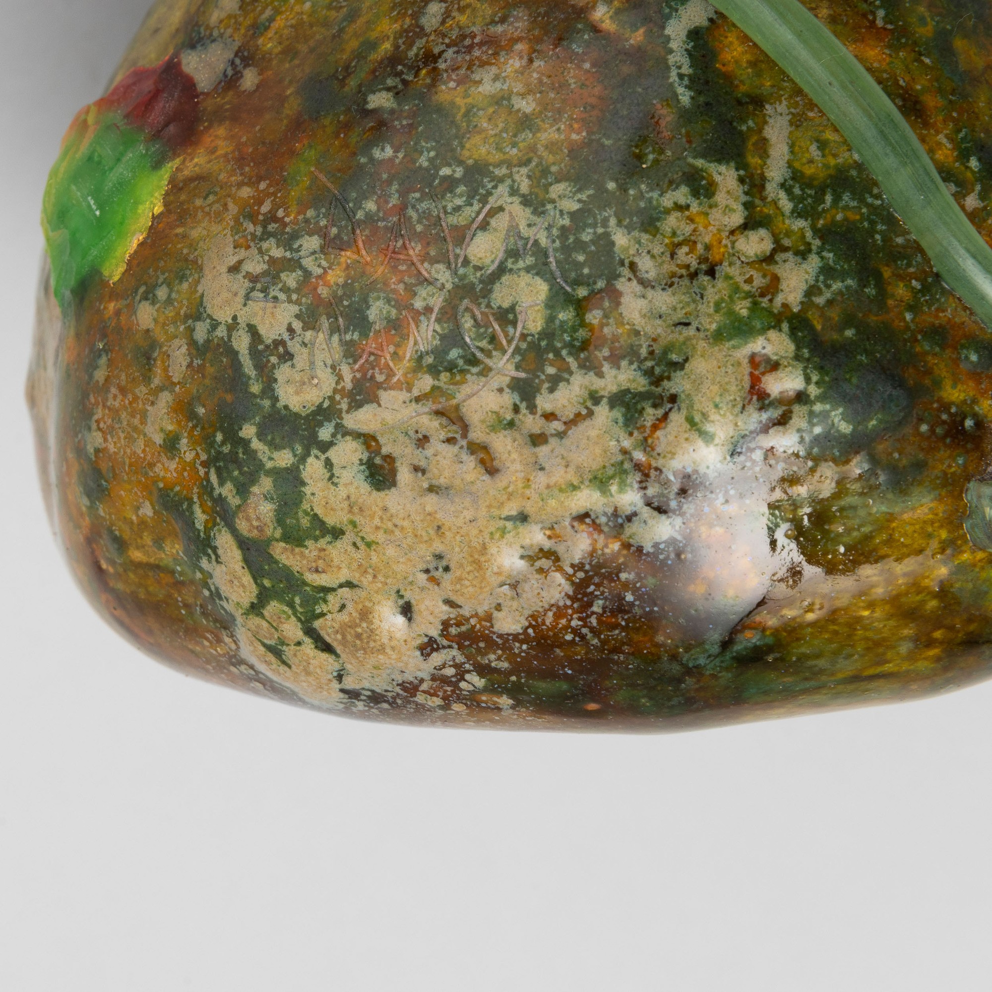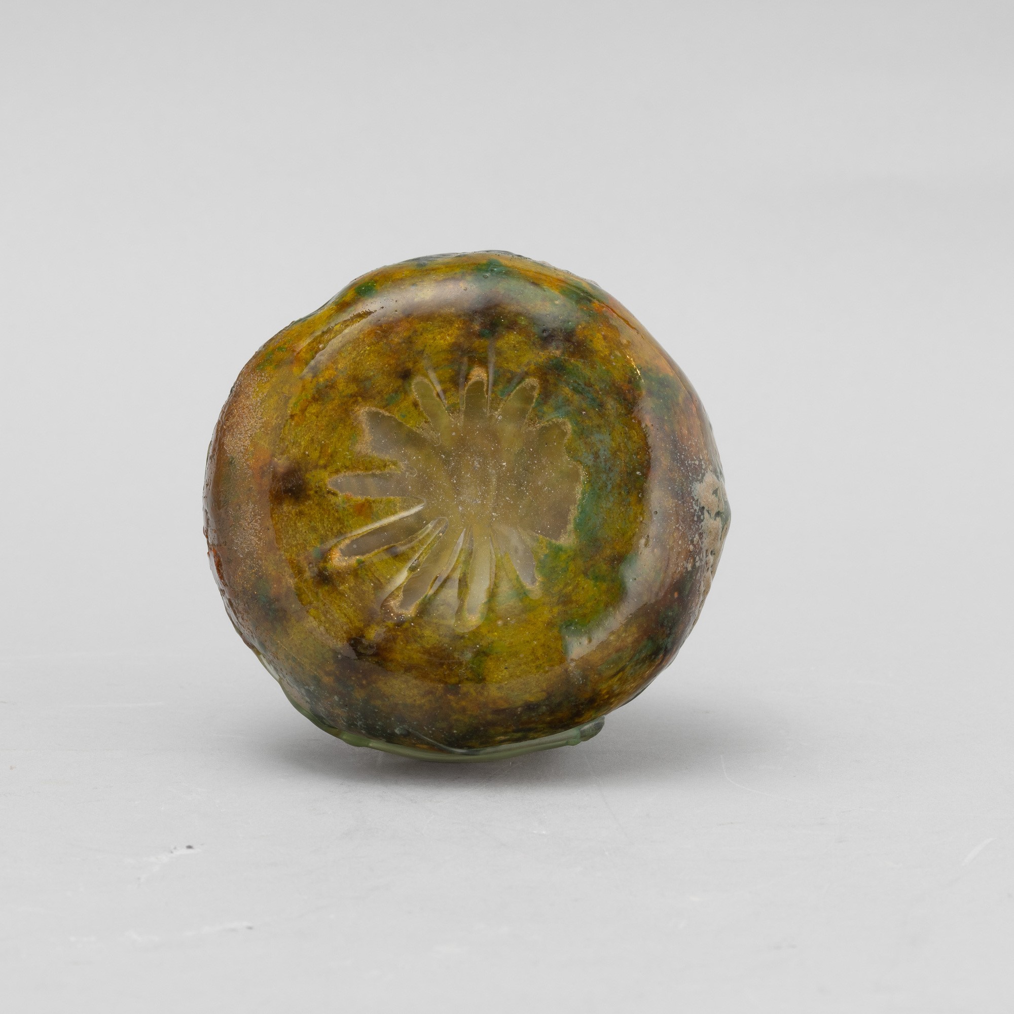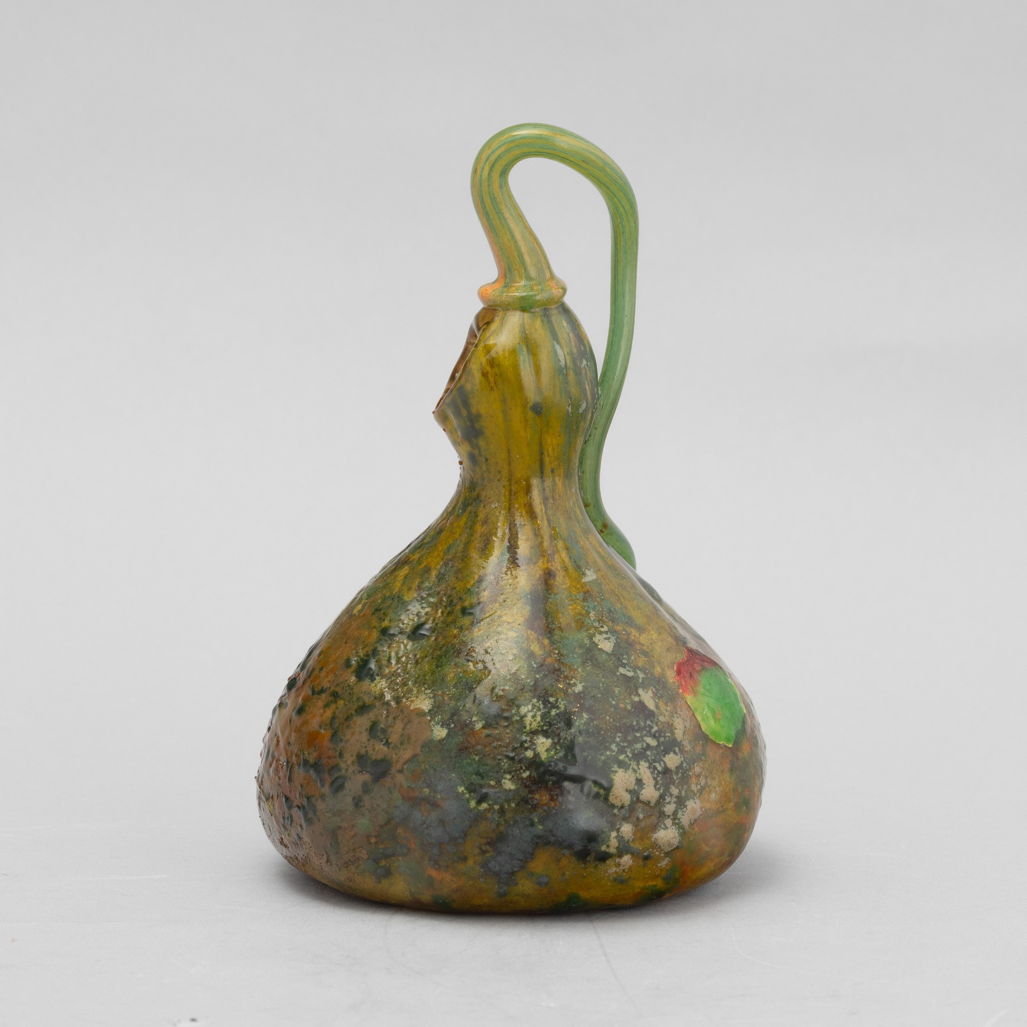 Raro vaso scultura in forma di zucca in pasta vitrea soffiata policroma con lungo picciolo applicato e bocca asimmetrica.
