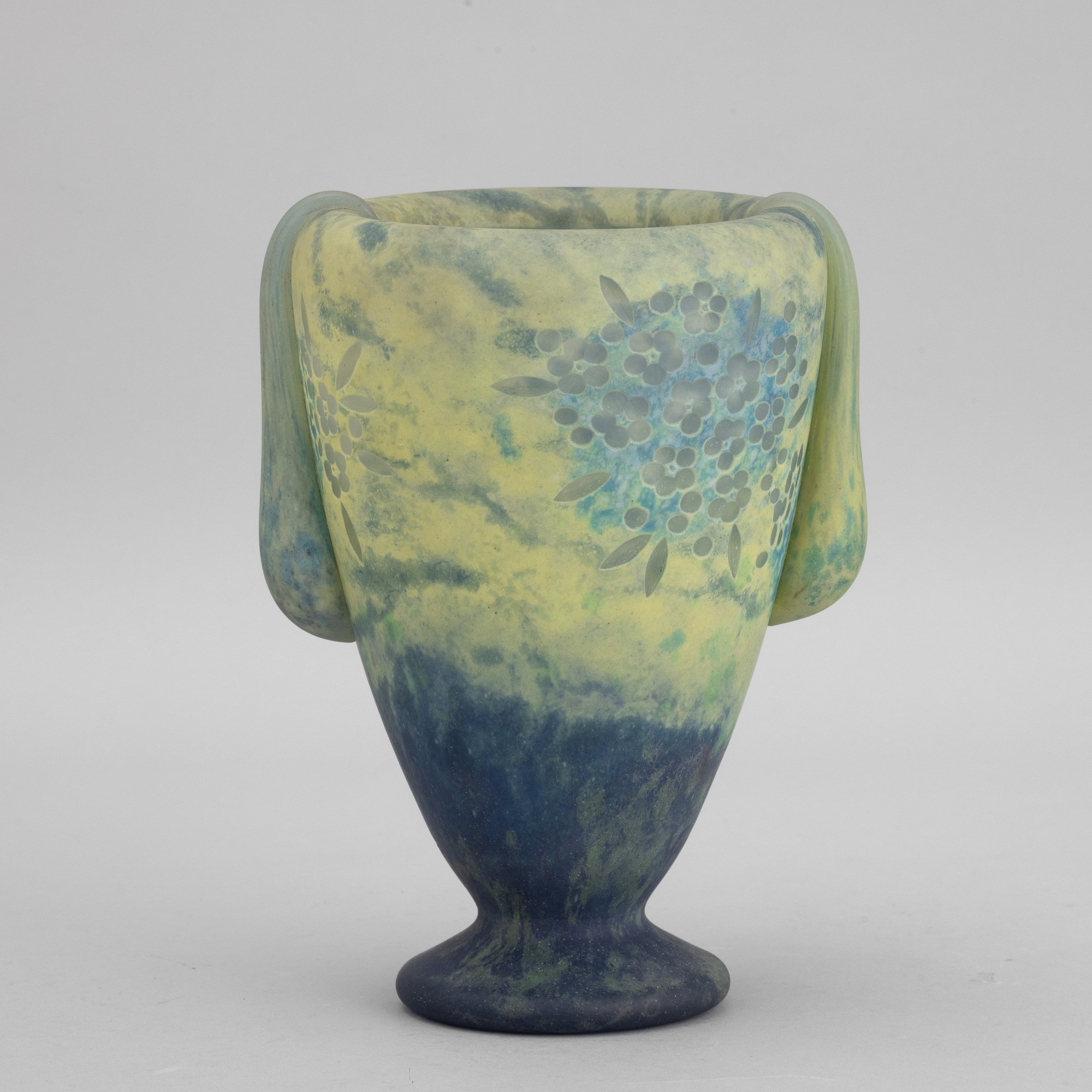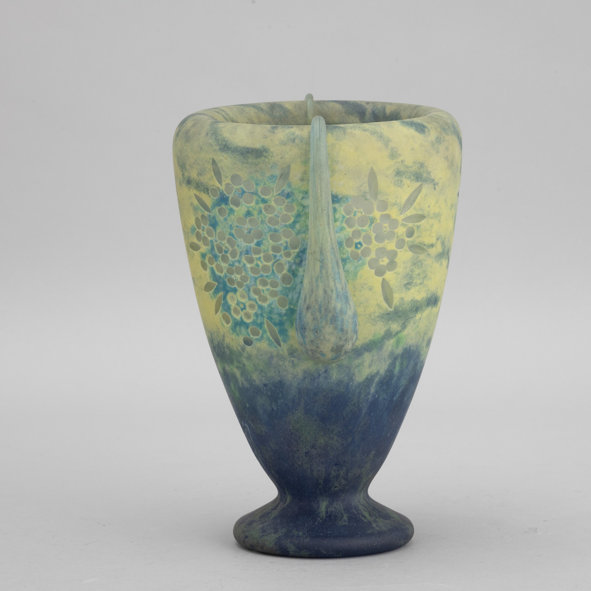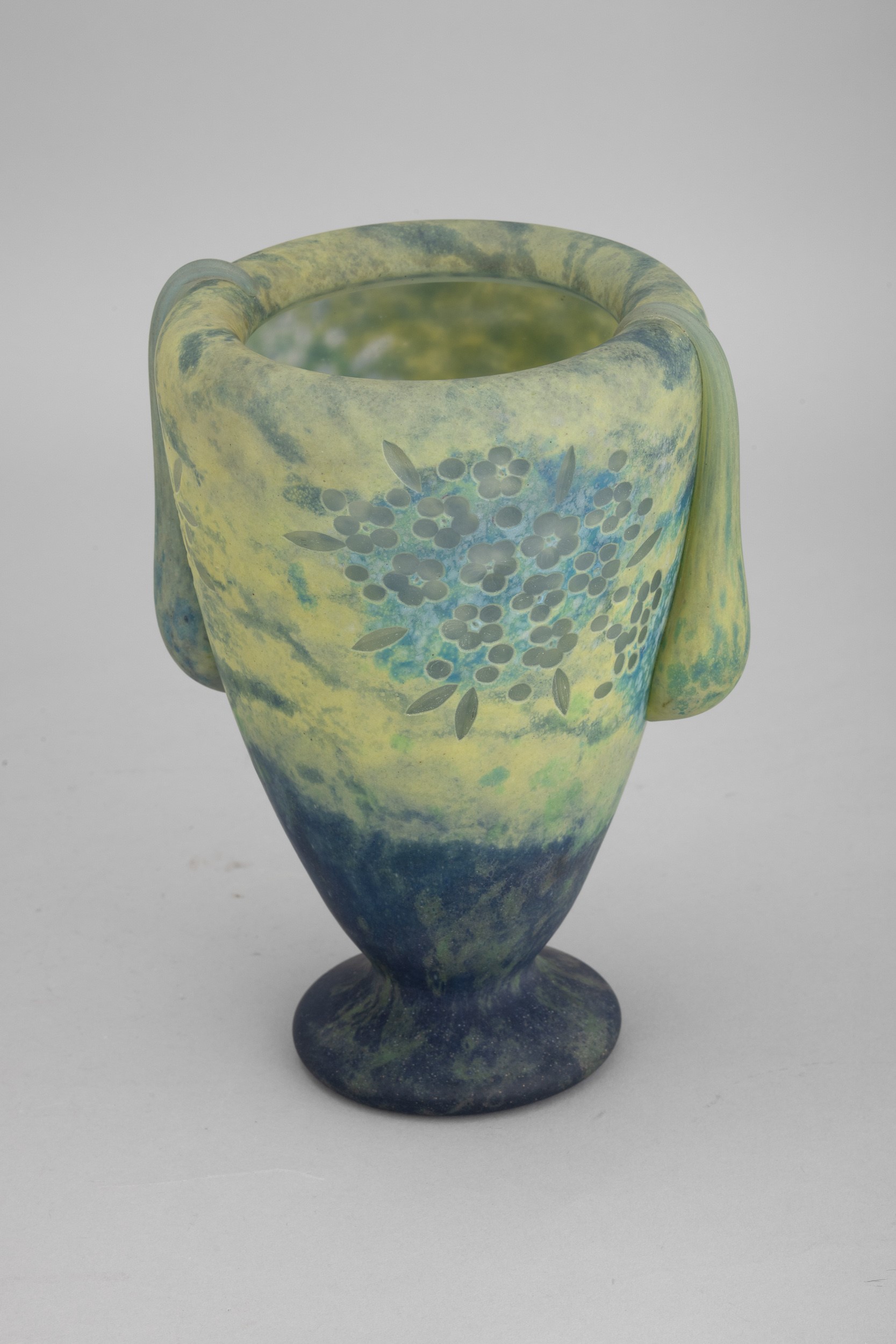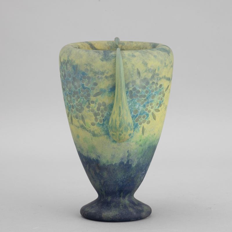 Raro vaso in pasta vitrea policroma su piede circolare e grandi gocce applicate con decoro di bouquet di fiori incisi alla mola.