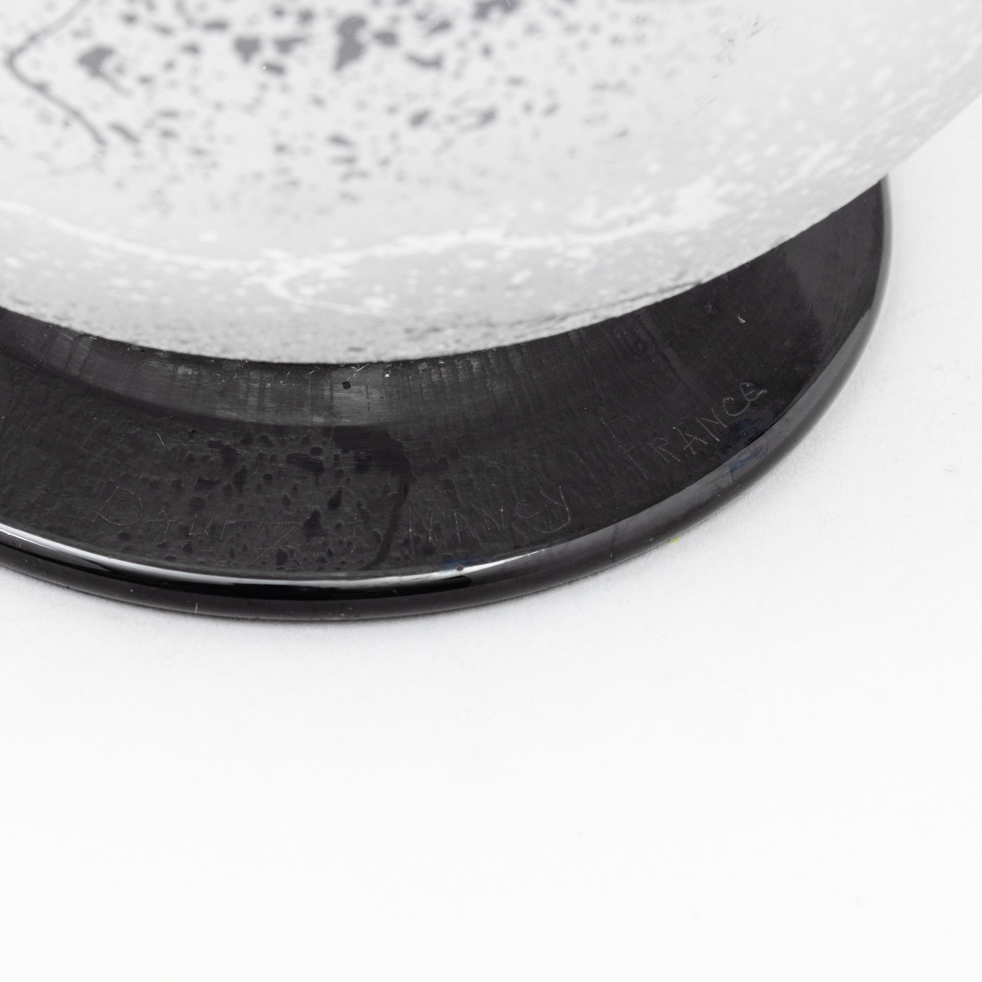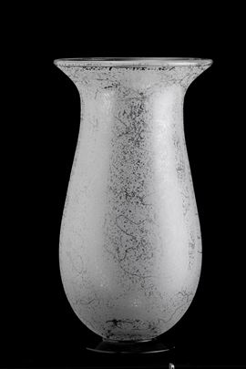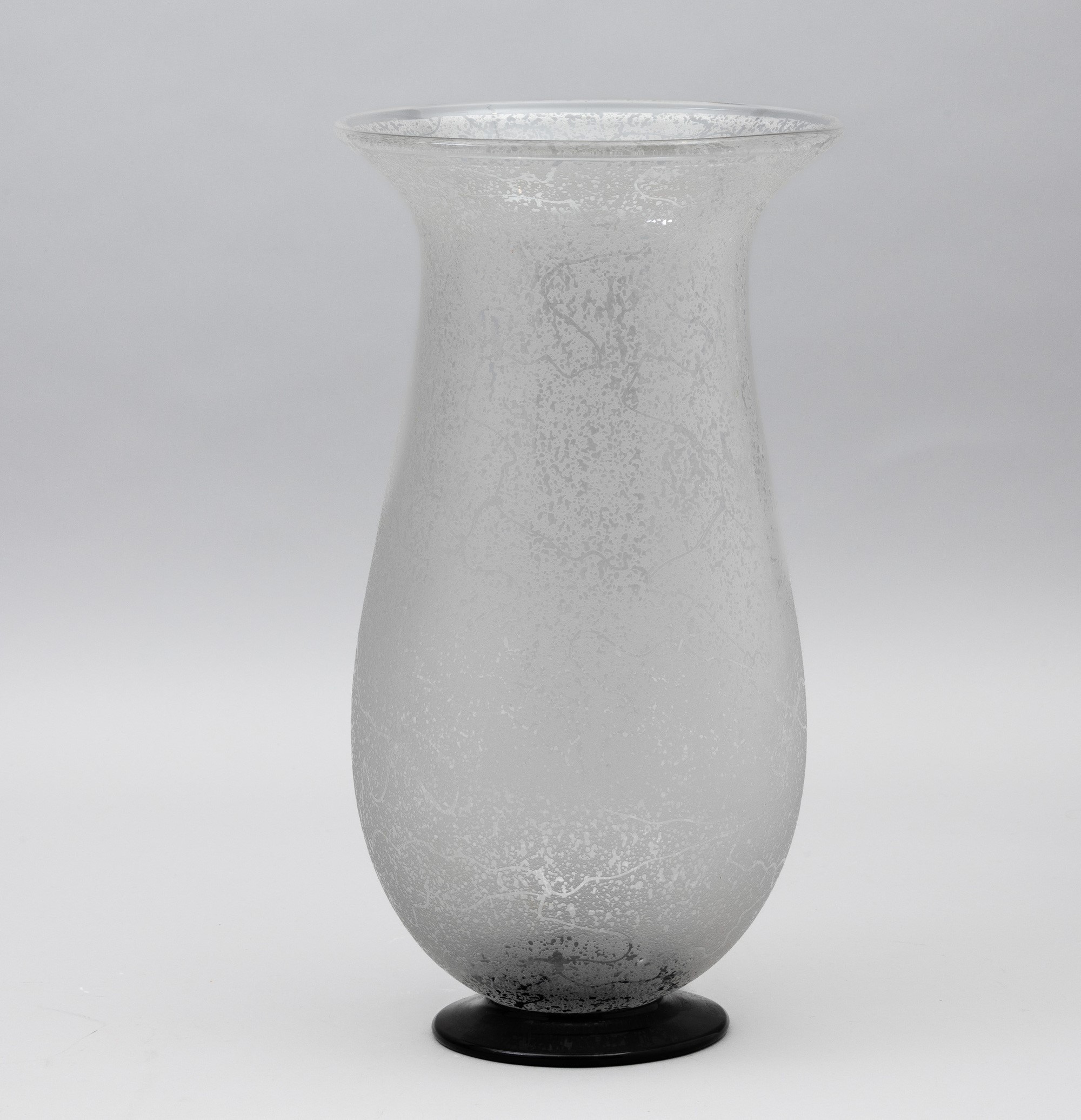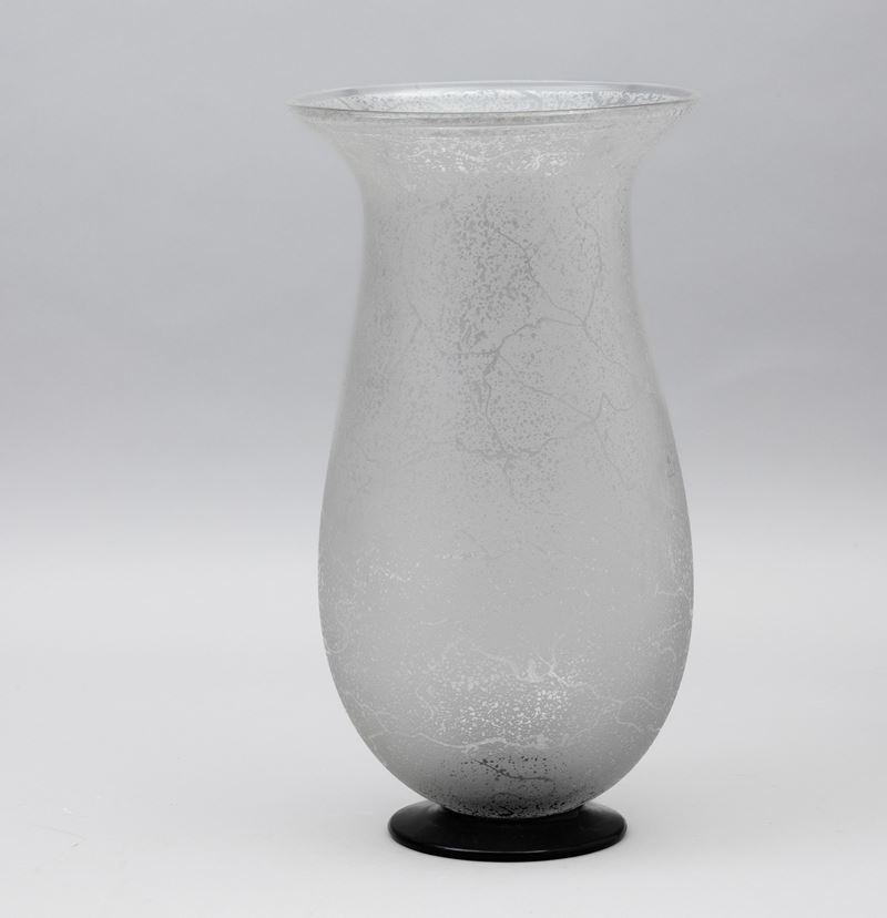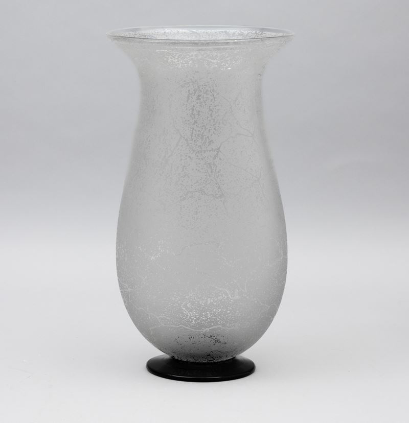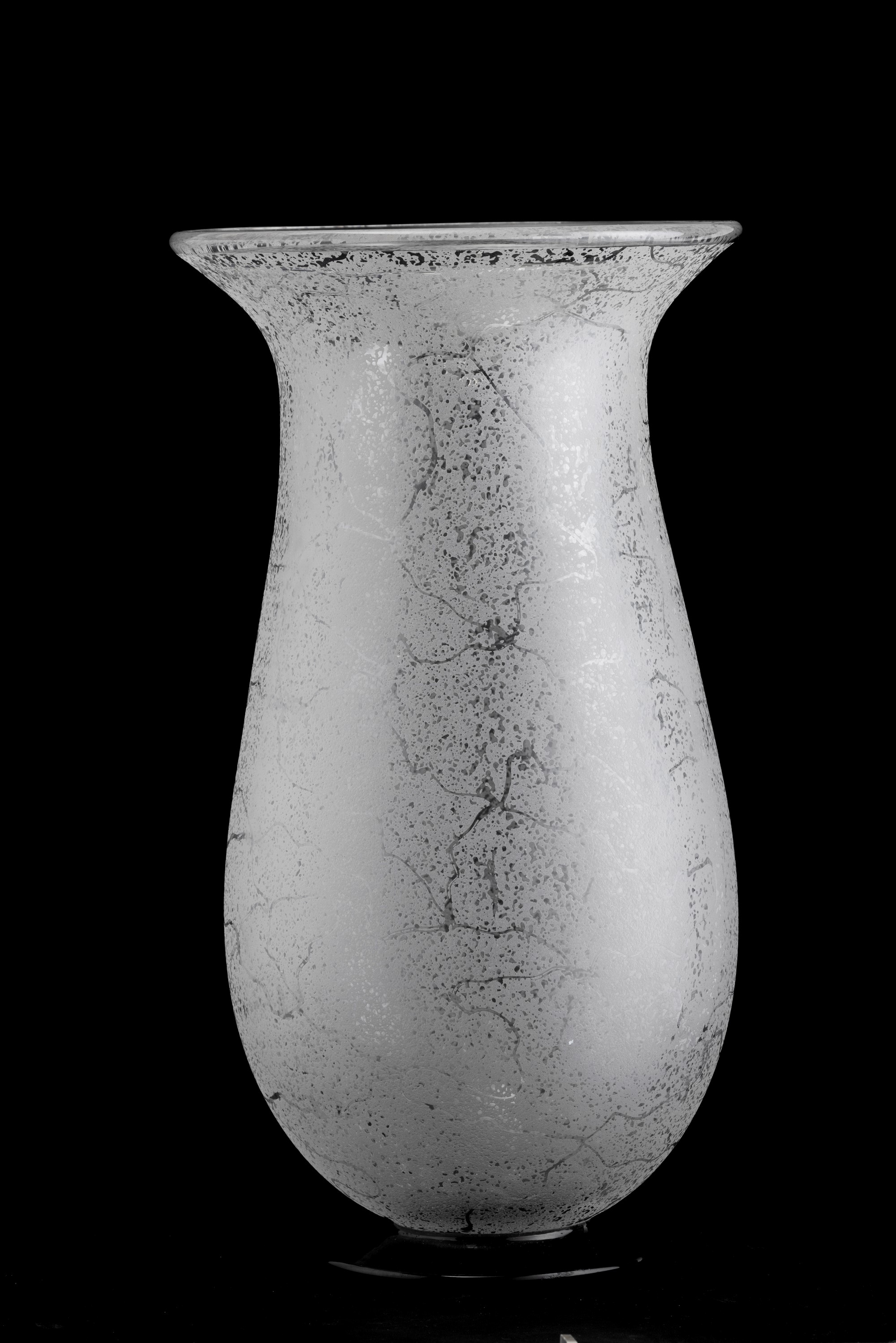 Grande vaso a balaustro in cristallo soffiato con superficie interamente acidata. Piede circolare in pasta vitrea nera.