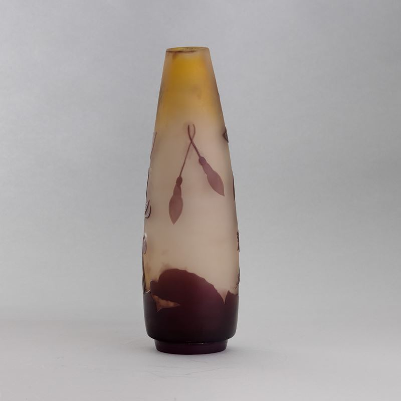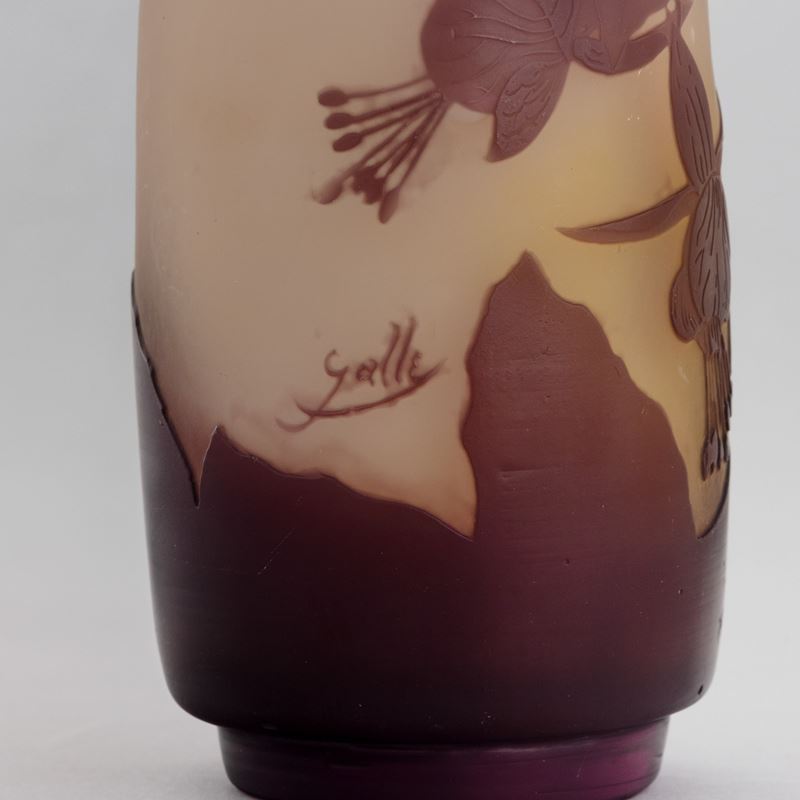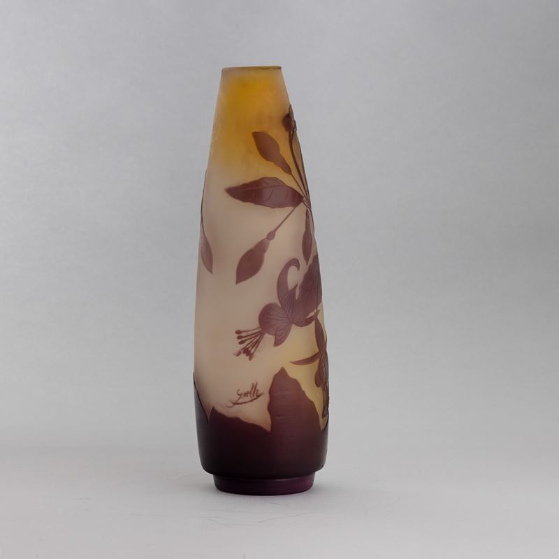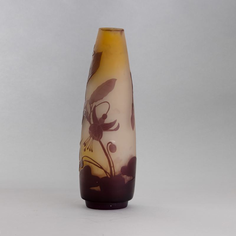 Vaso a goccia in vetro soffiato con decoro di fucsie a cammeo.