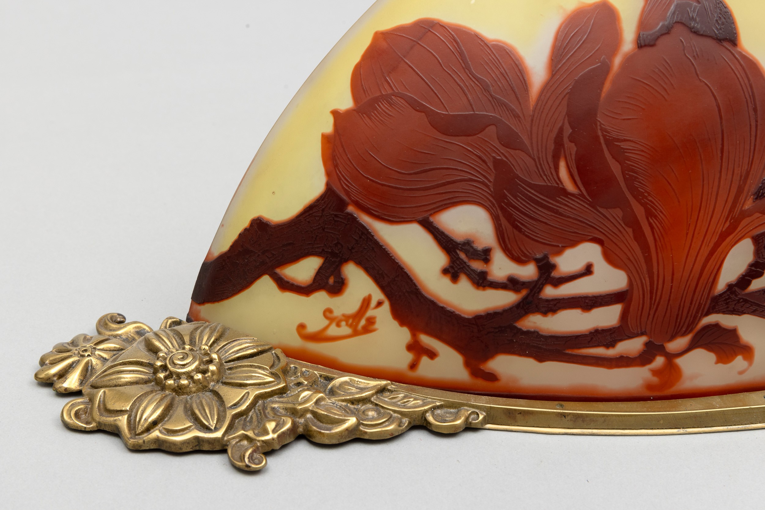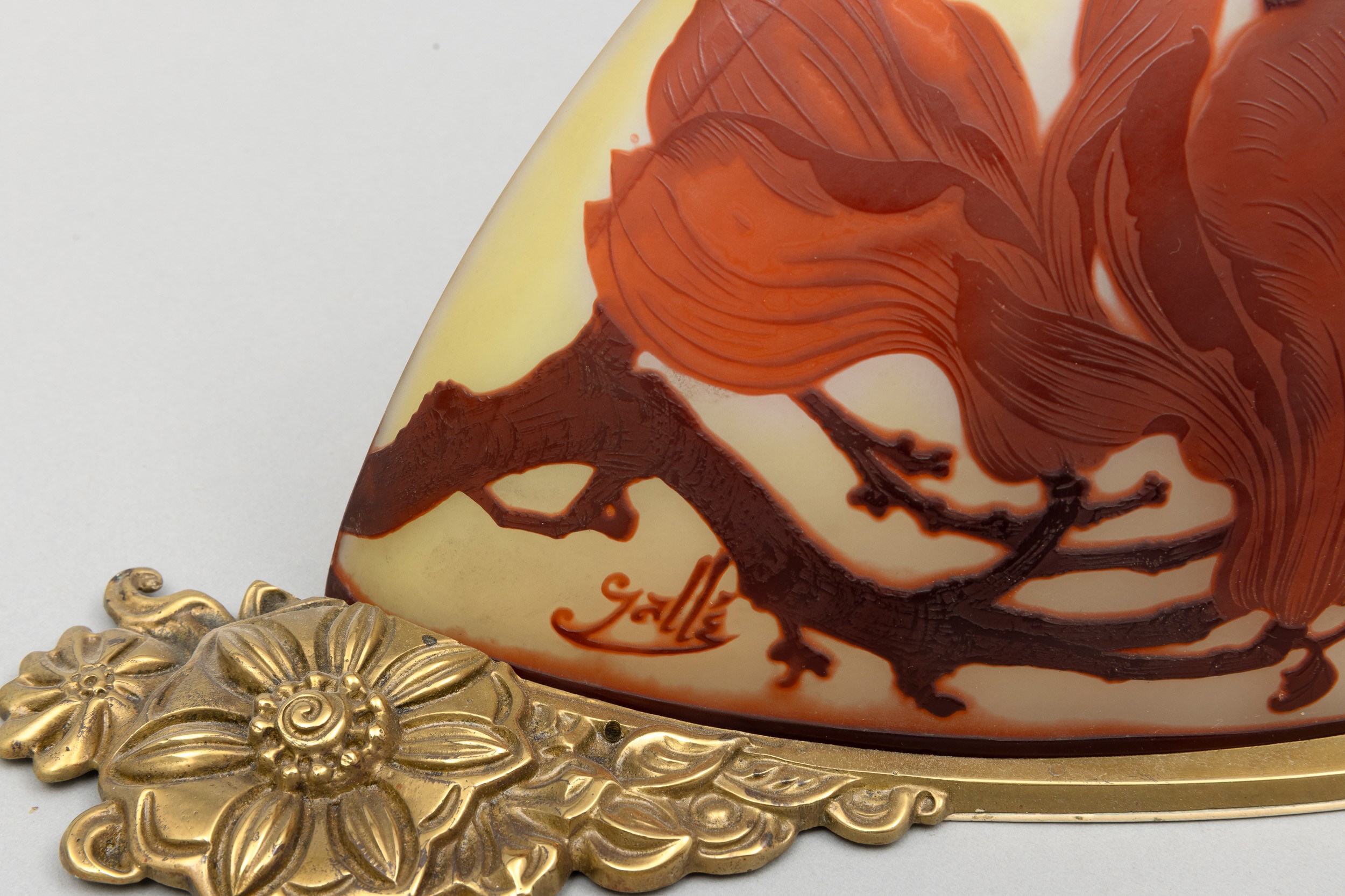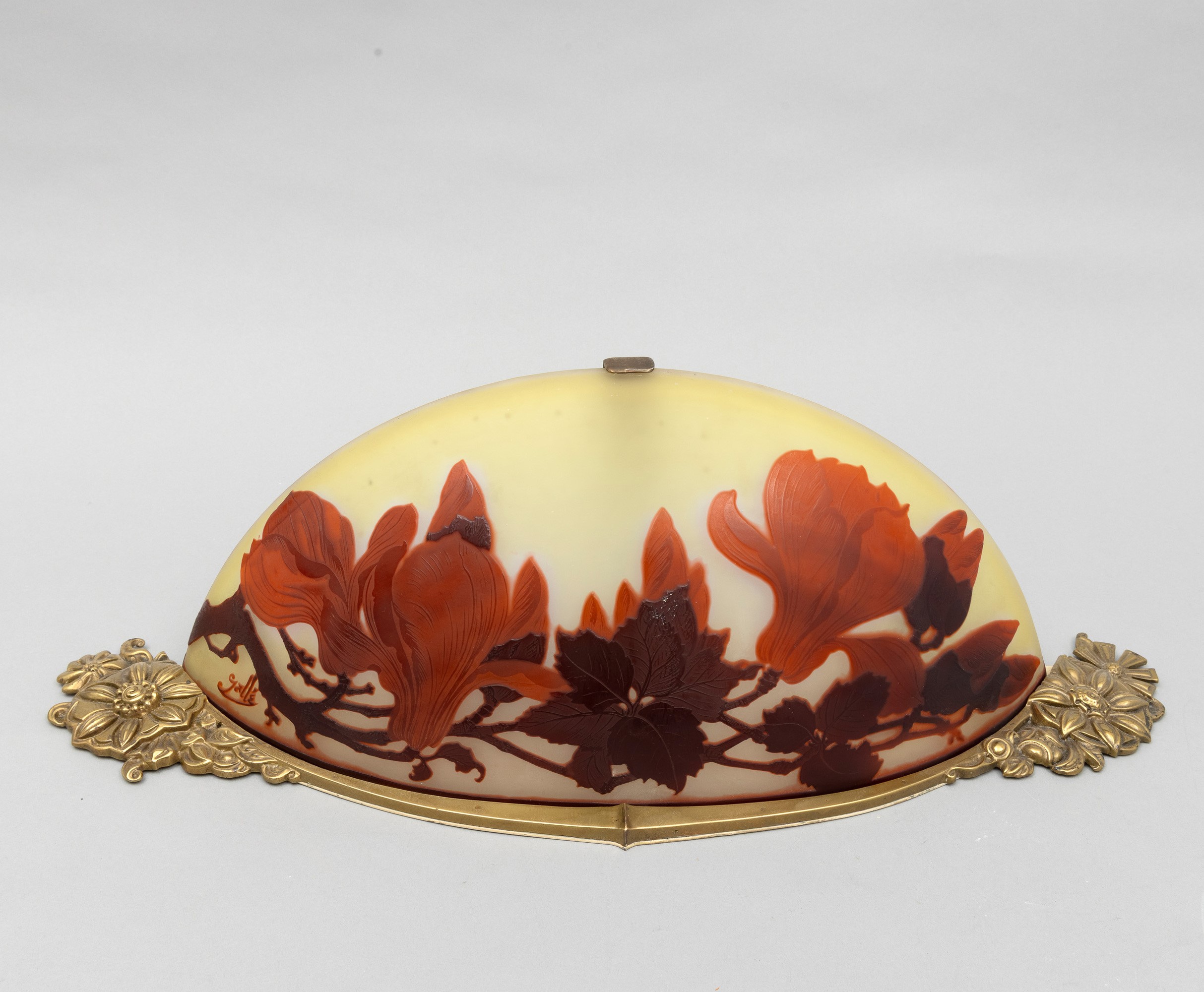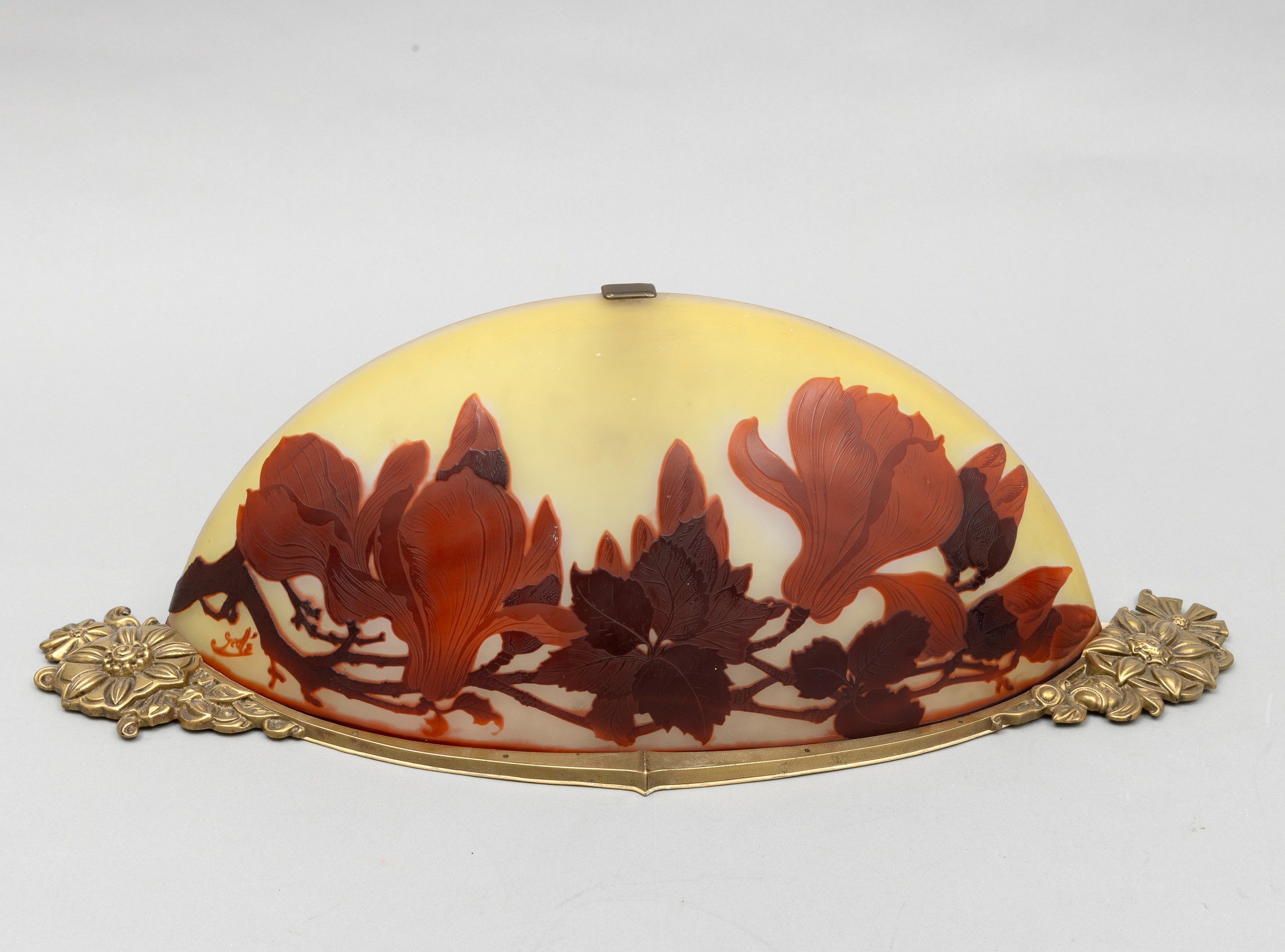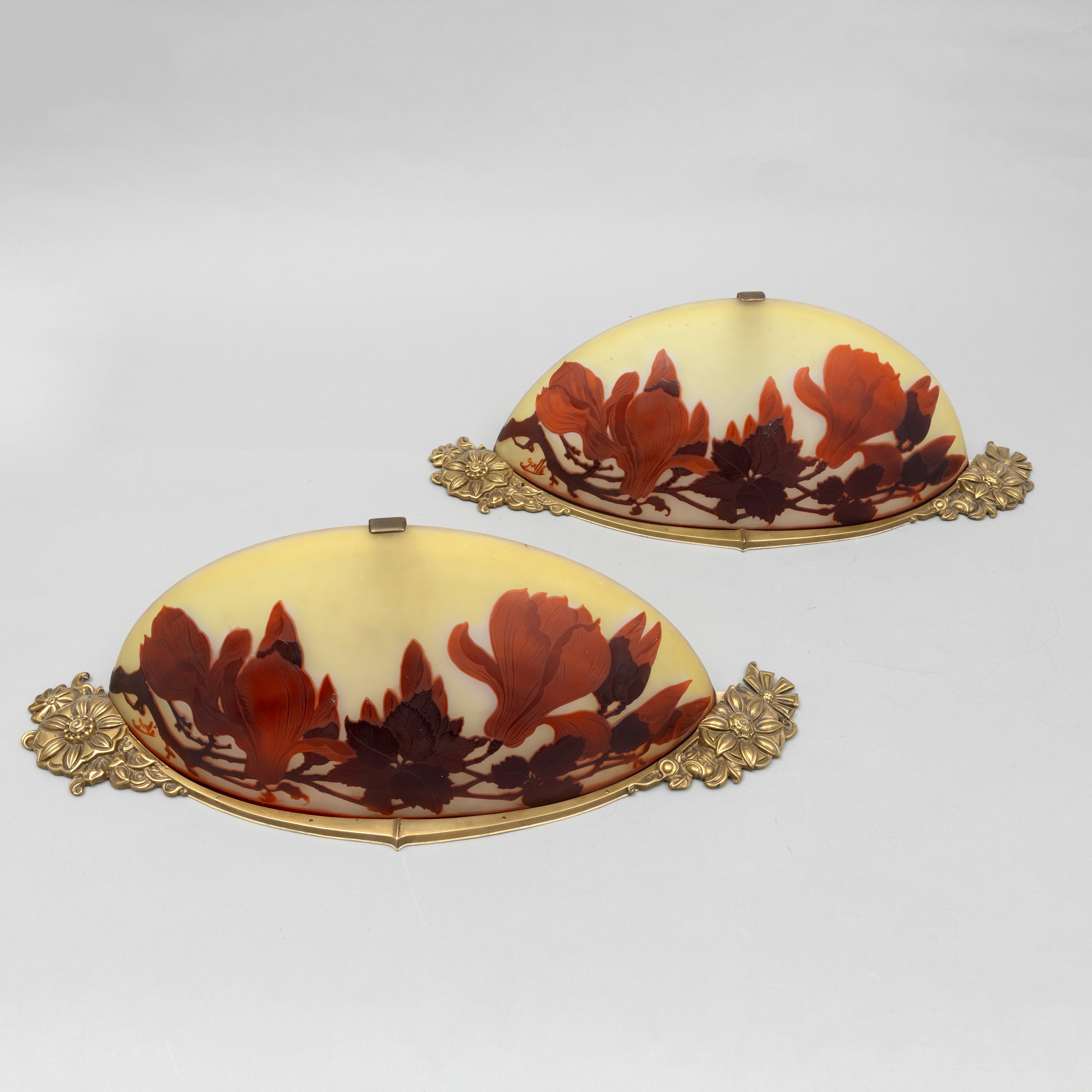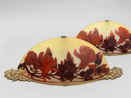 Coppia di appliques in ottone lavorato con diffusori in vetro soffiato a mezzaluna a decoro floreale a cammeo.