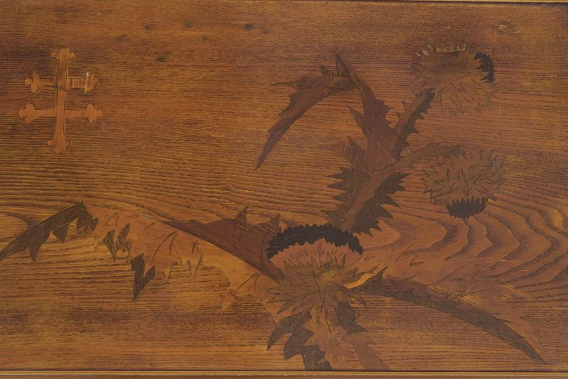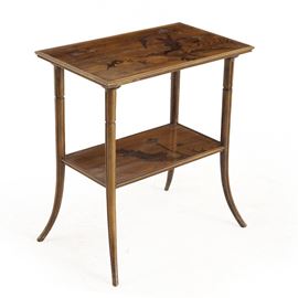 Tavolino a doppio piano rettangolare e gambe ricurve in legno con decoro floreale a intarsio e croce di Lorena.