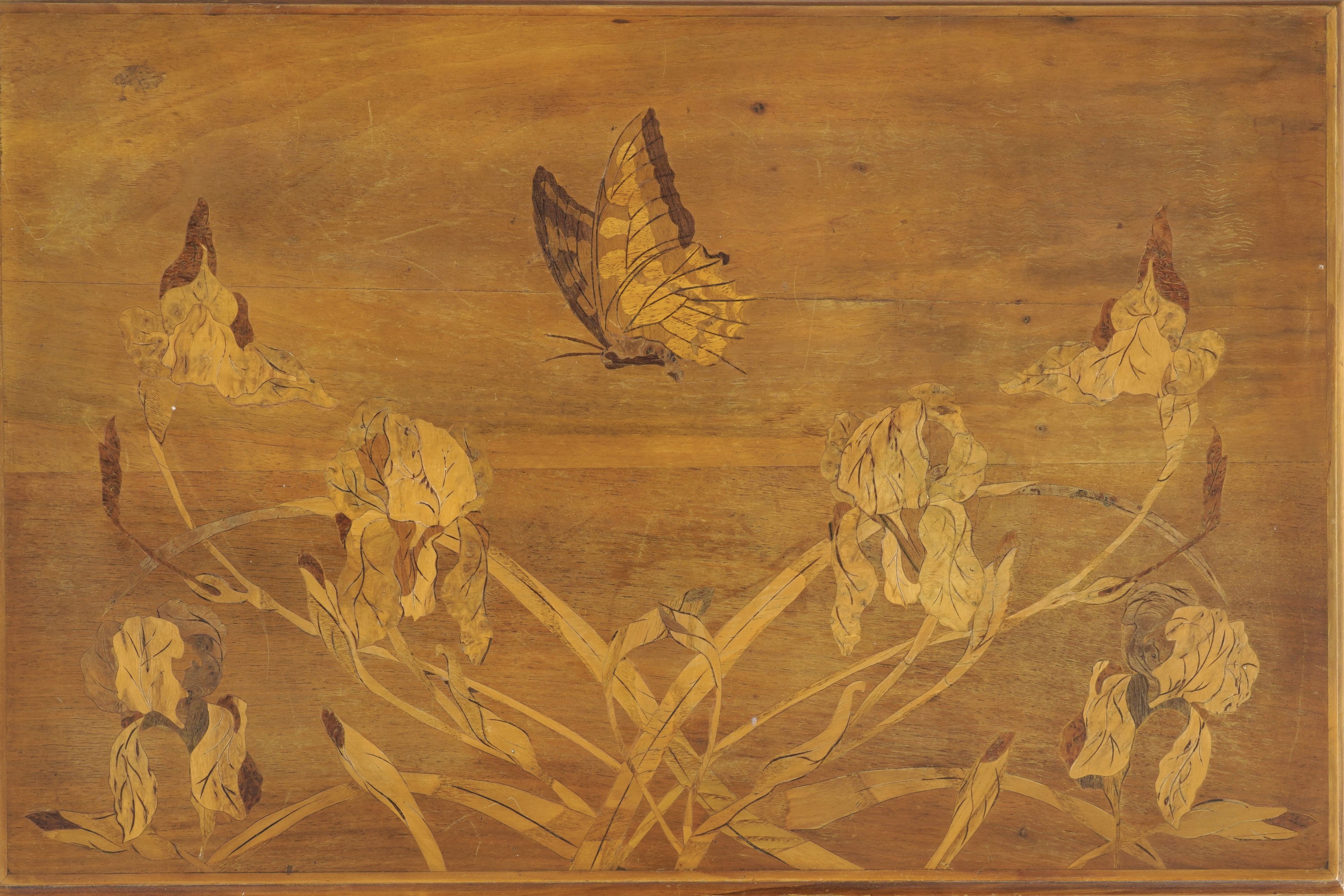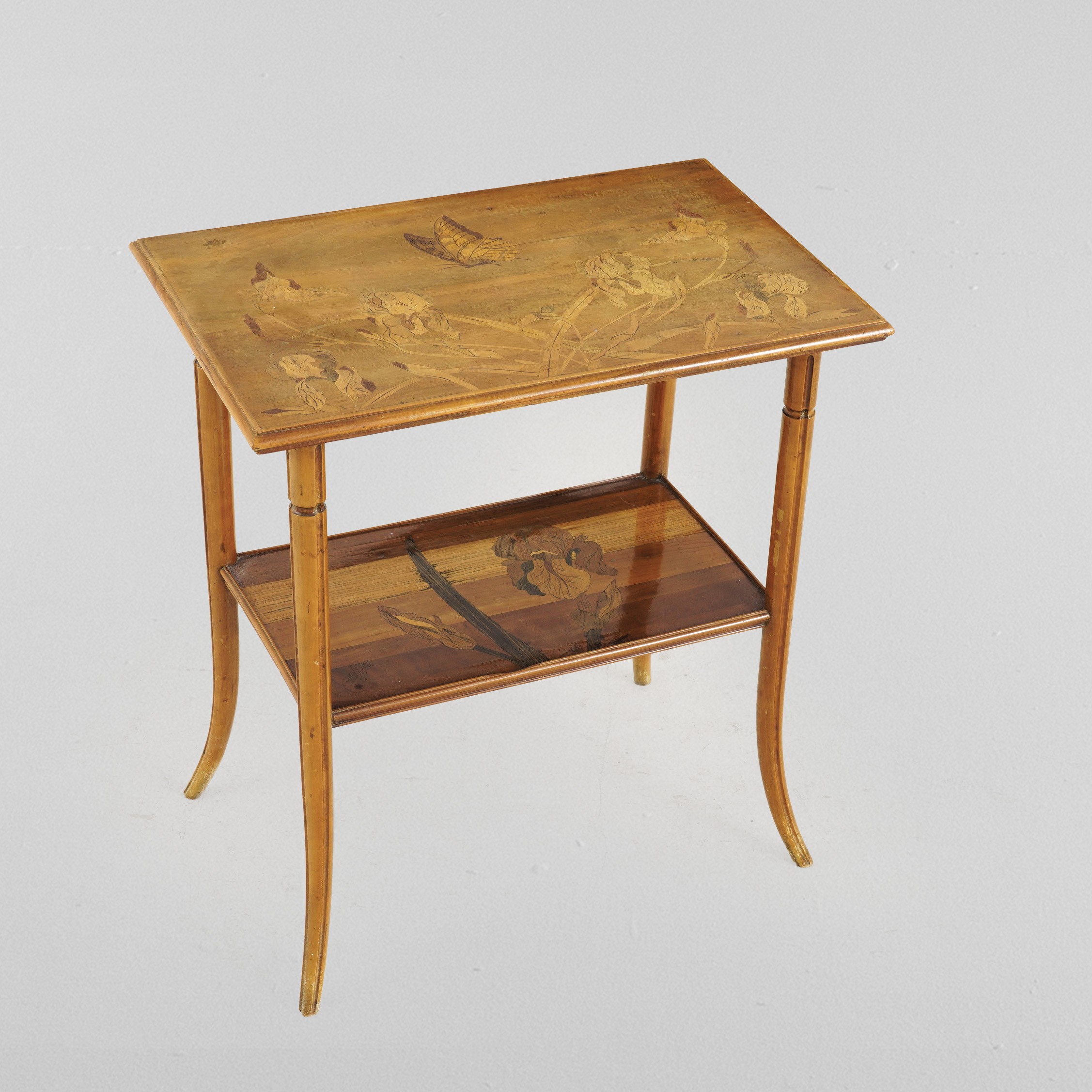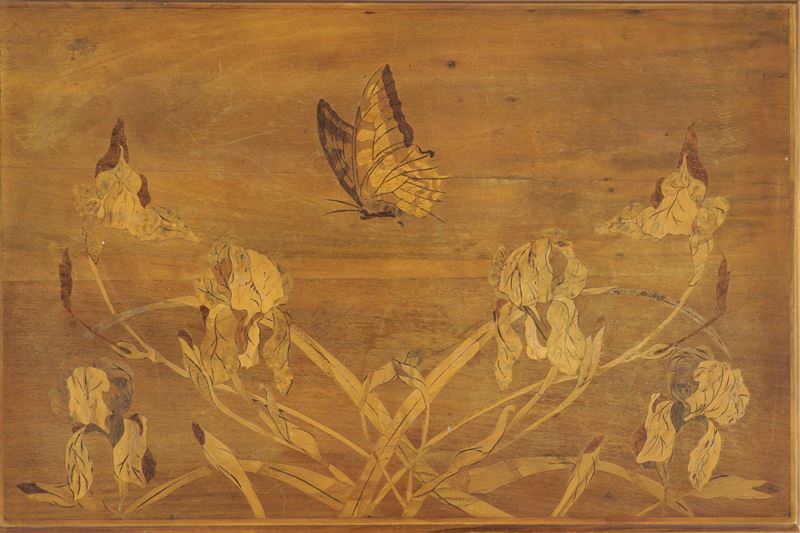 Tavolino a doppio piano rettangolare in legno con decoro a fiori e farfalle a intarsio.
