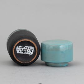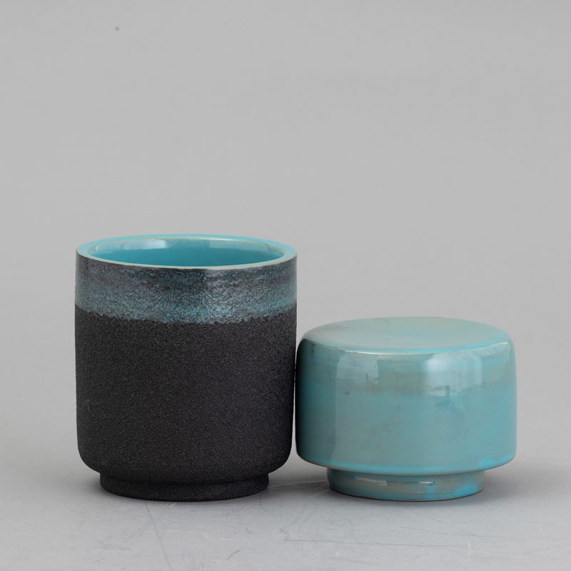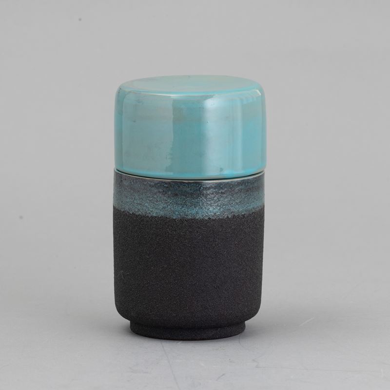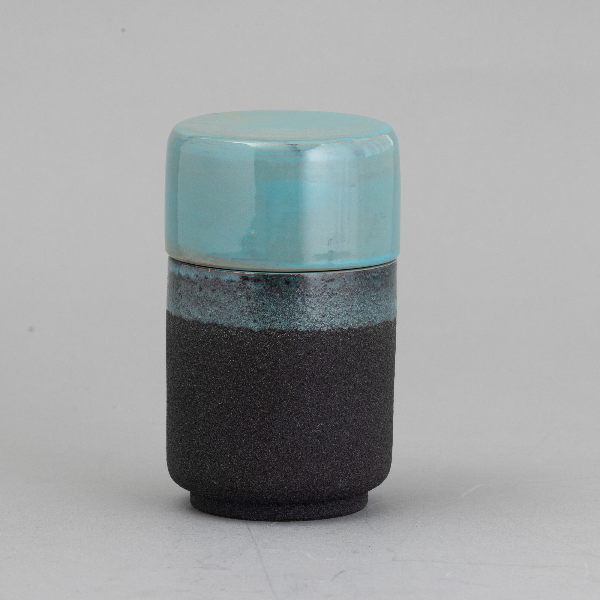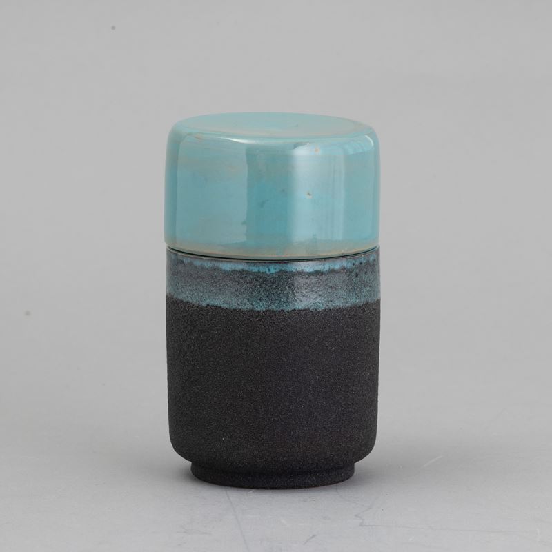 Rara scatola con coperchio in ceramica al tornio con decoro di smalto turchese lucido e superficie ruvida opaca.