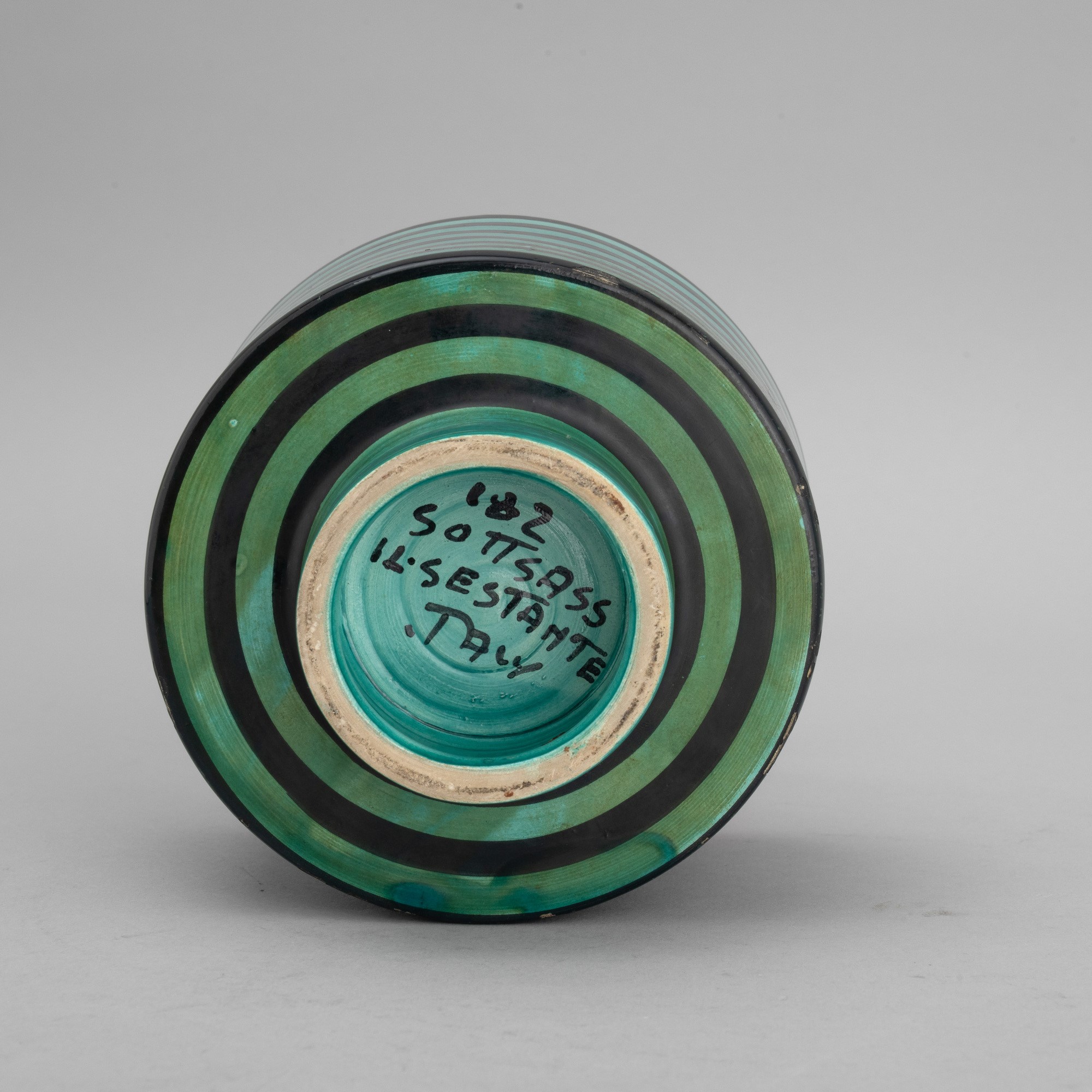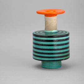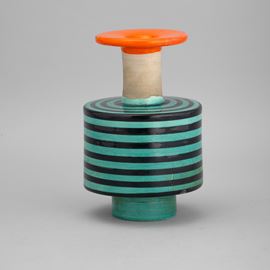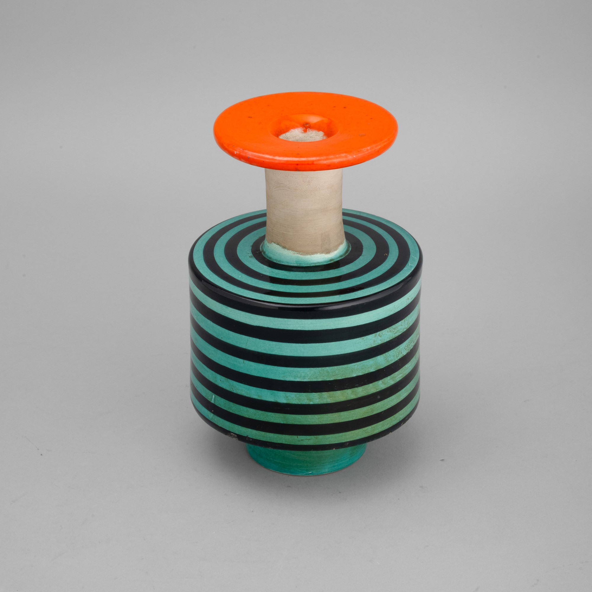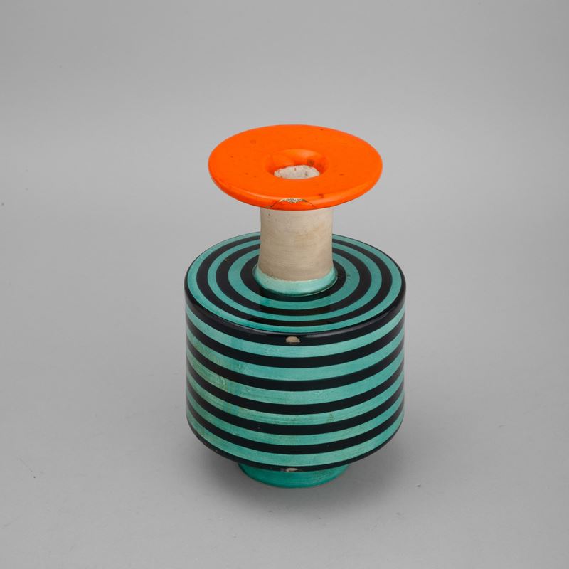 Vaso in ceramica al tornio con decoro di smalto policromo a fasce orizzontali.