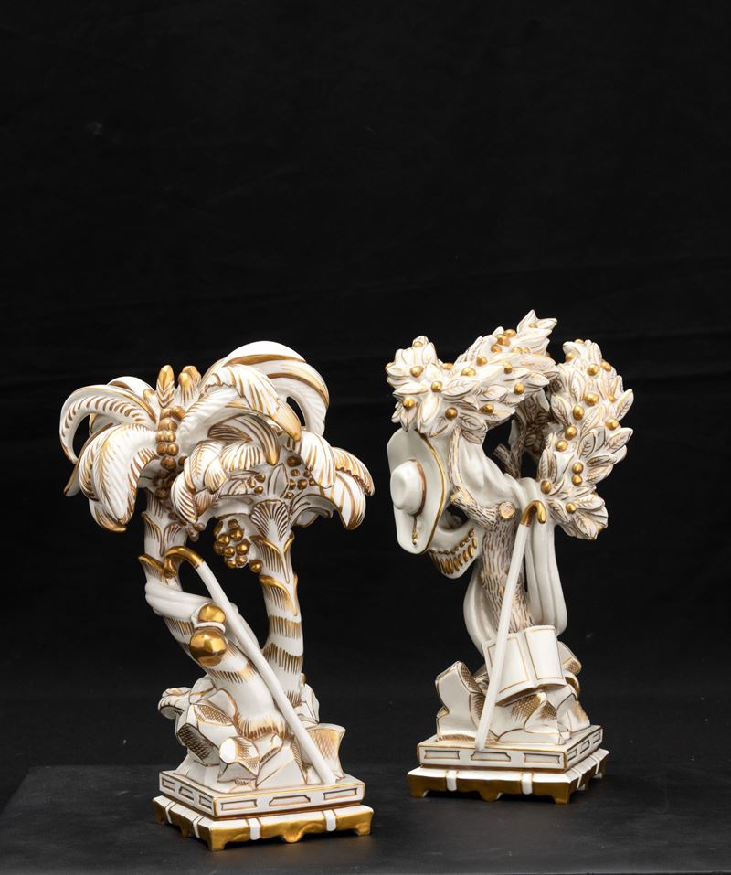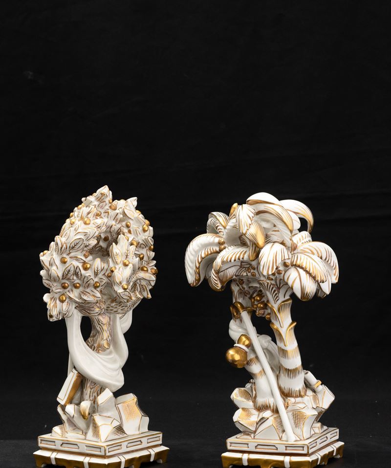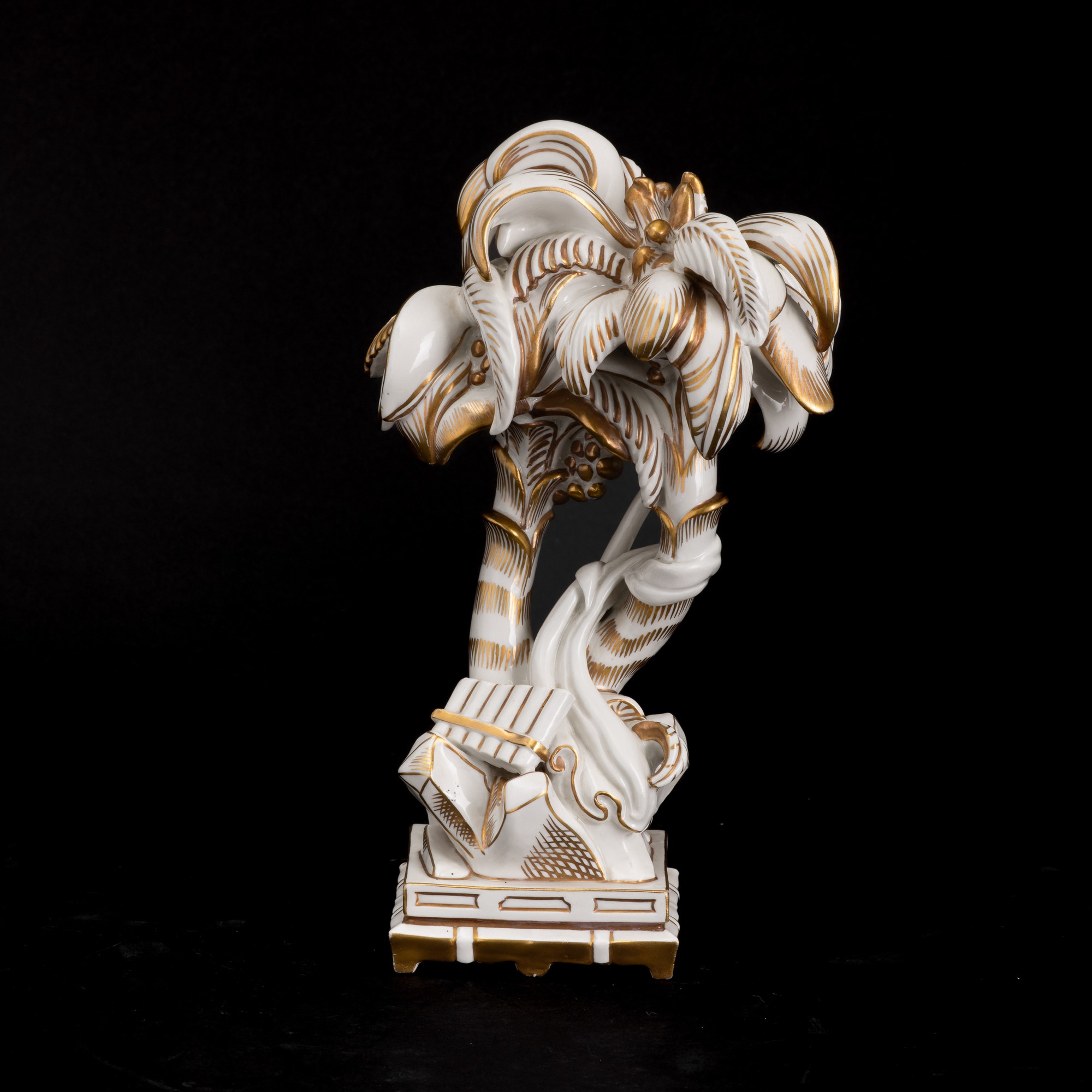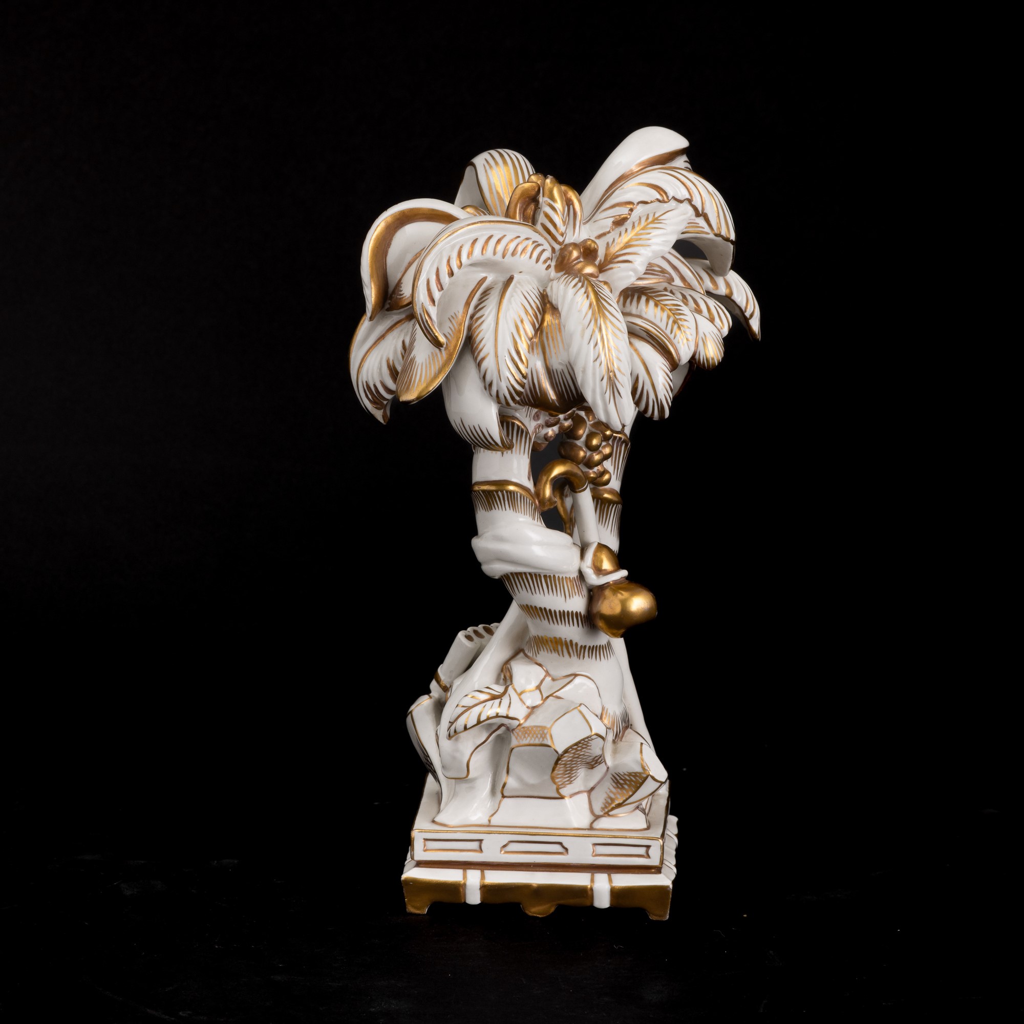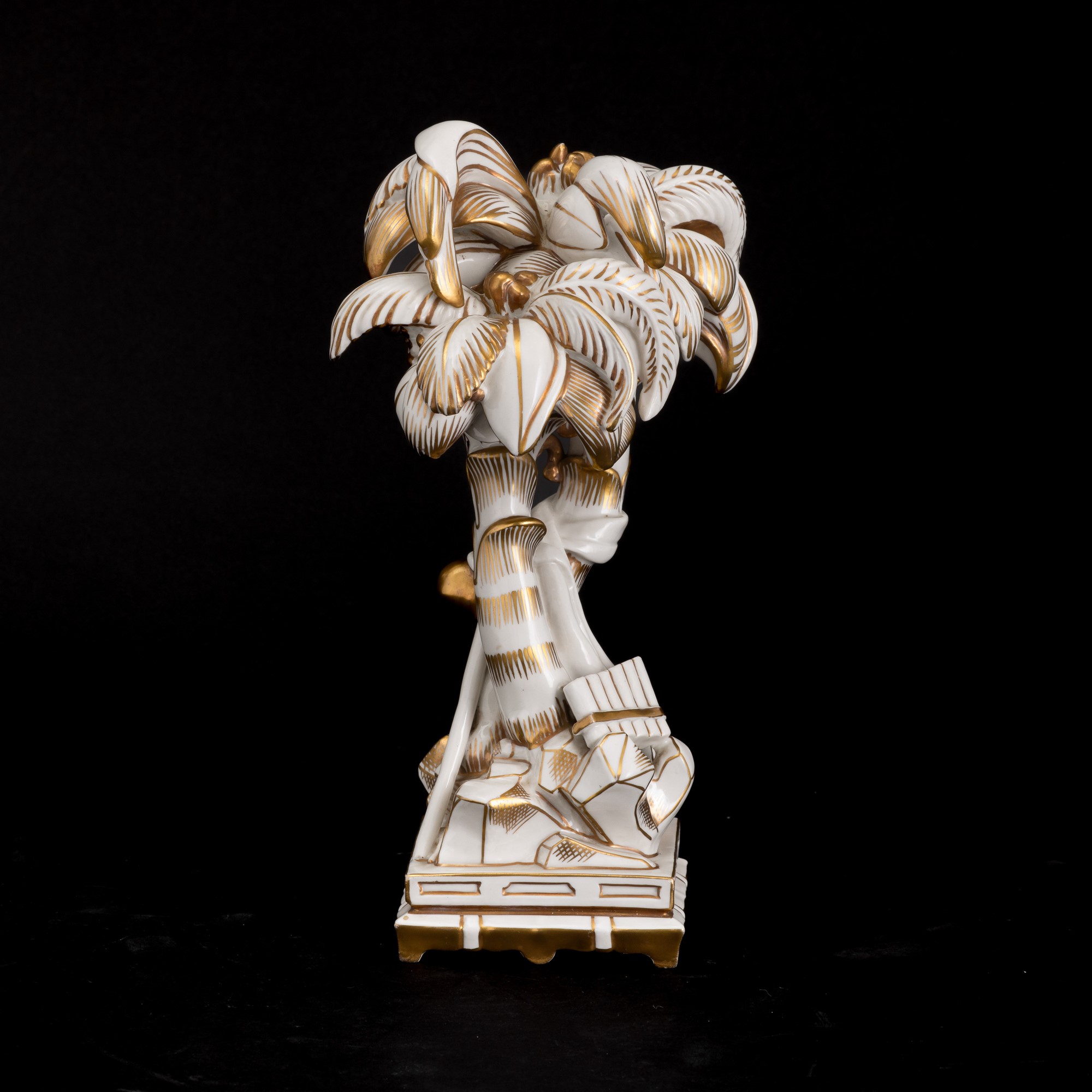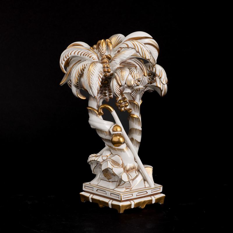 Elemento del Trionfo da tavola in porcellana con decoro in oro al terzo fuoco raffigurante palme con strumenti musicali.