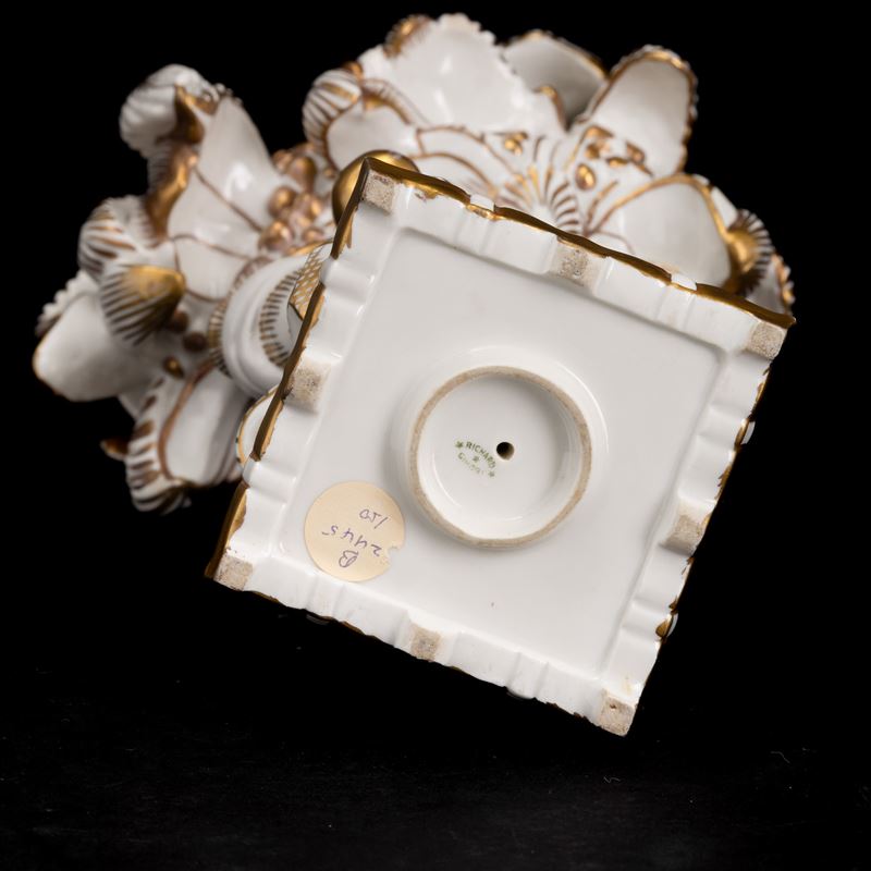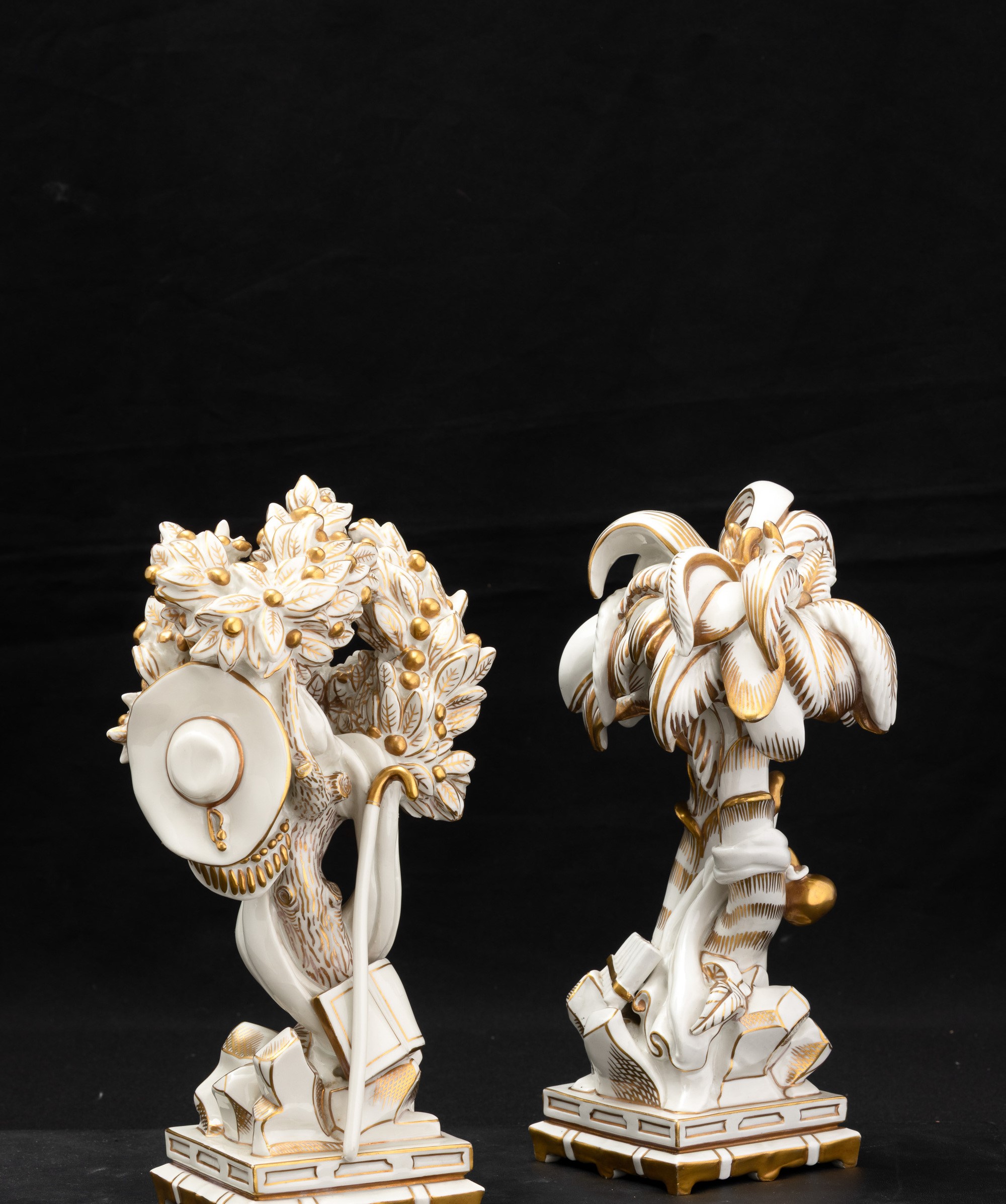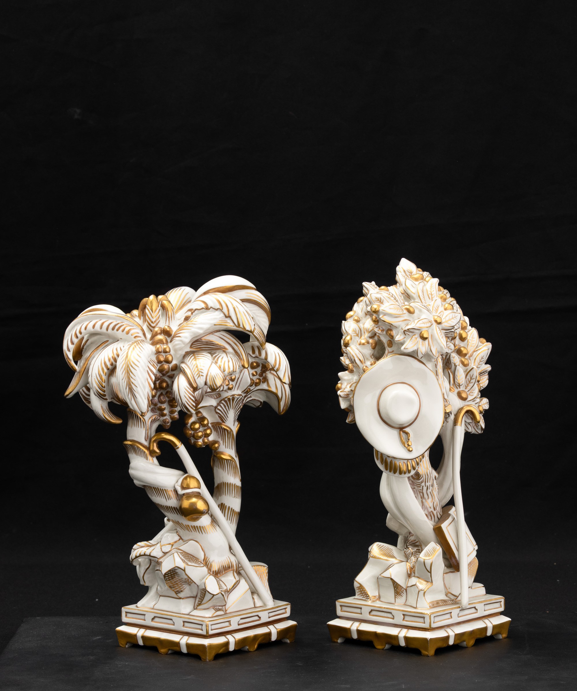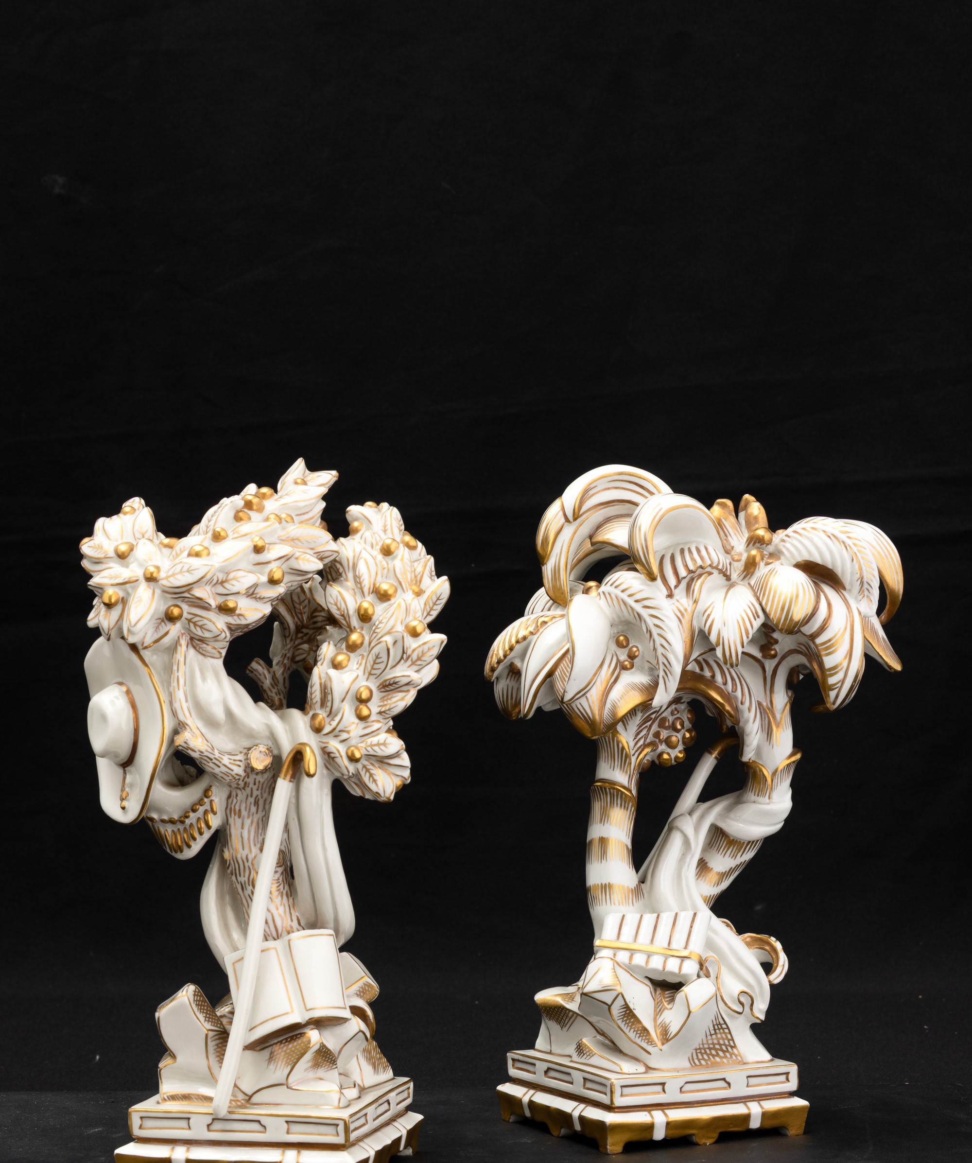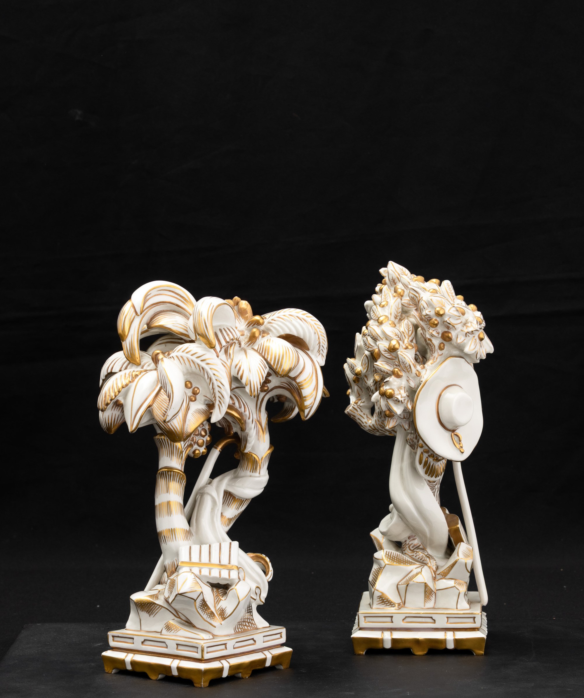 Elemento del Trionfo da tavola in porcellana con decoro in oro al terzo fuoco raffigurante palme con strumenti musicali.