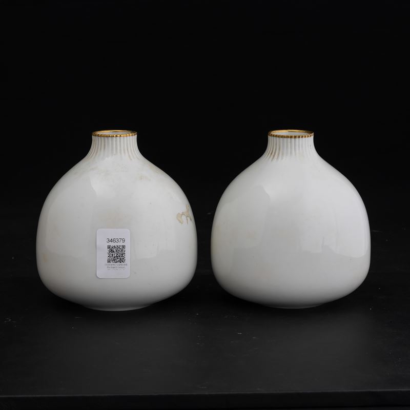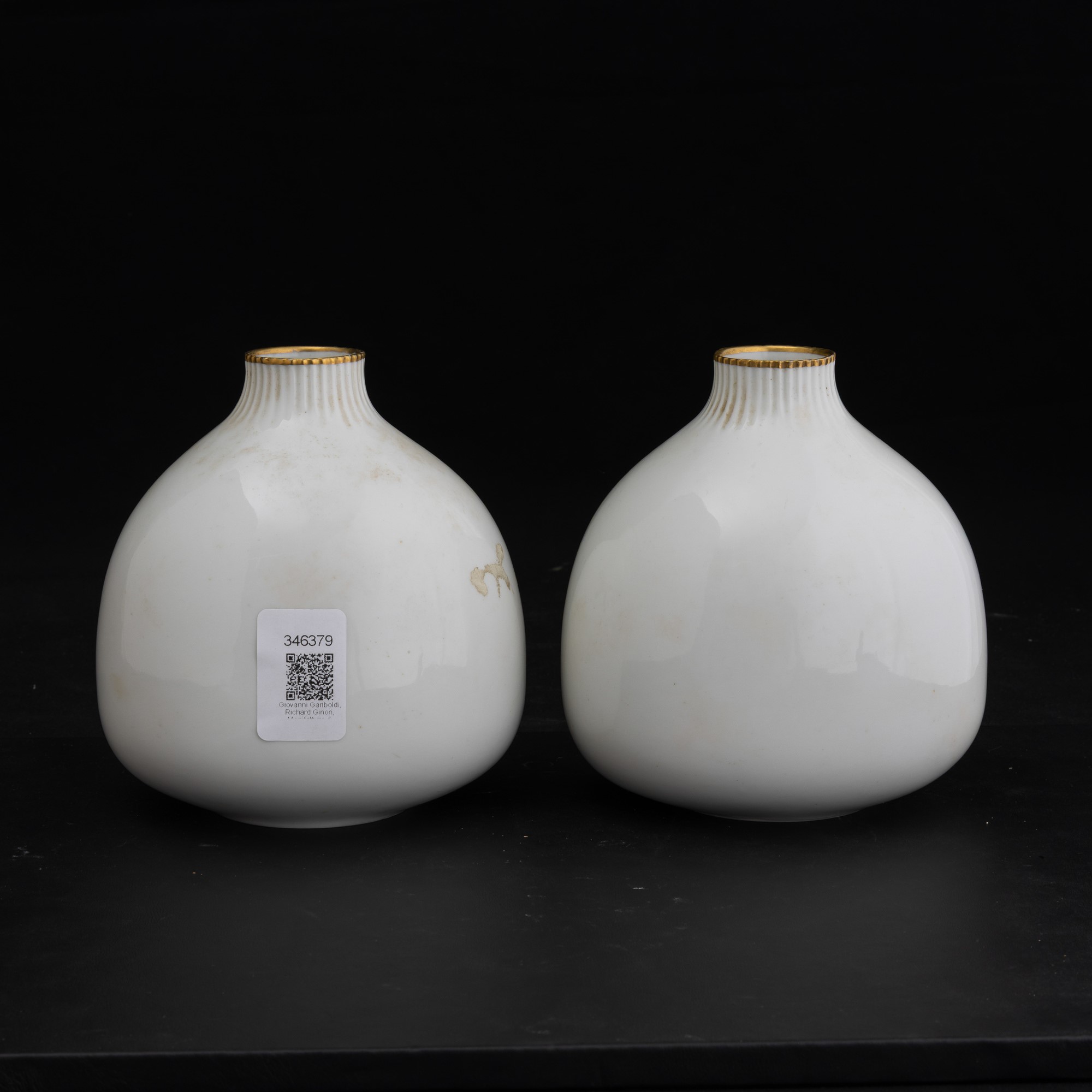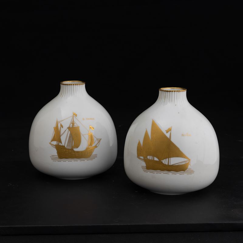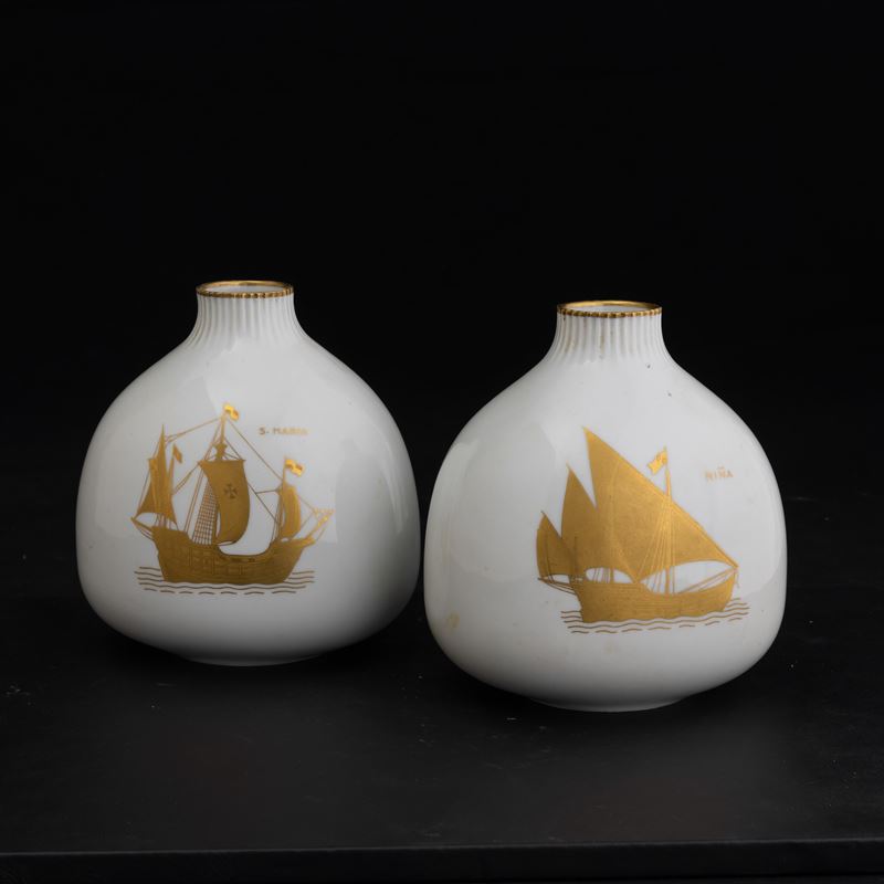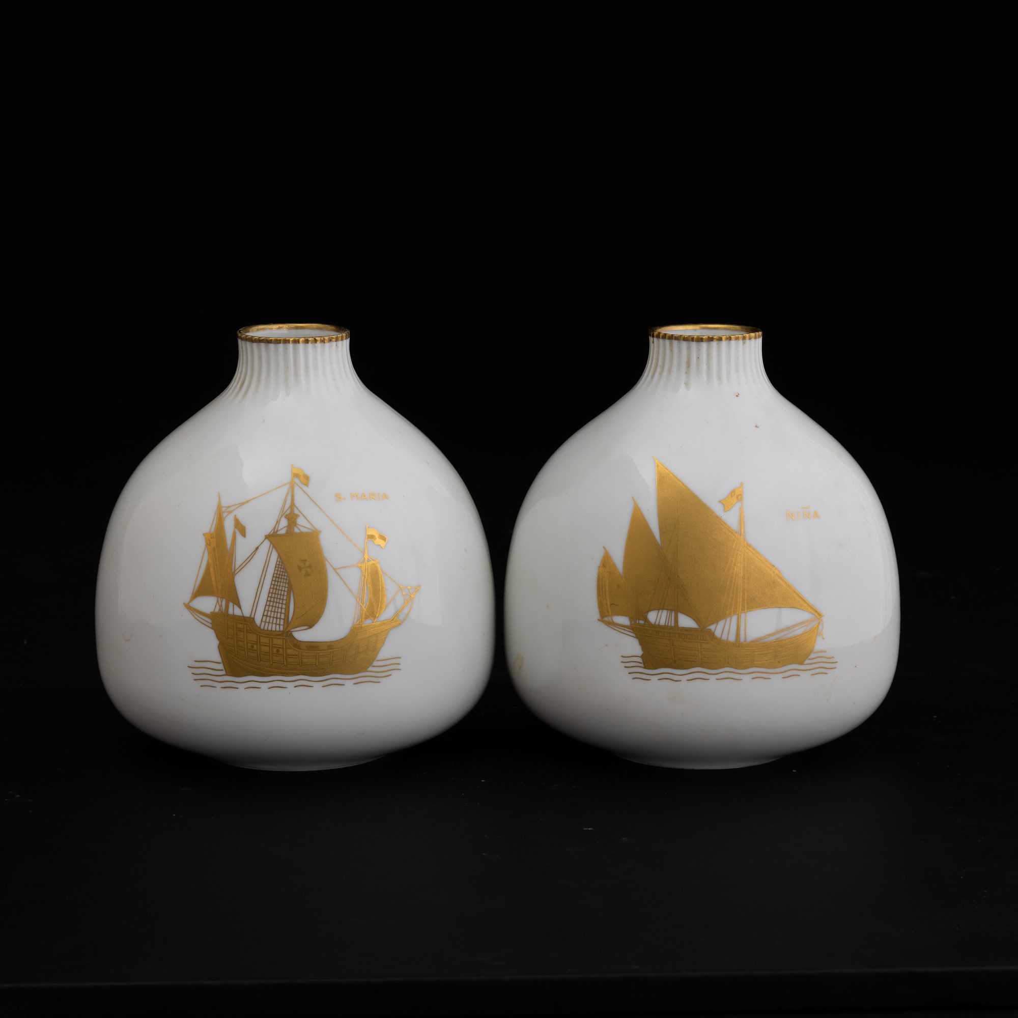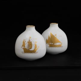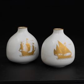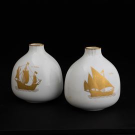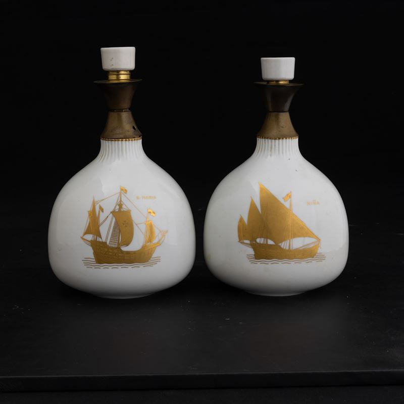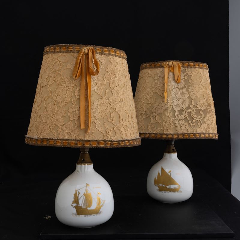 Rara coppia di vasi a sezione ovale in porcellana con decoro di caravelle in foglia oro graffita. Montature a lampada originali in ottone. Marchio della manifattura.