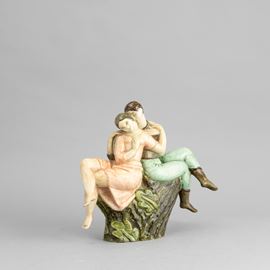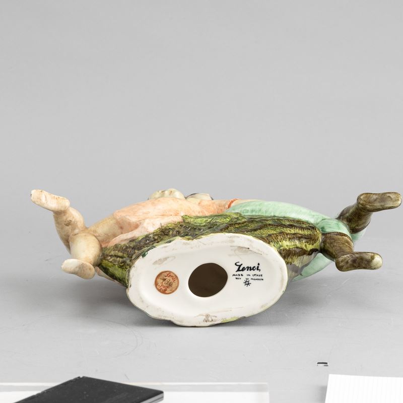 Coppia di contadini seduti su un tronco in terraglia a colaggio con decoro a smalti policromi.