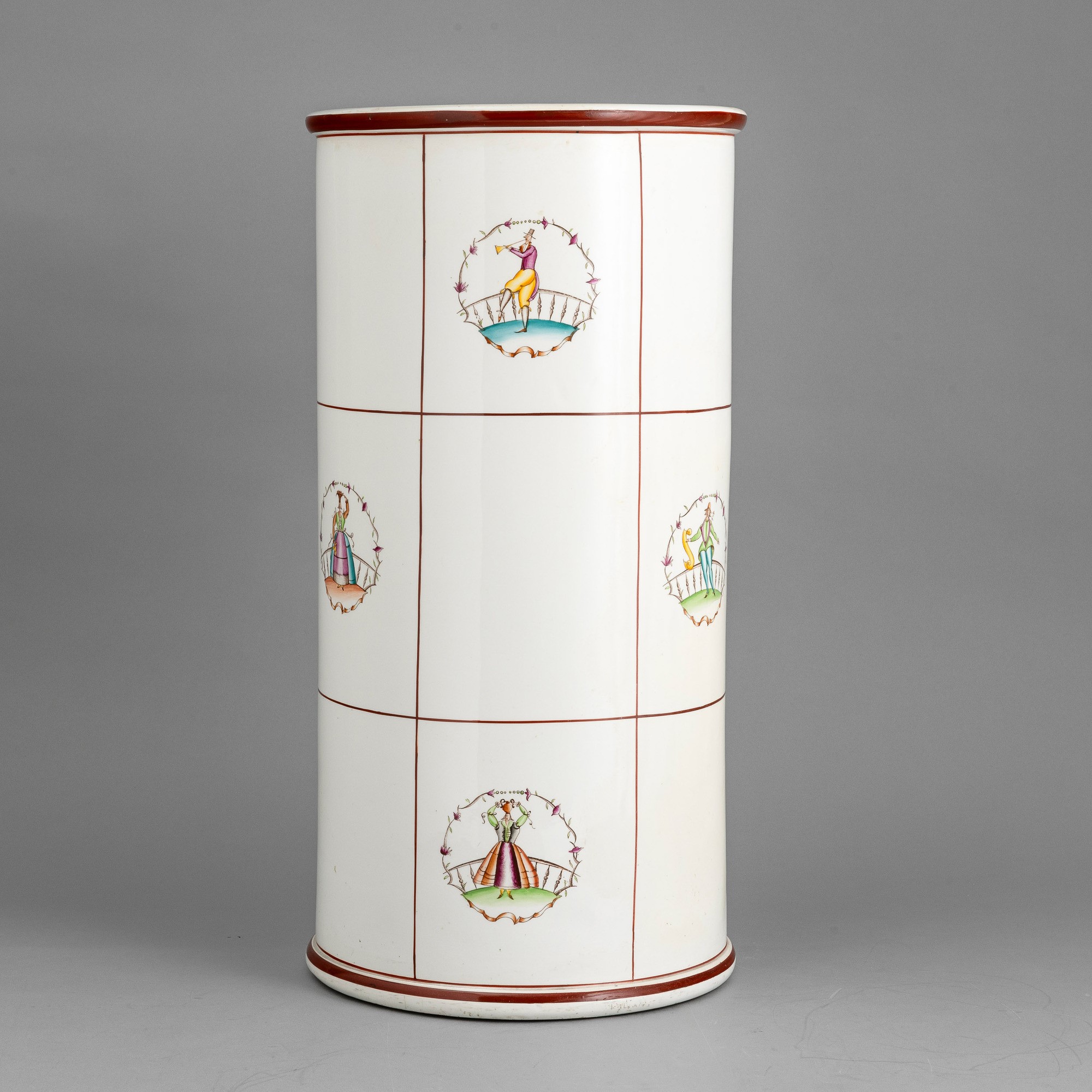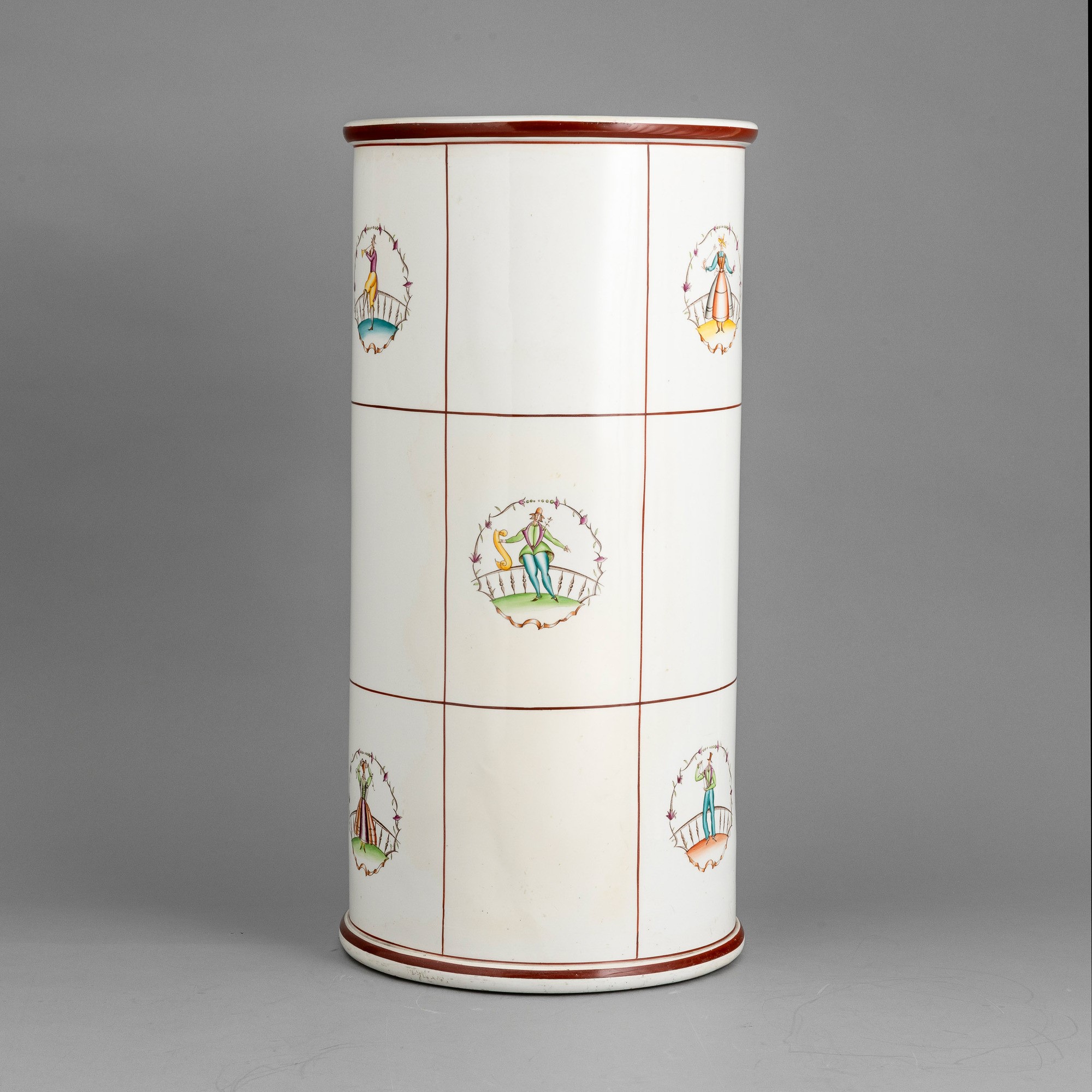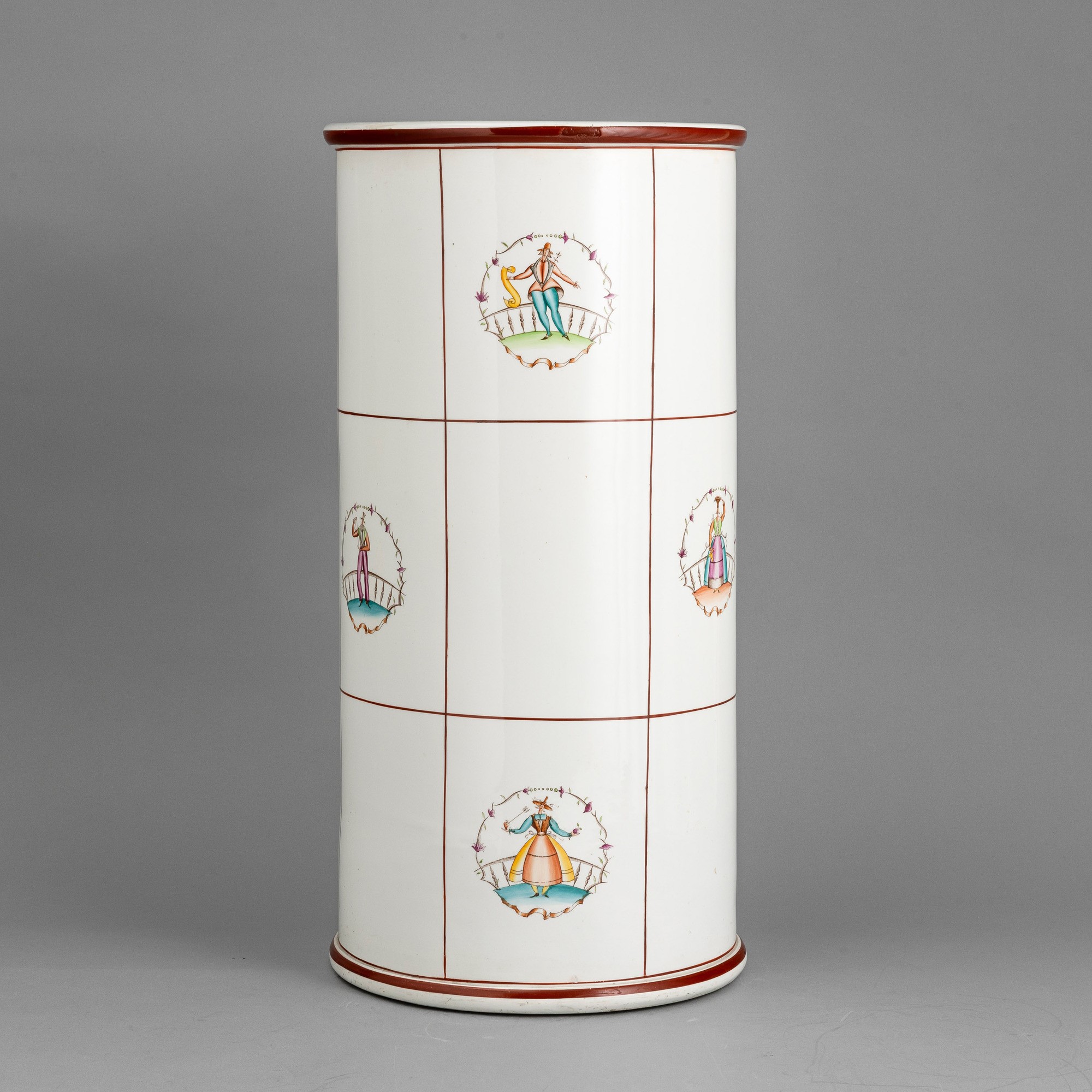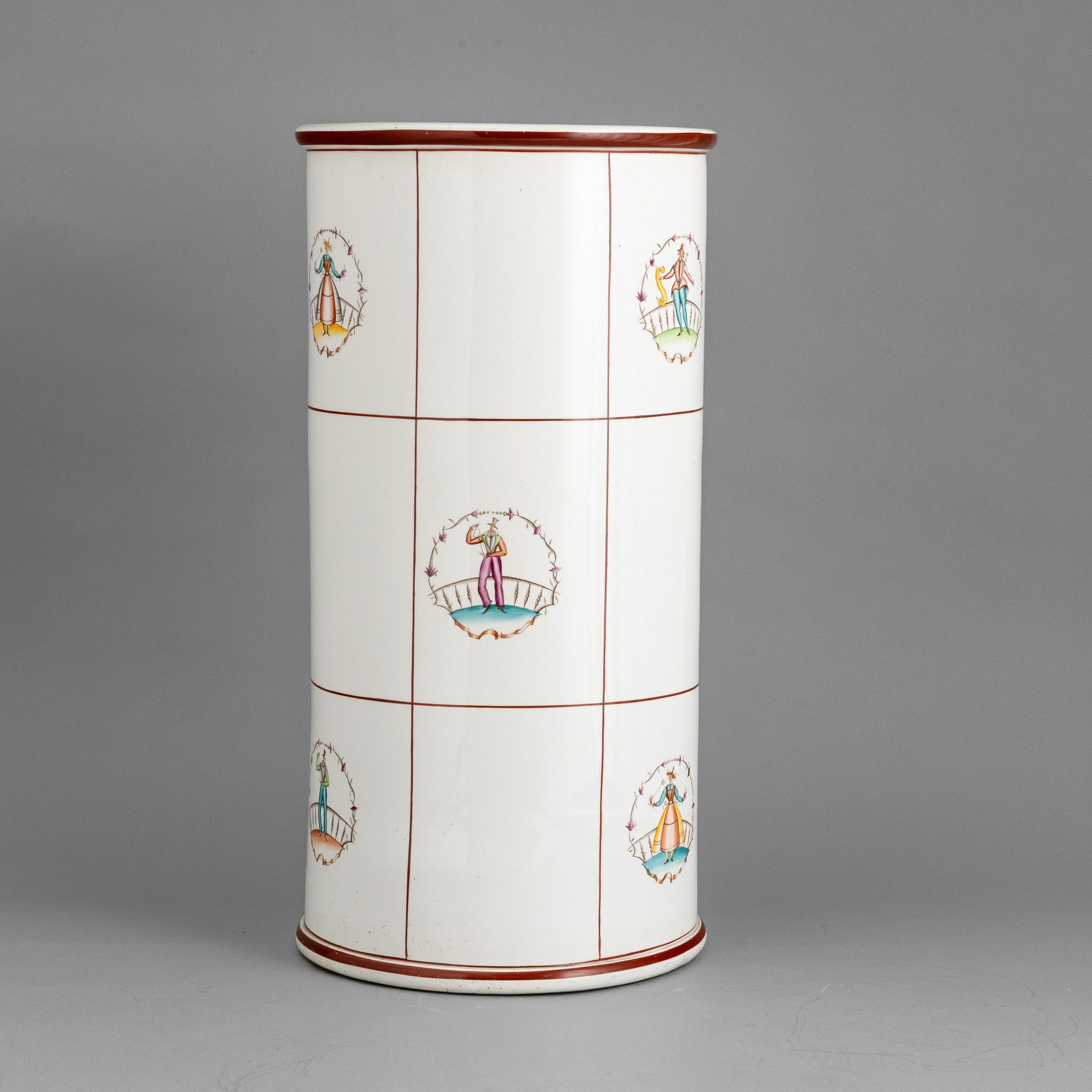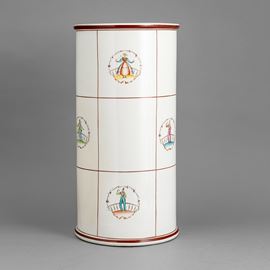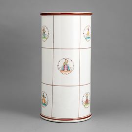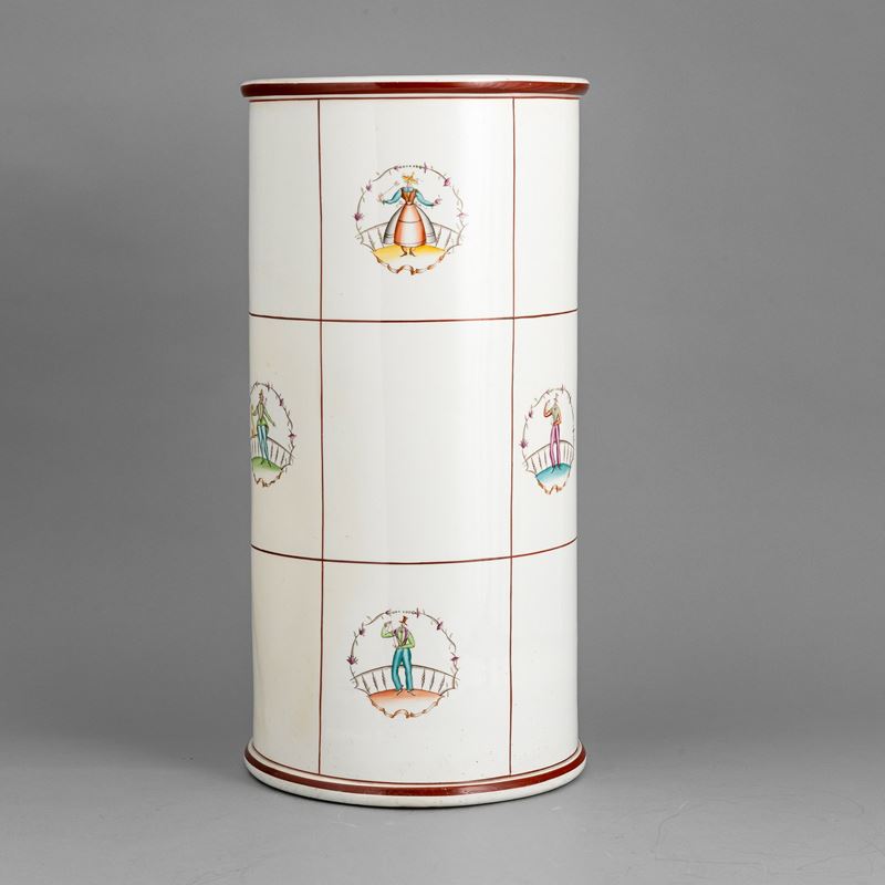 Vaso cilindrico portaombrelli in terraglia a colaggio con decoro policromo di personaggi entro ghirlande.