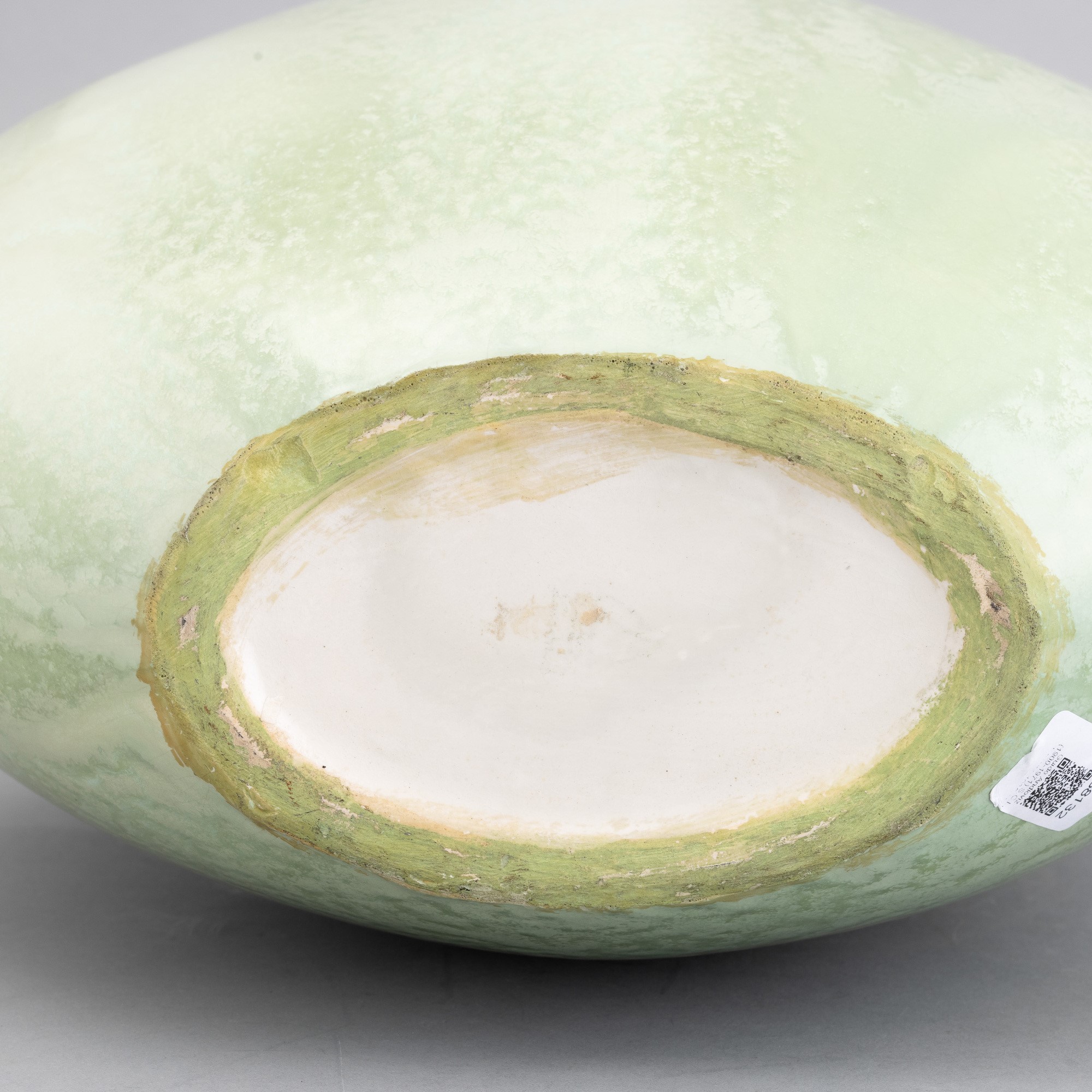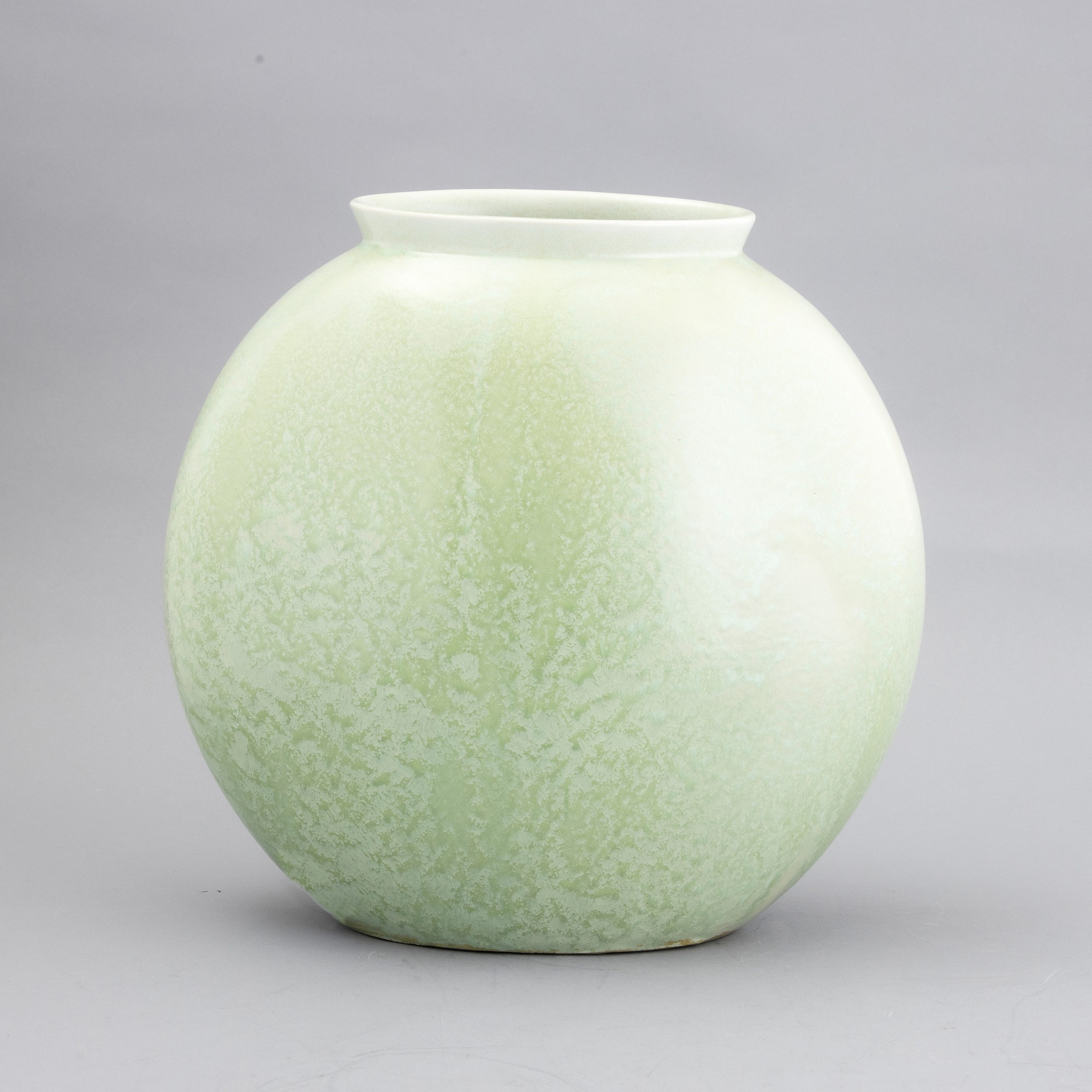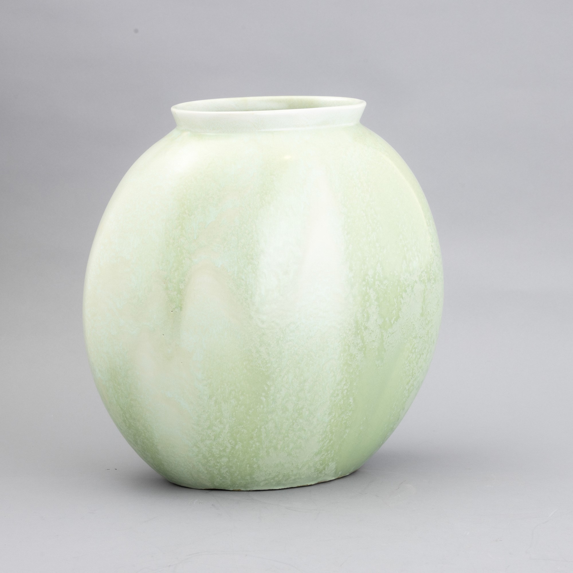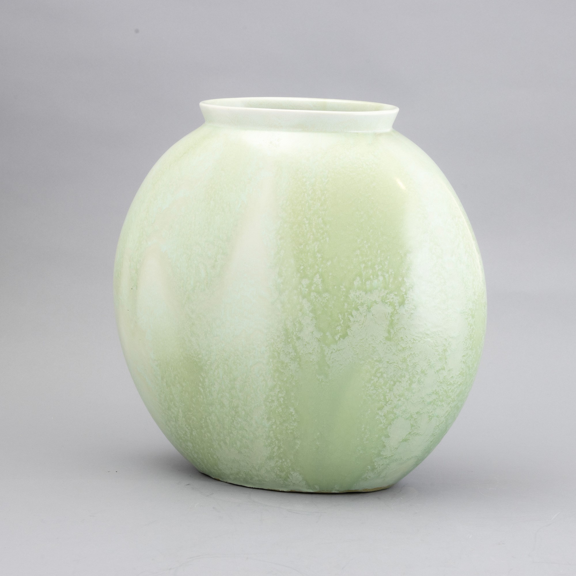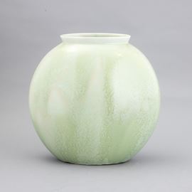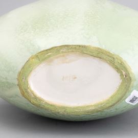 Vaso a lente con collo svasato in terraglia a colaggio con decoro di smalto verde cristallizzato.