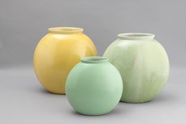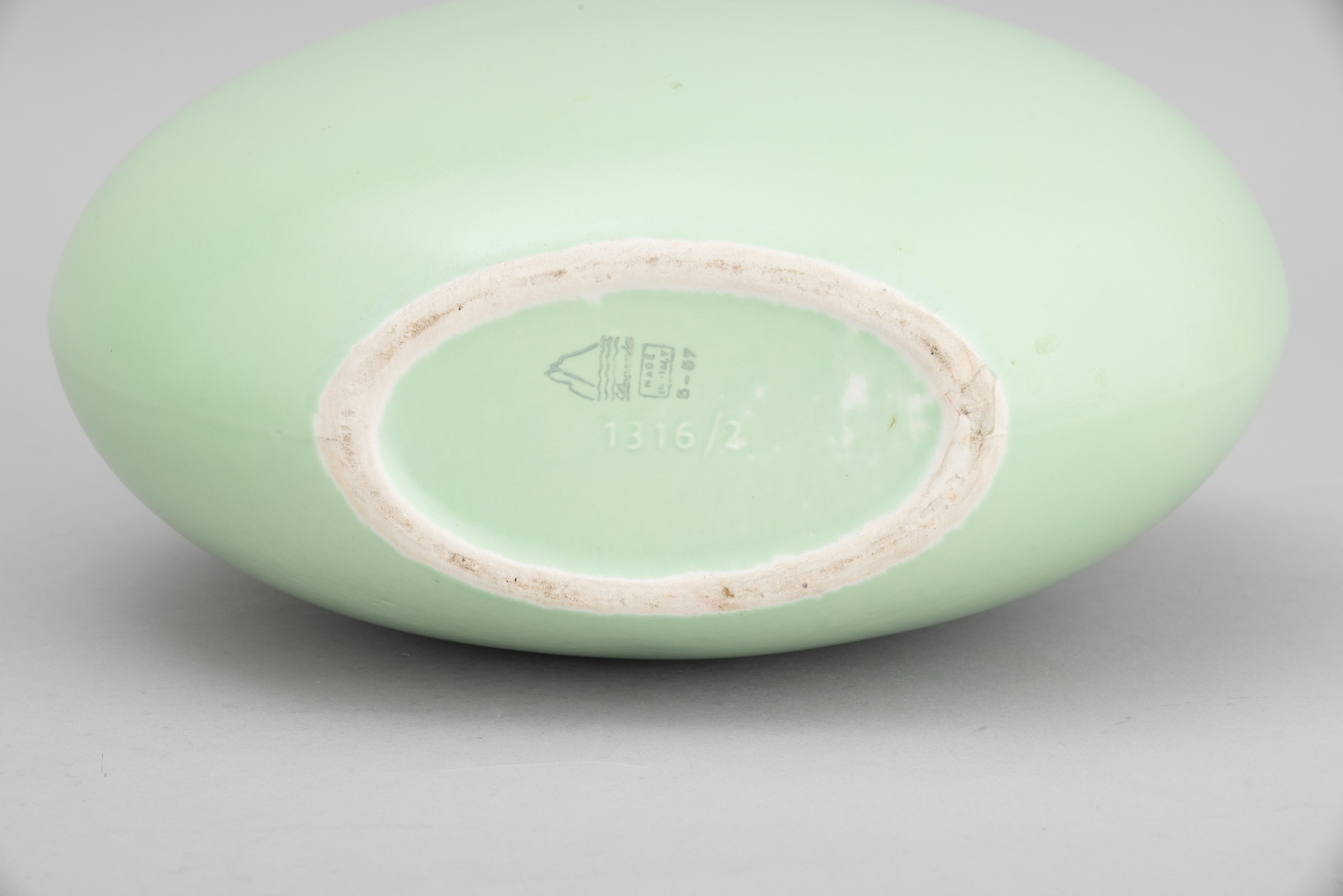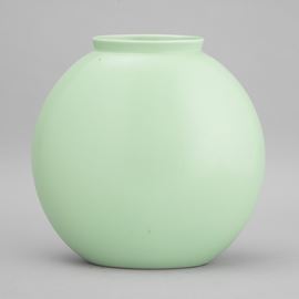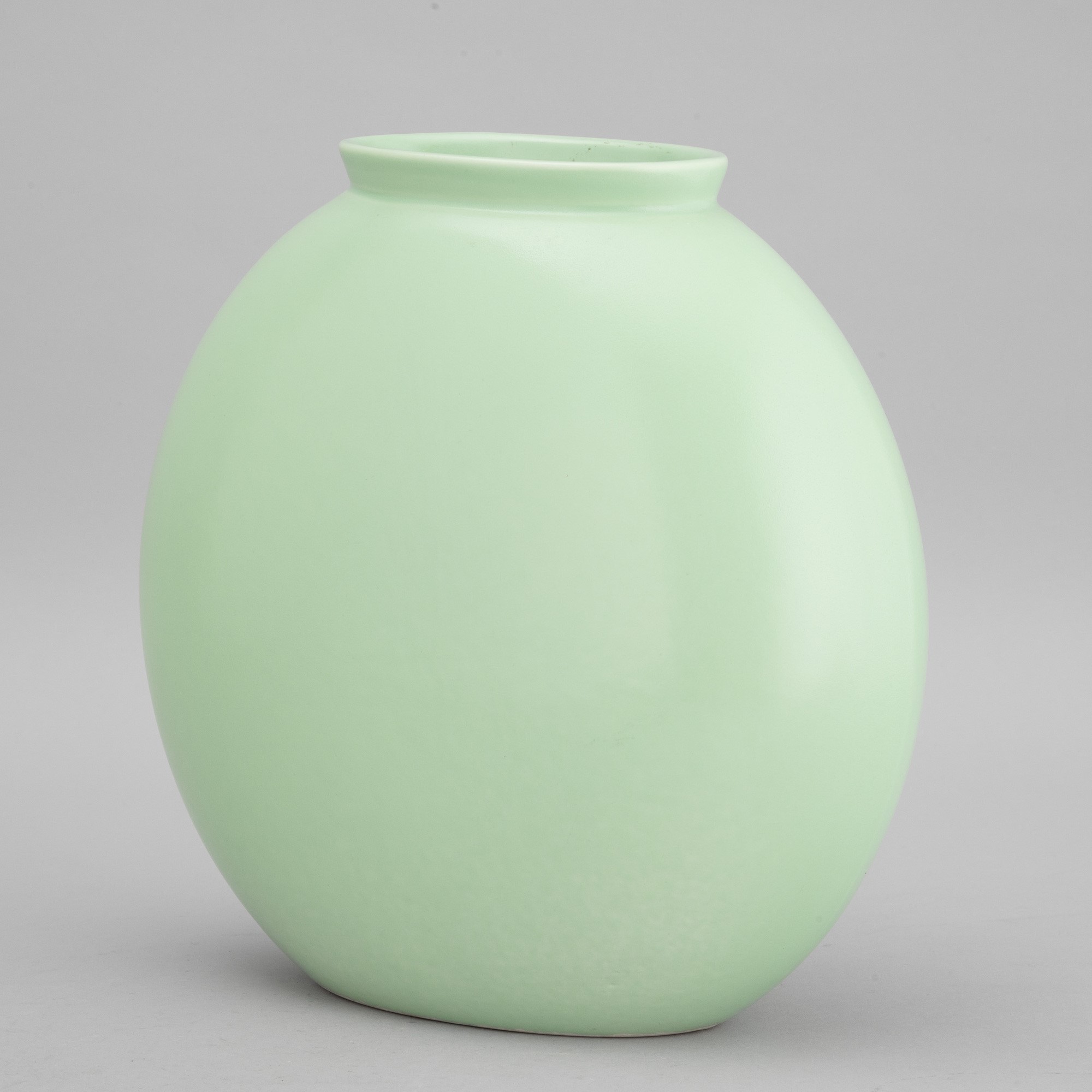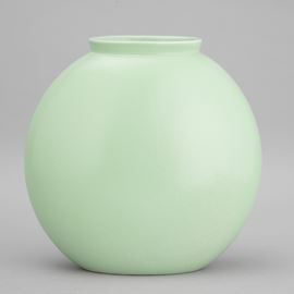 Vaso a lente con collo svasato in terraglia a colaggio con decoro di smalto verde cristallizzato.