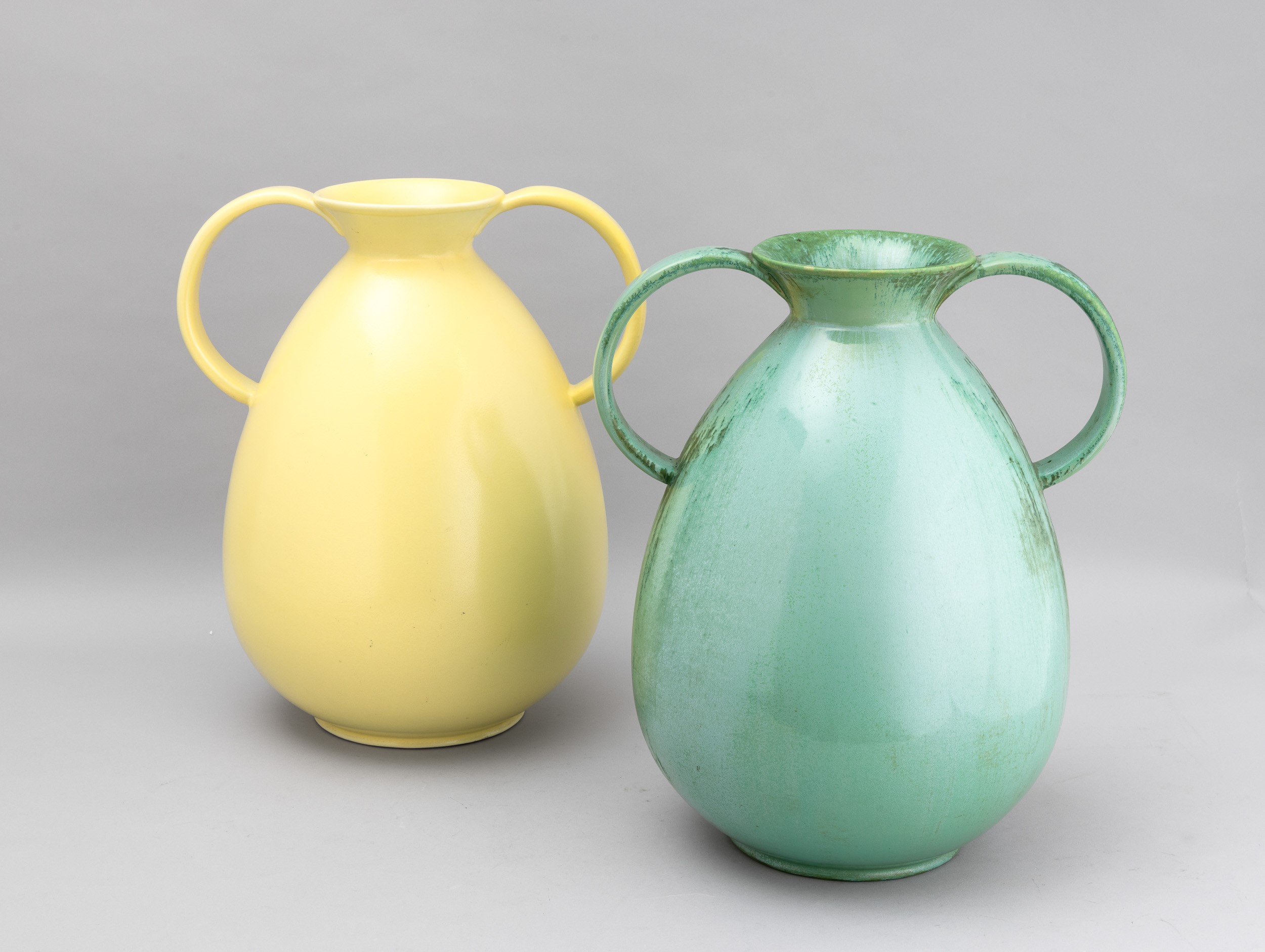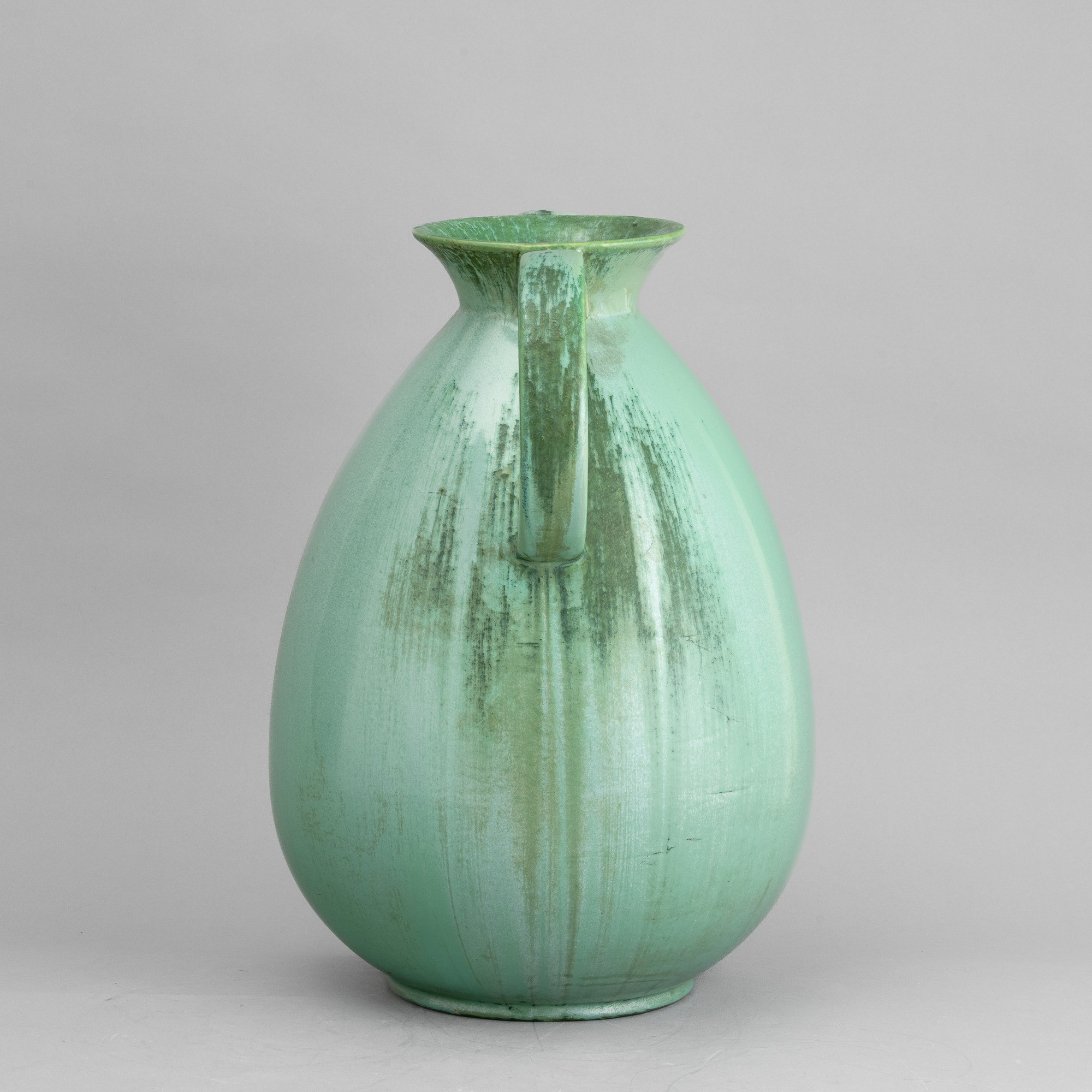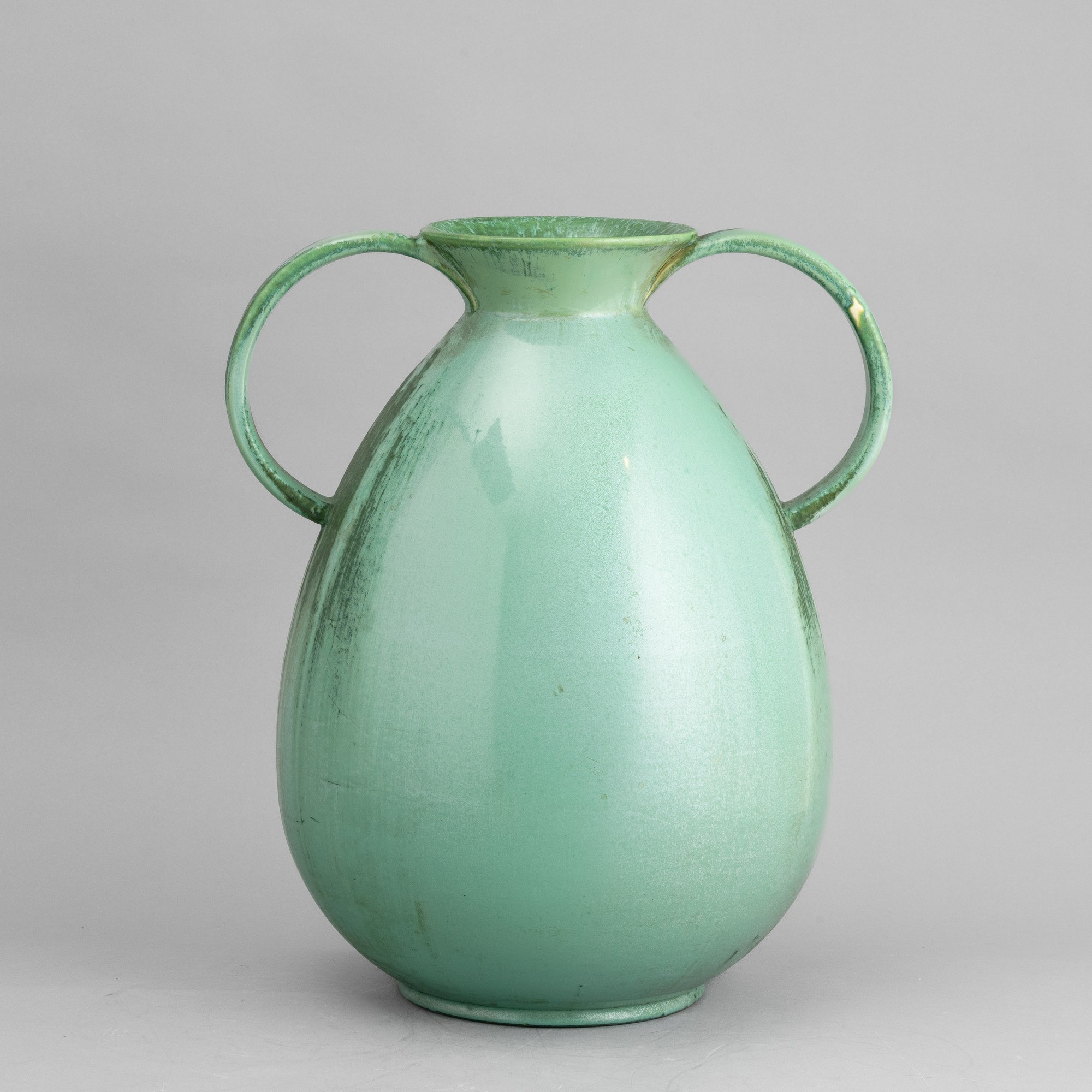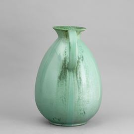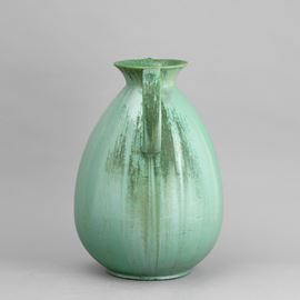 Grande vaso con doppia ansa in terraglia a colaggio con decoro di smalto colato.