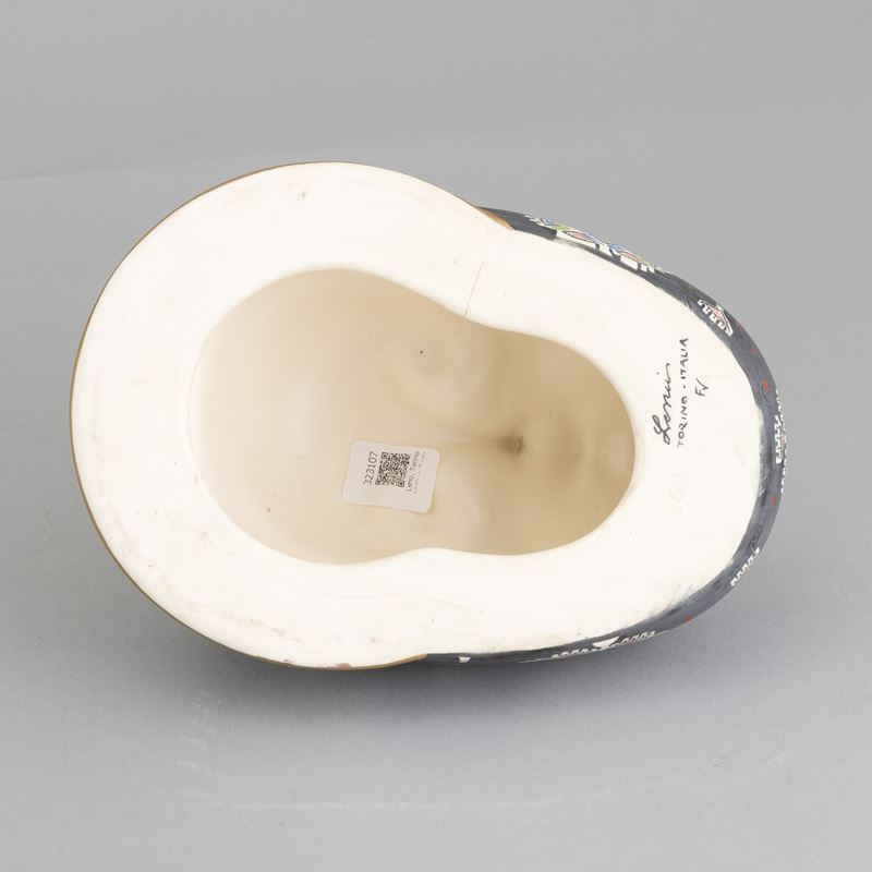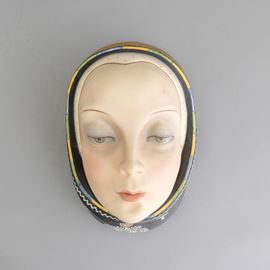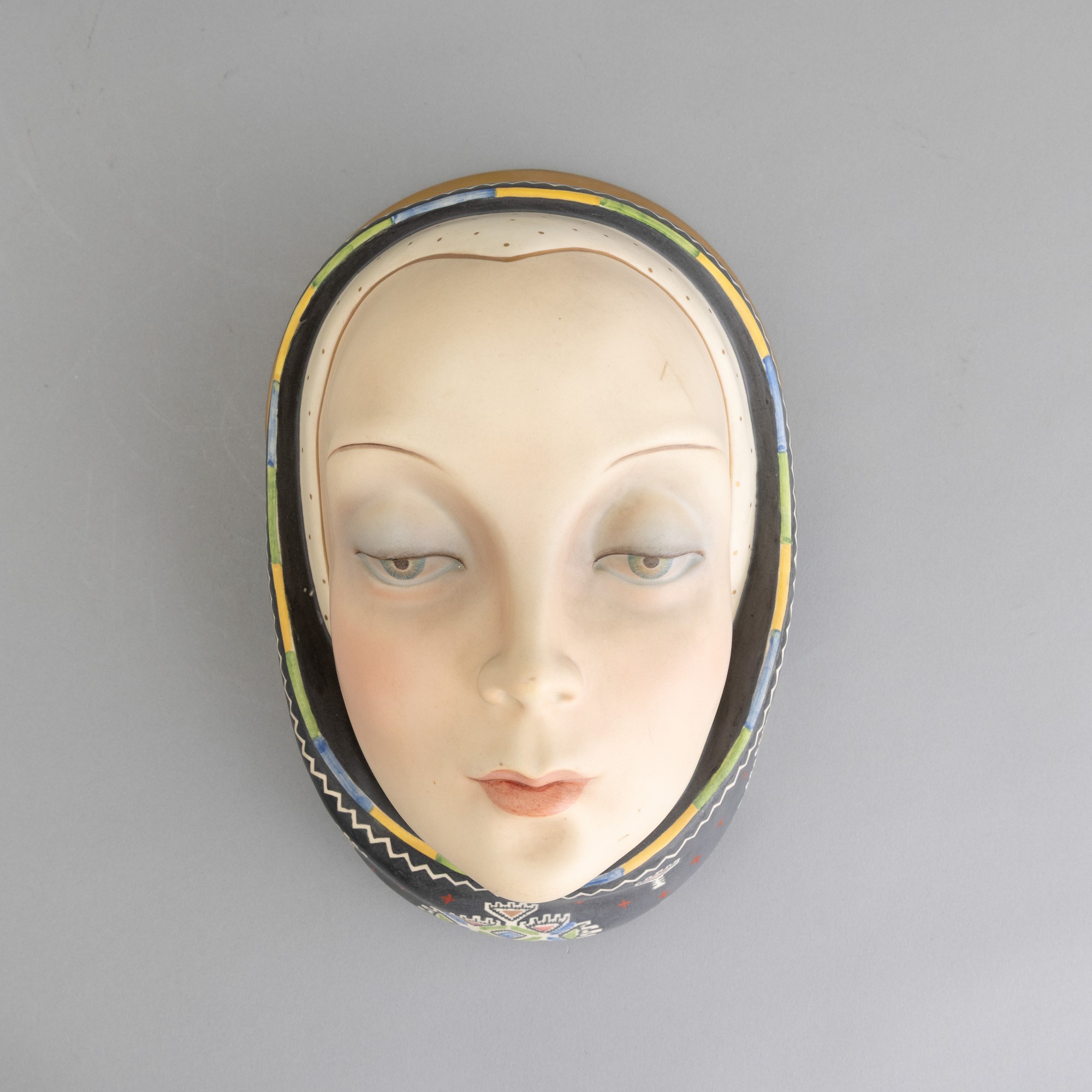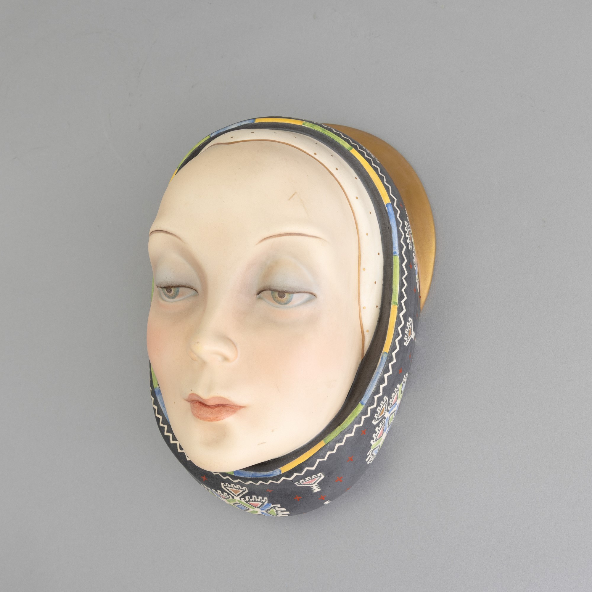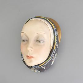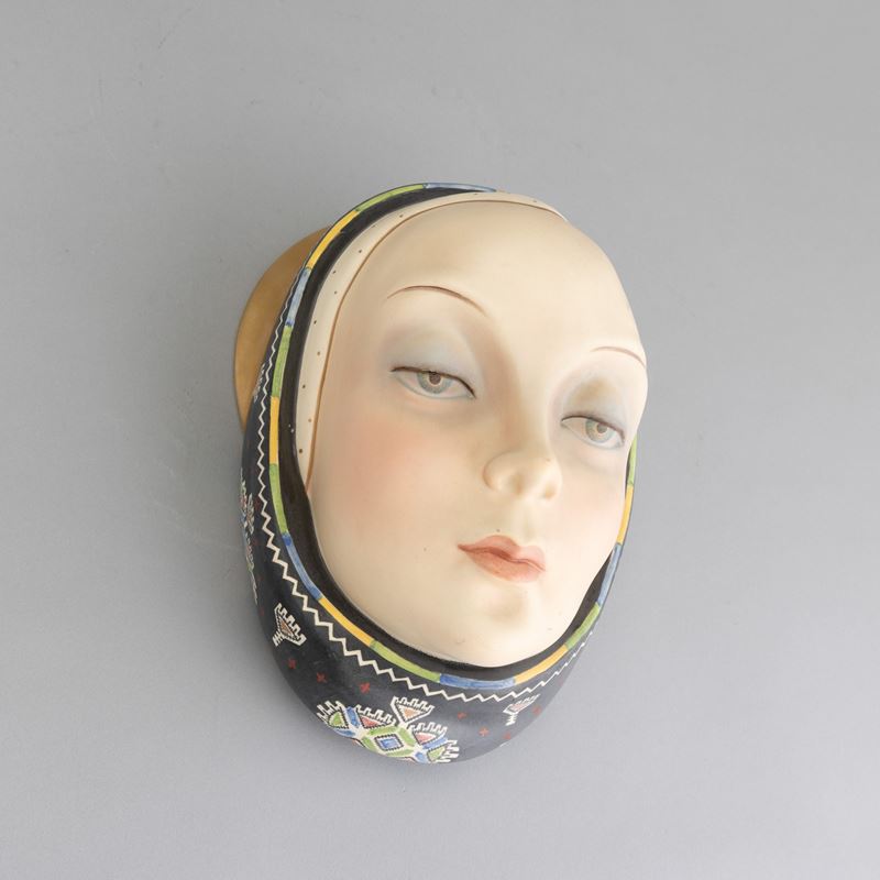 Volto di donna con foulard in terraglia a colaggio con decoro policromo e dorature.
