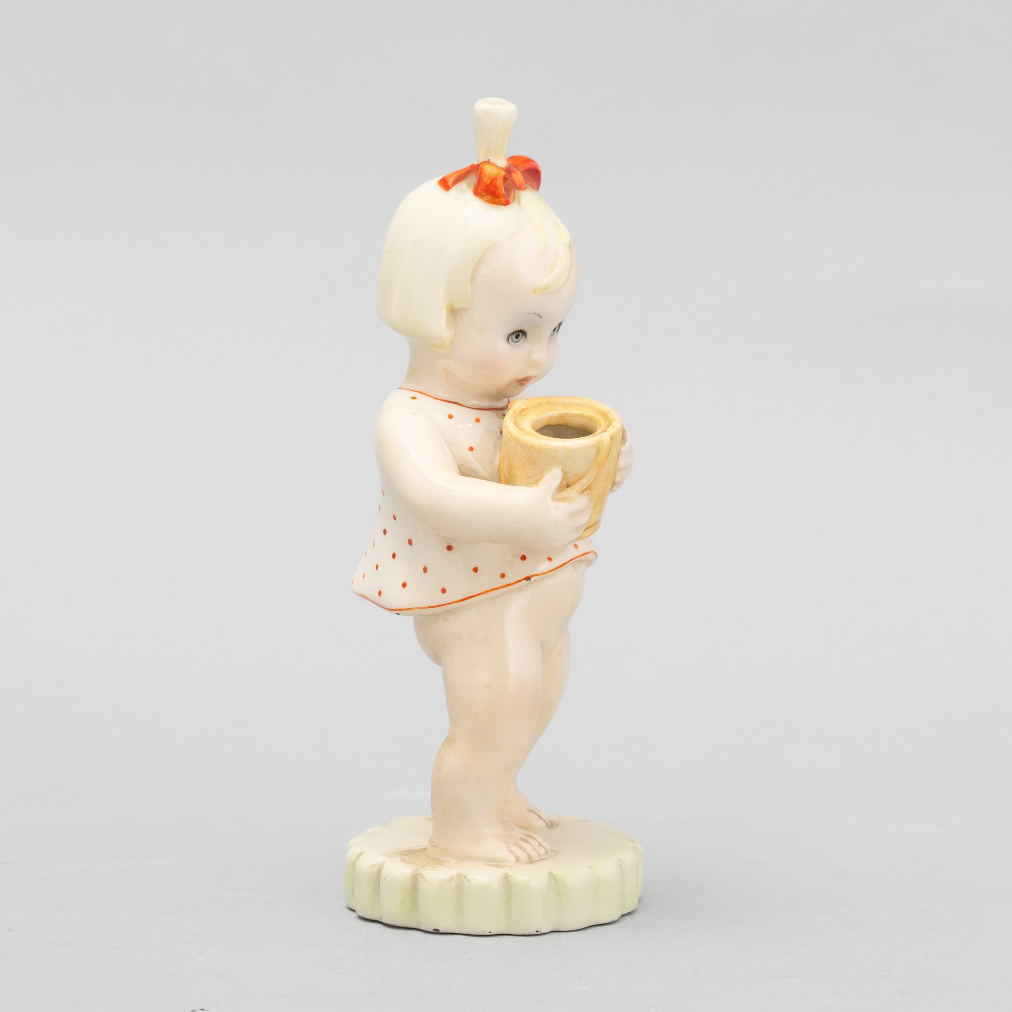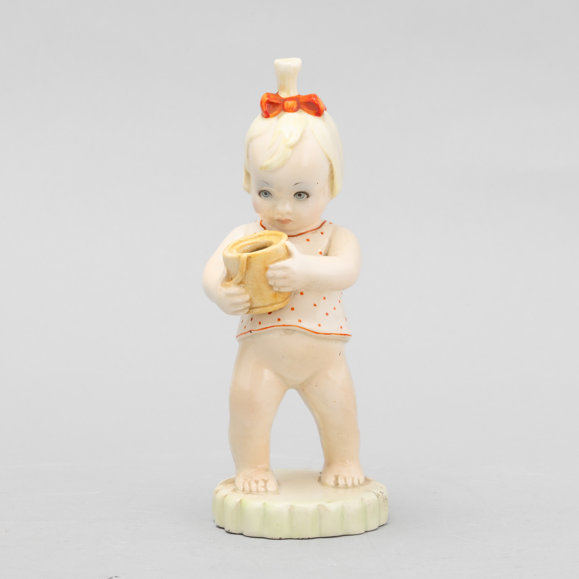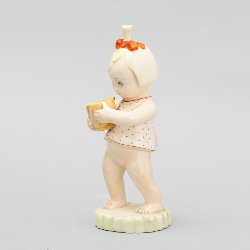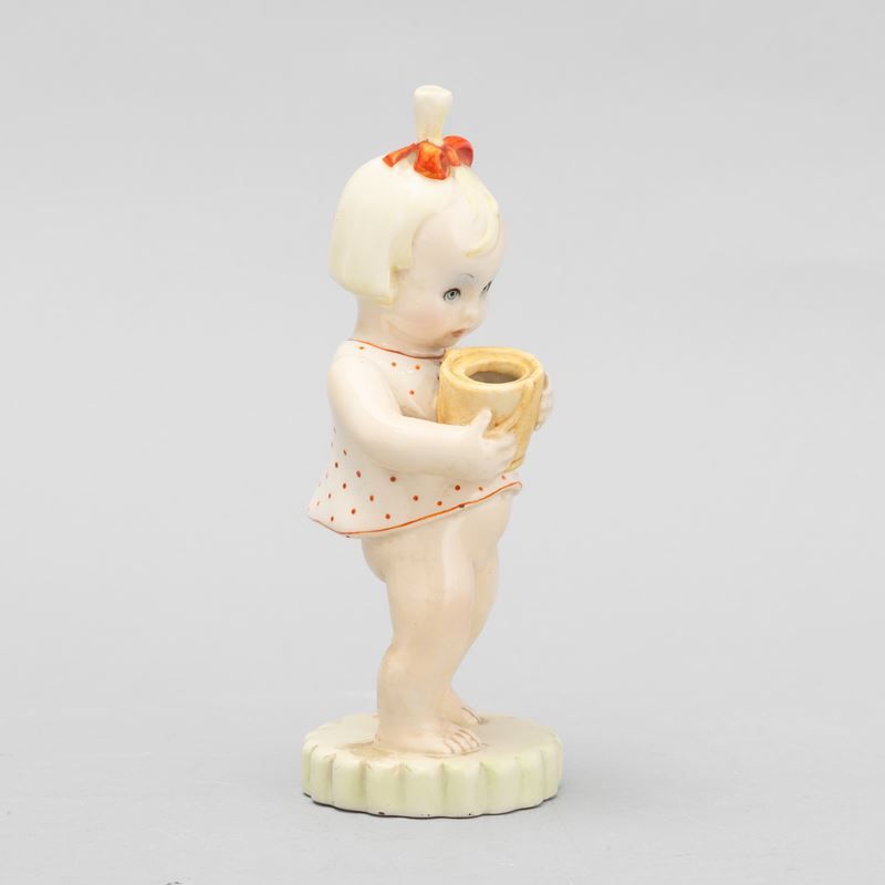 Figura di bimba con secchiello in terraglia a colaggio con decoro policromo.