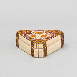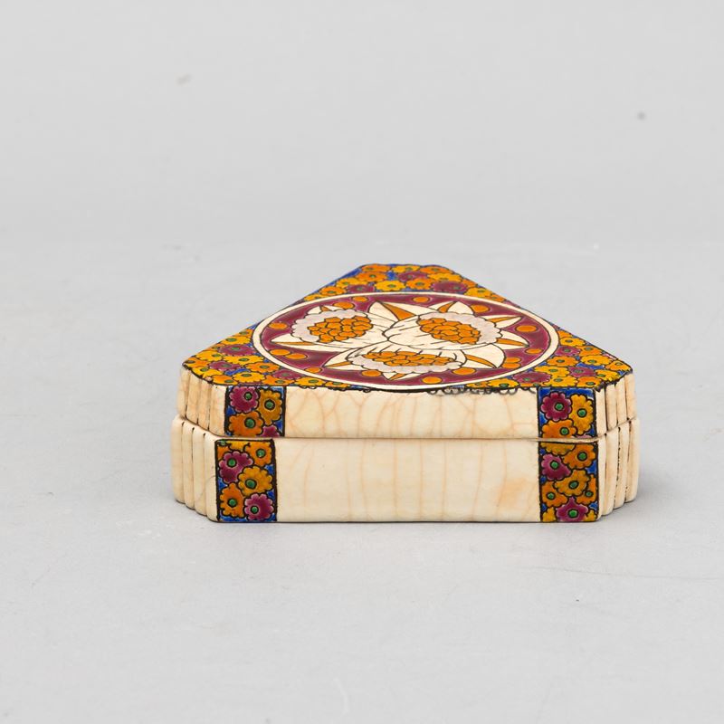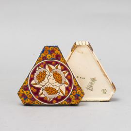 Scatola esagonale in terraglia a colaggio con decoro floreale a smalti policromi a rilievo.