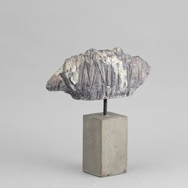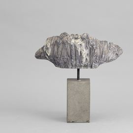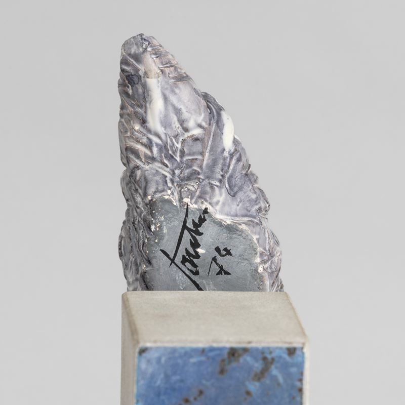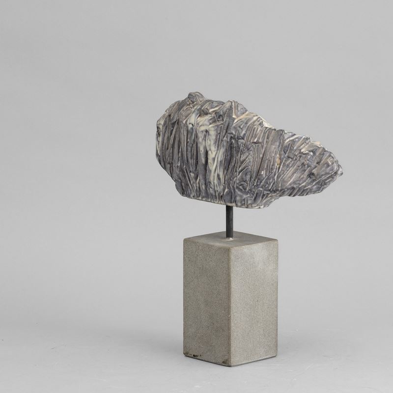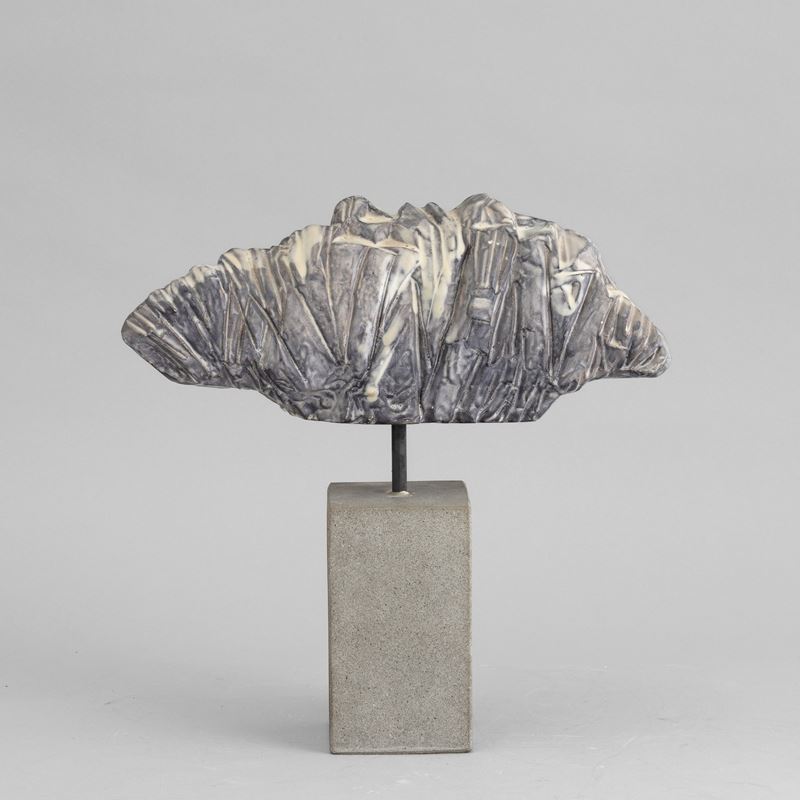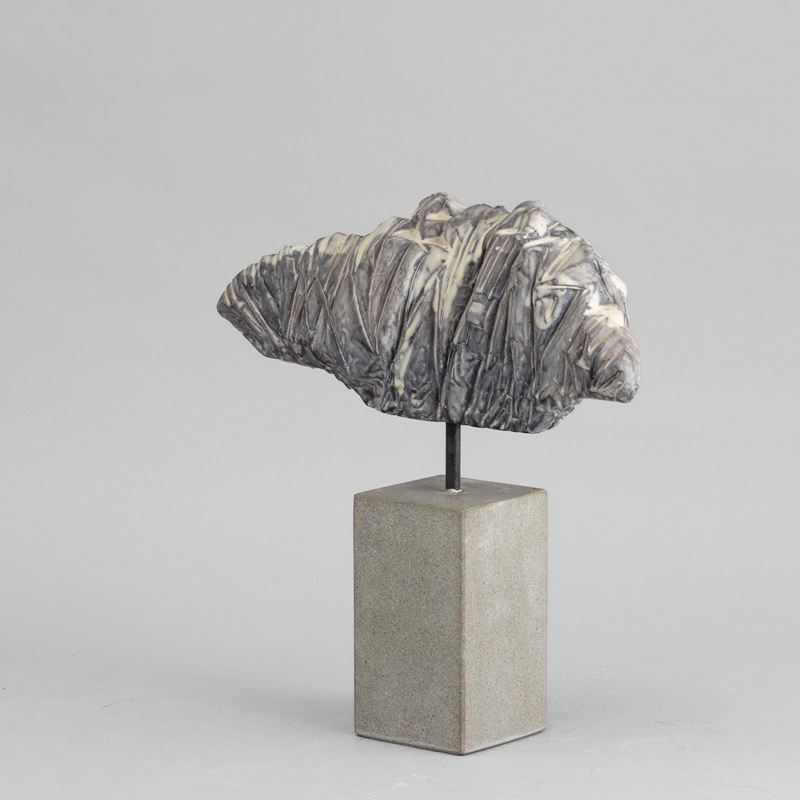 Scultura in ceramica a colaggio in forma di montagna con decoro di smalti colati. Basamento in pietra serena.