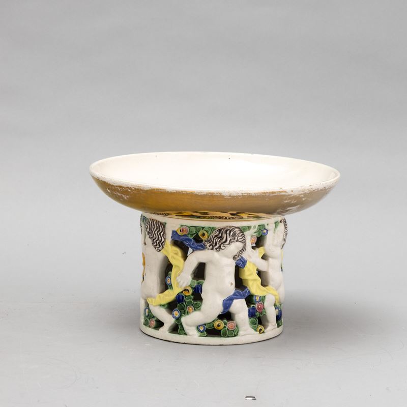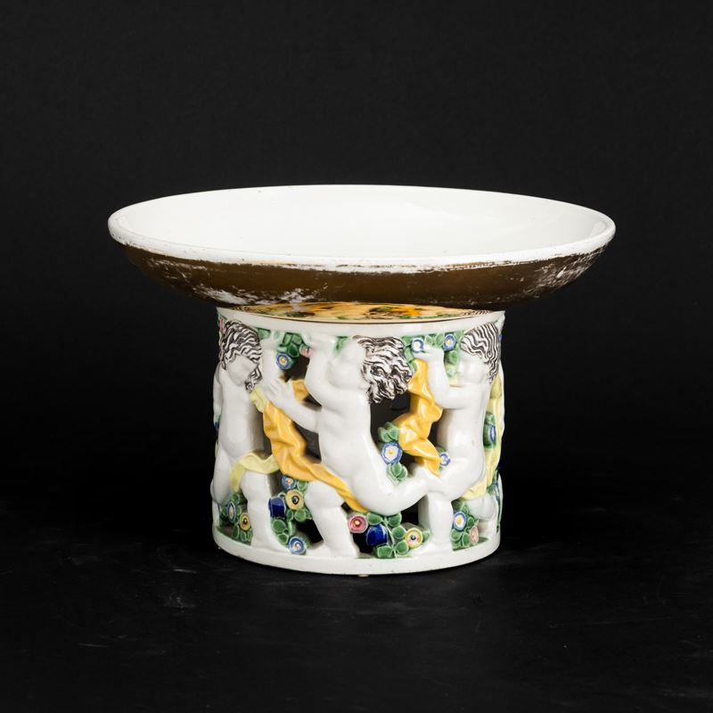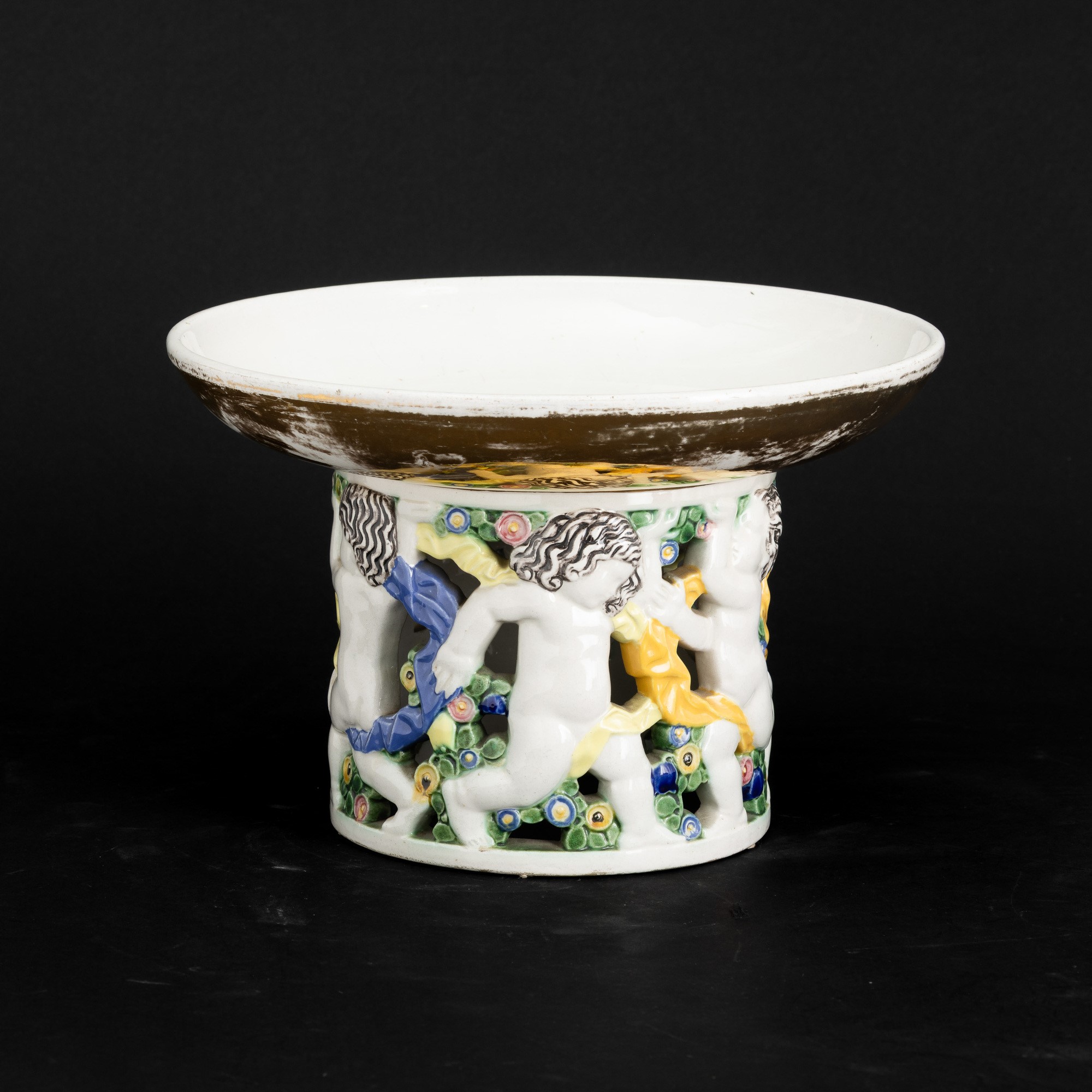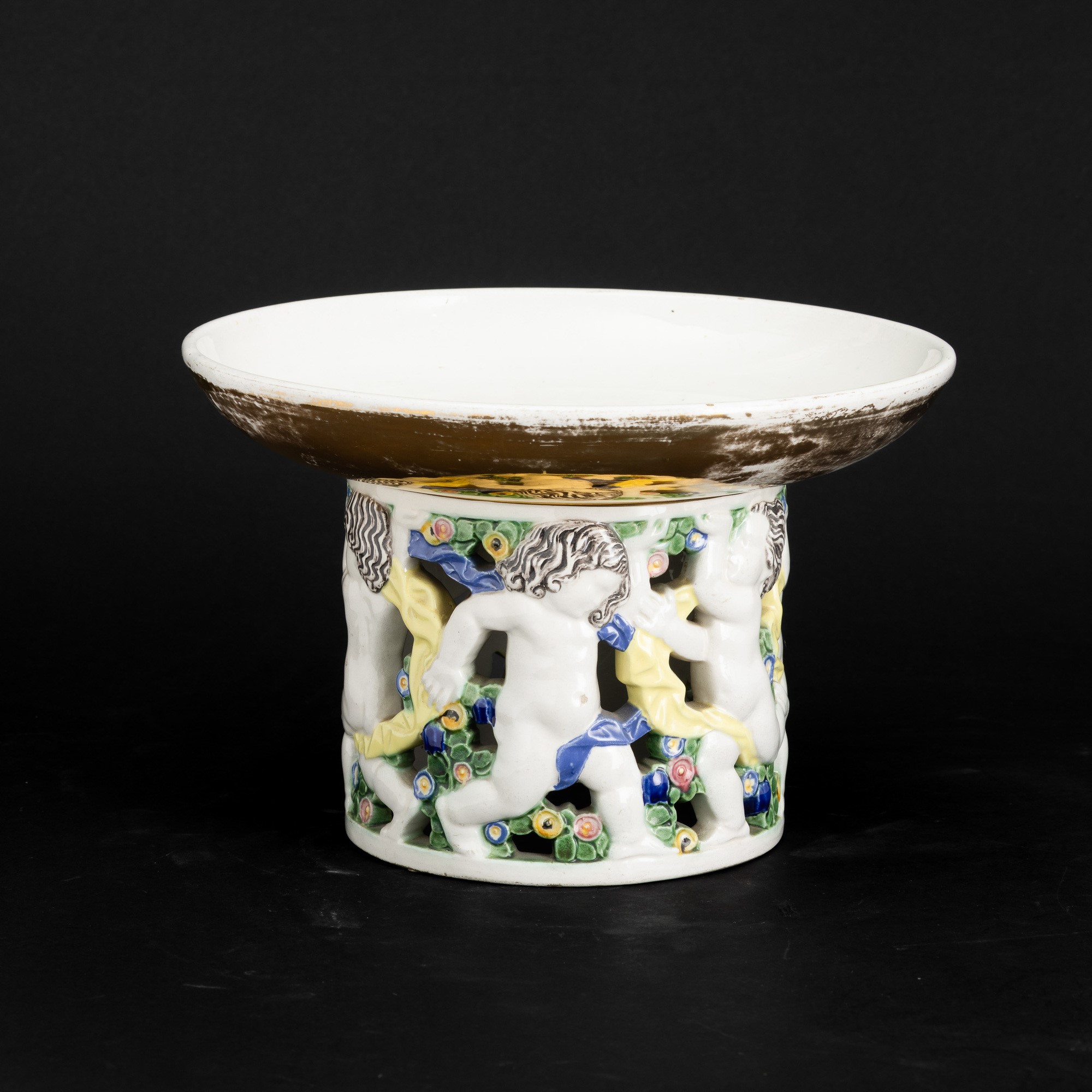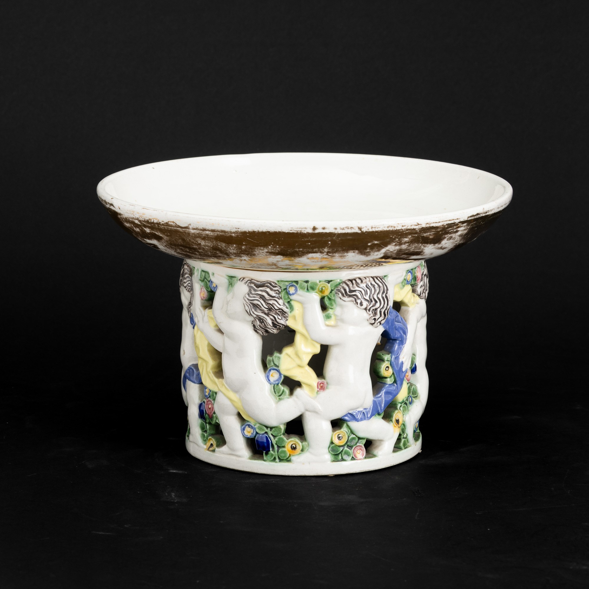 Centrotavola in terraglia su basamento cilindrico con decoro di putti danzanti a rilievo a smalti policromi.