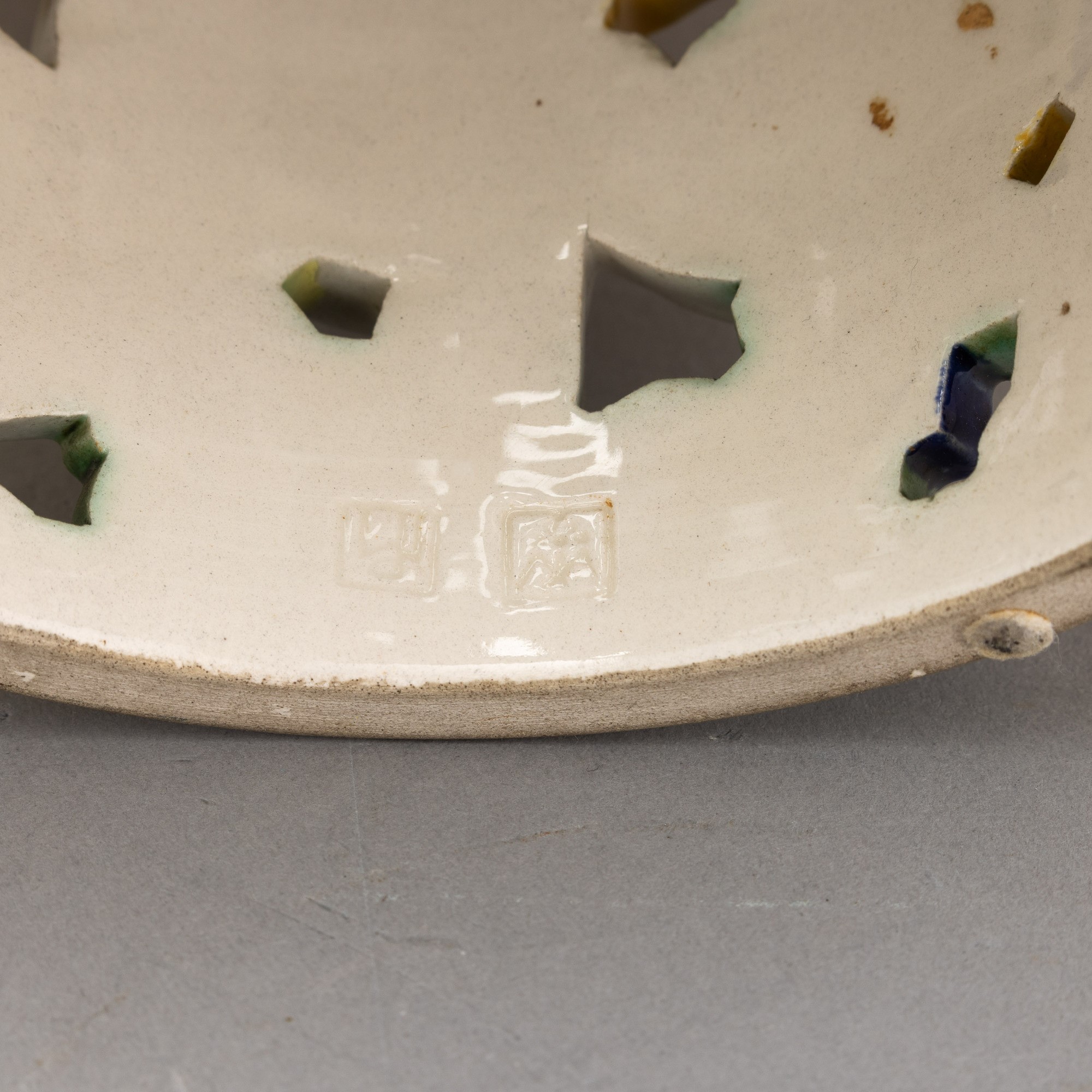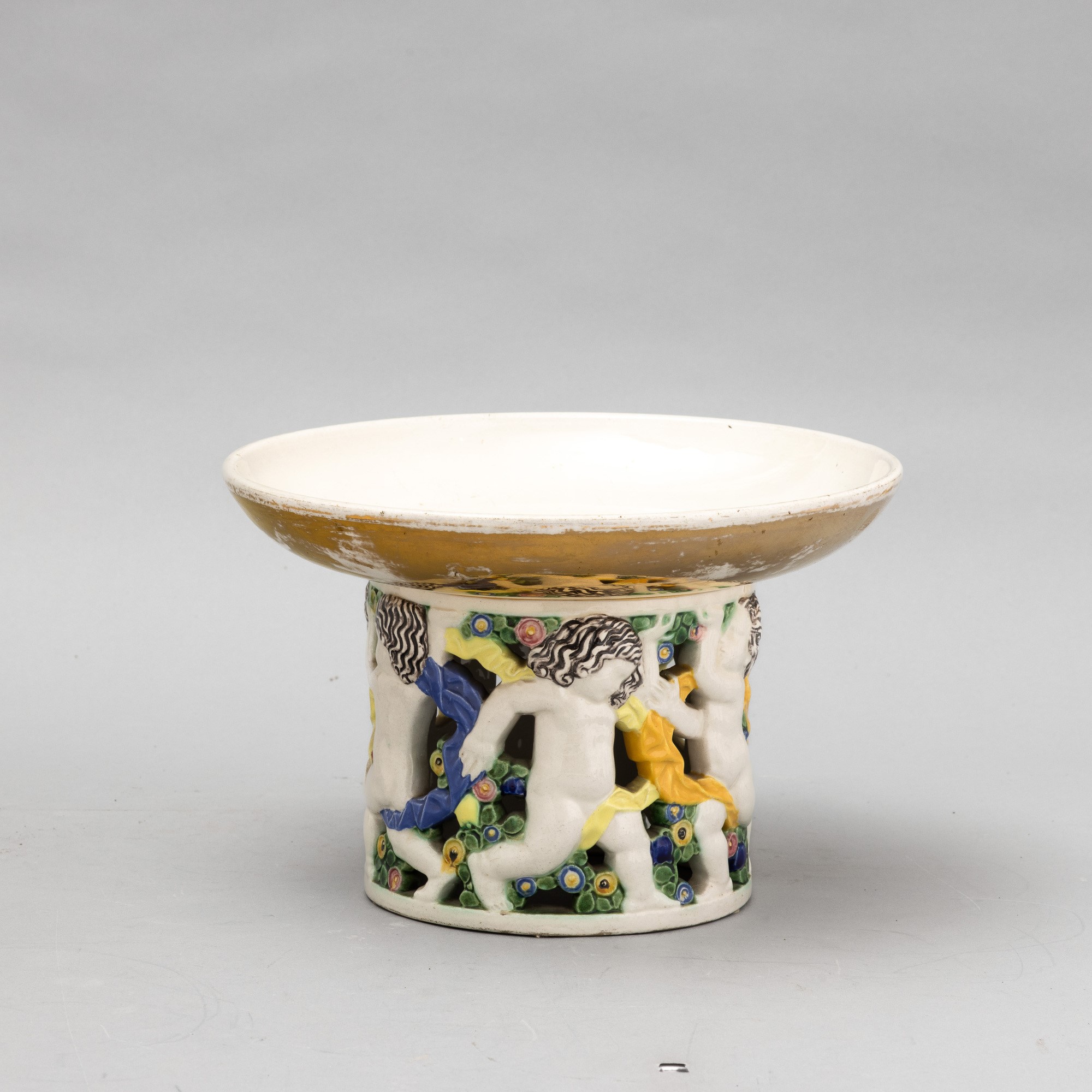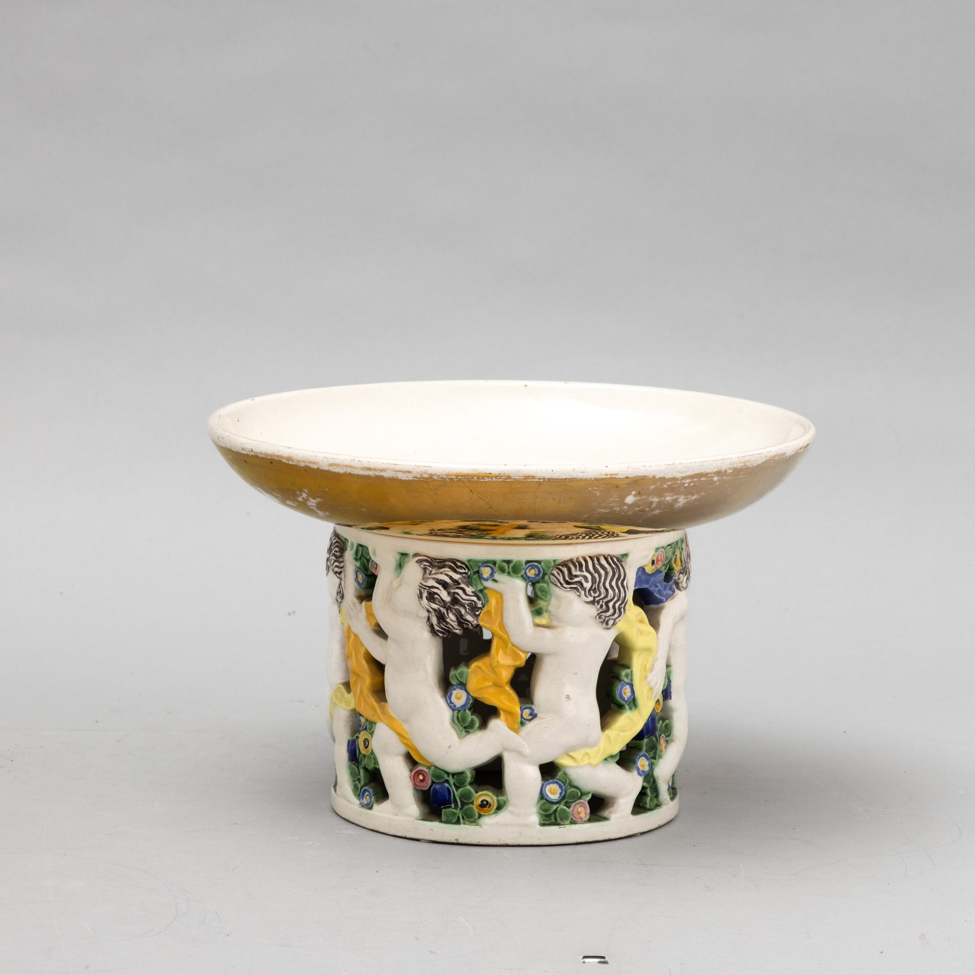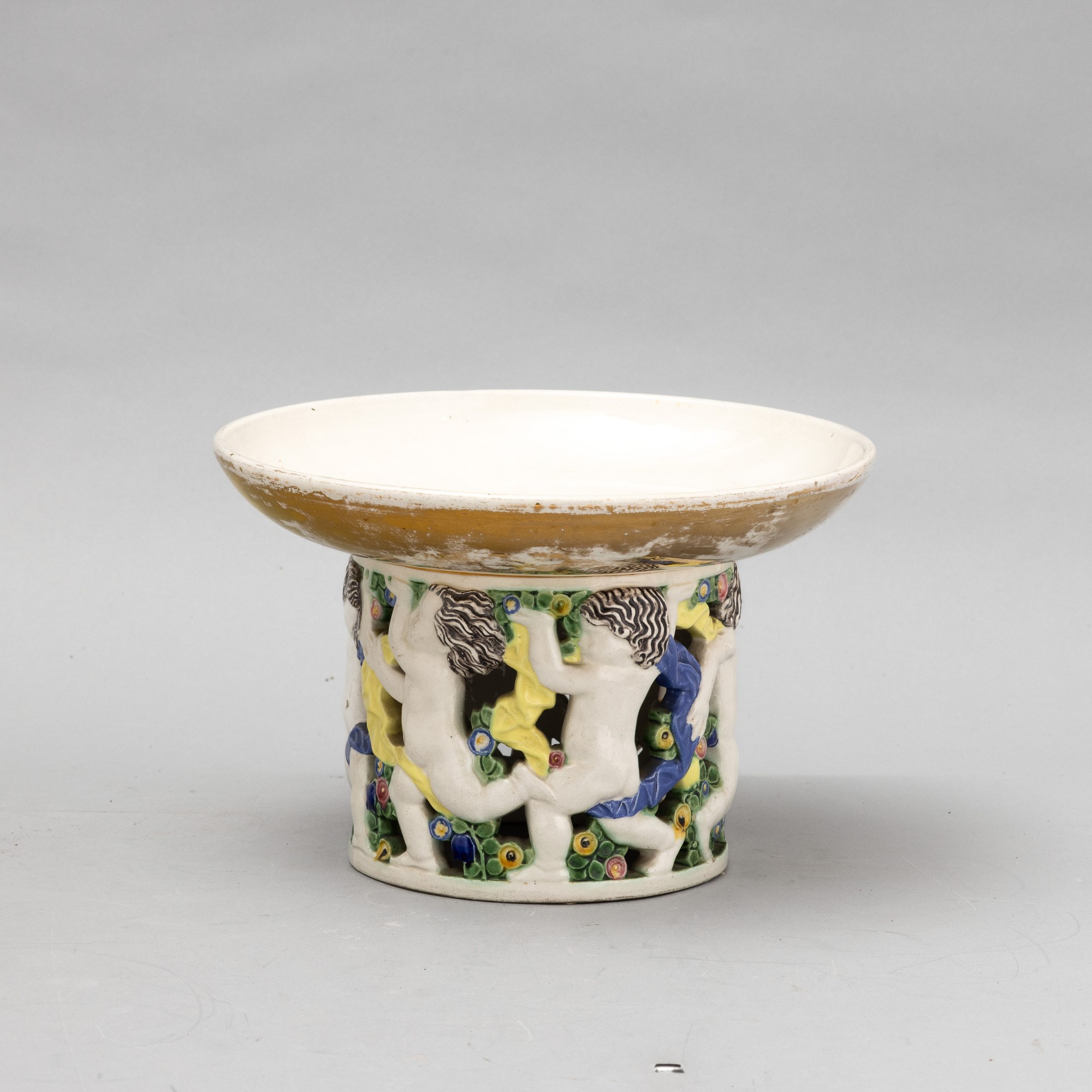 Centrotavola in terraglia su basamento cilindrico con decoro di putti danzanti a rilievo a smalti policromi.