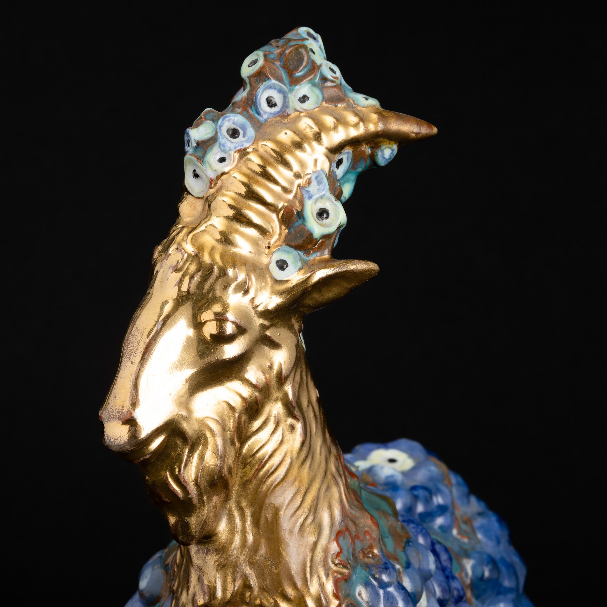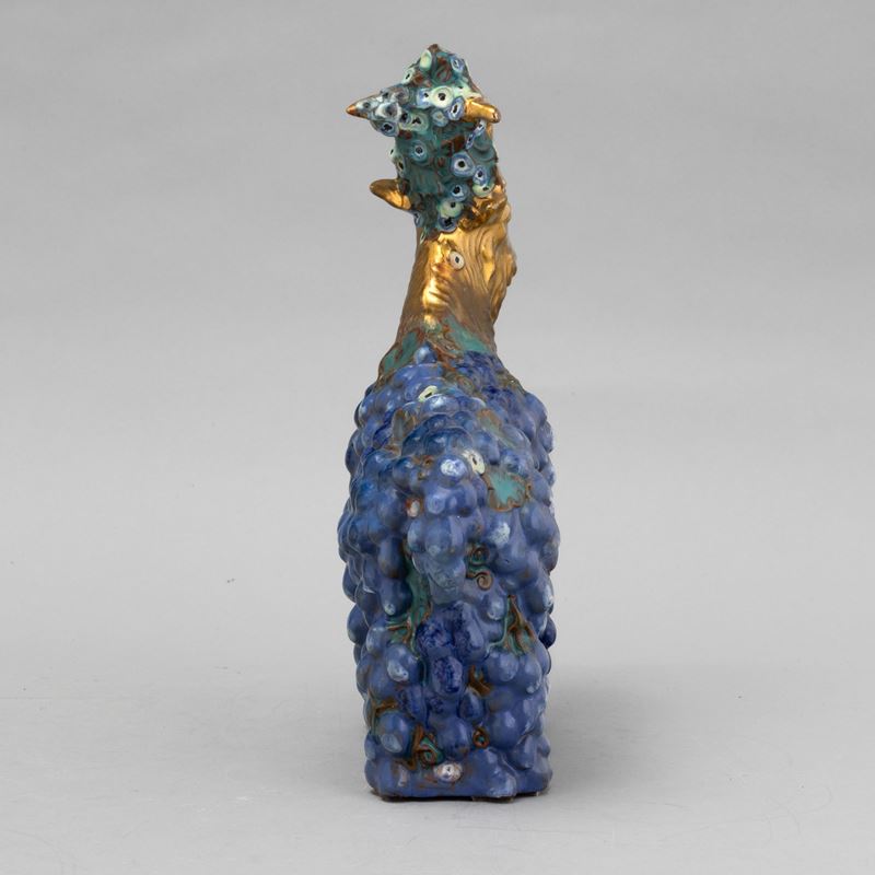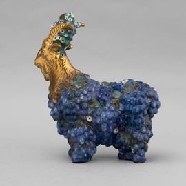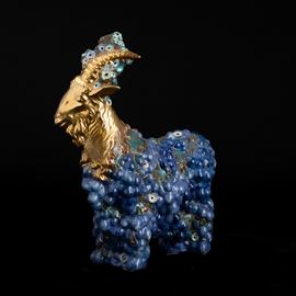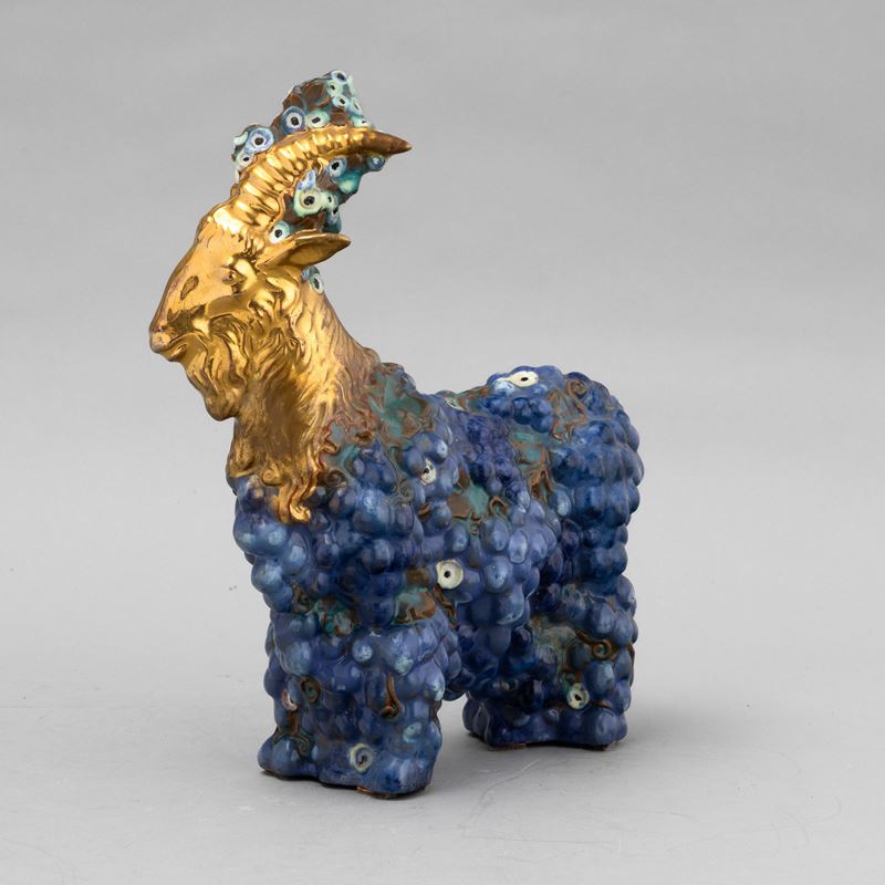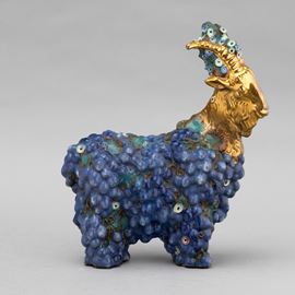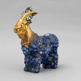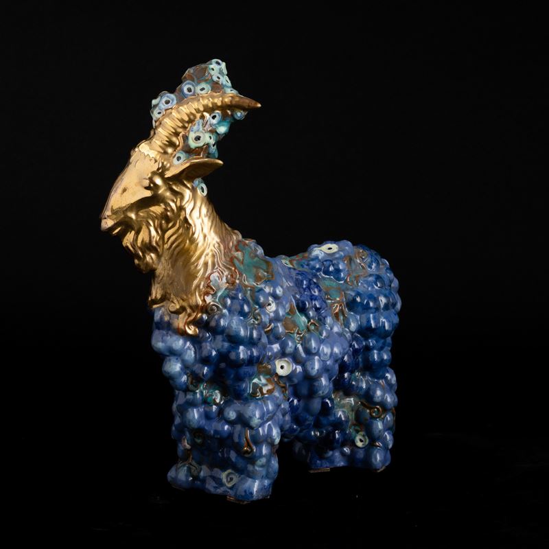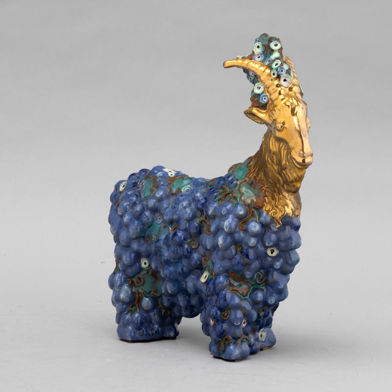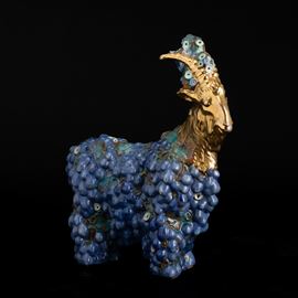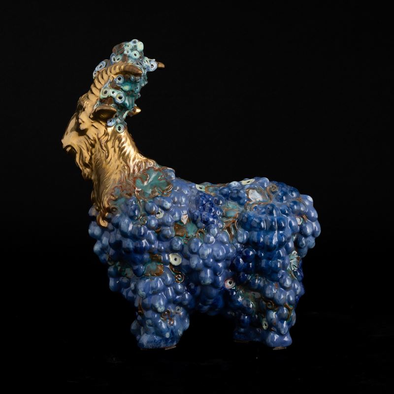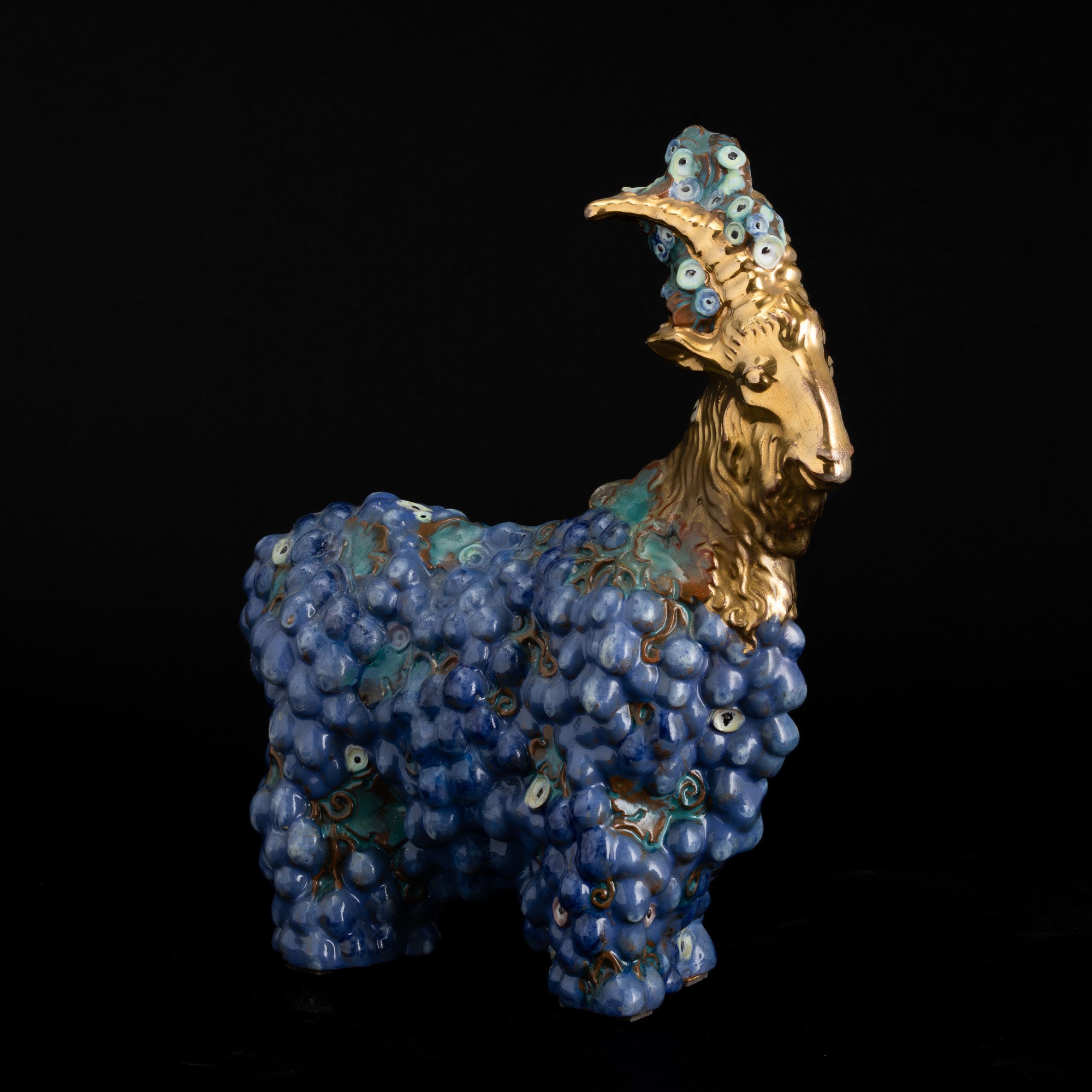 Scultura raffigurante caprone in terraglia ricoperto di grappoli d’uva decorato a smalti policromi e dorature.
