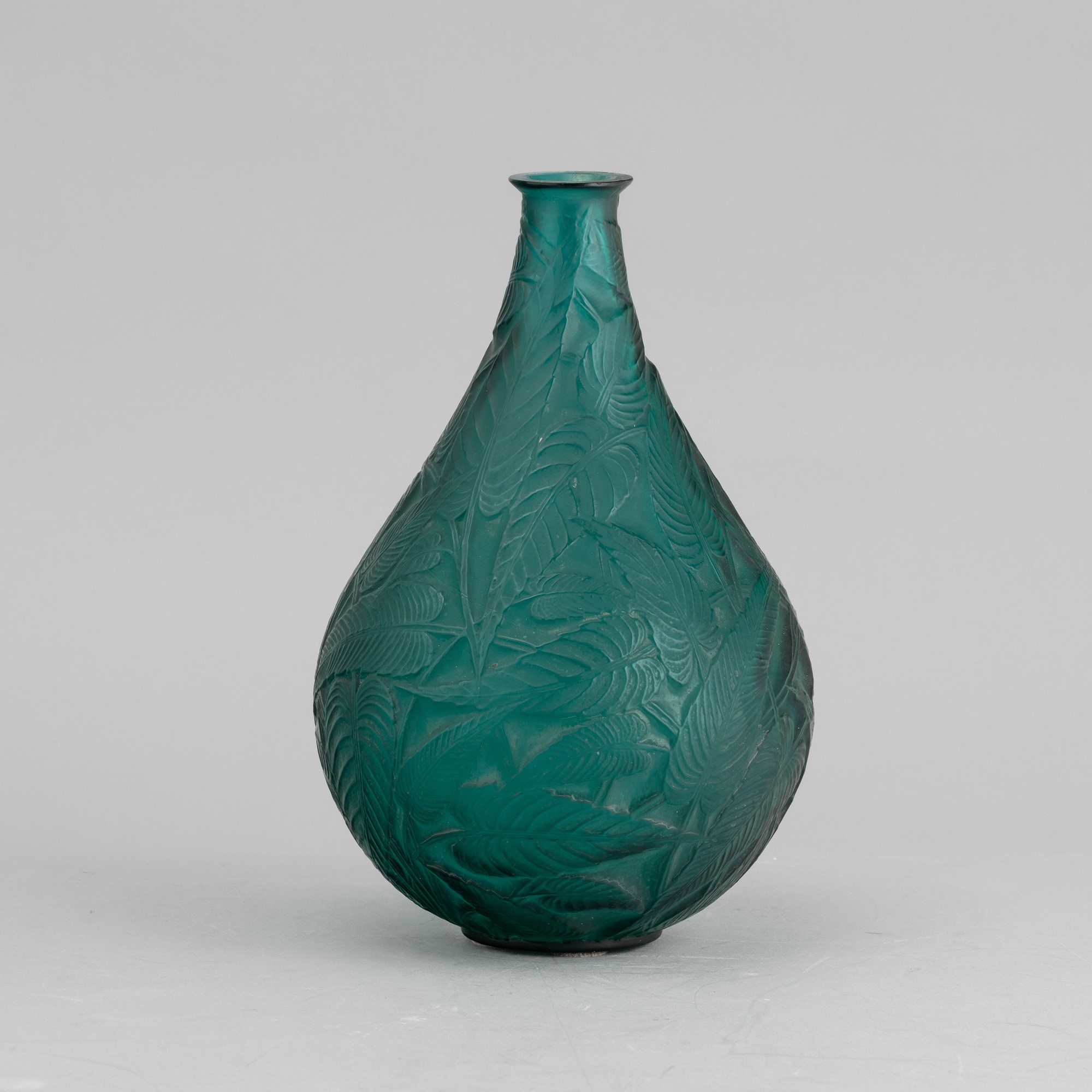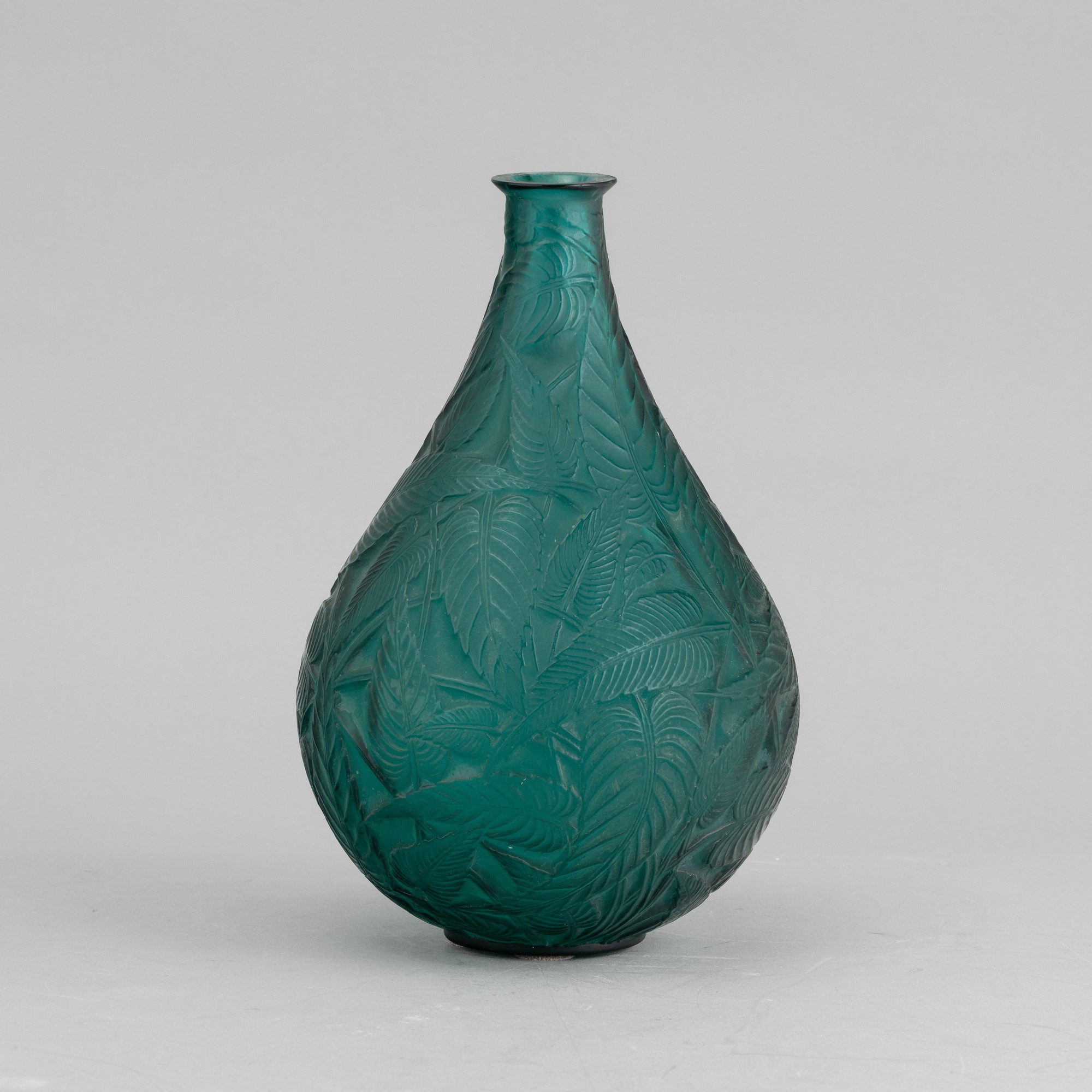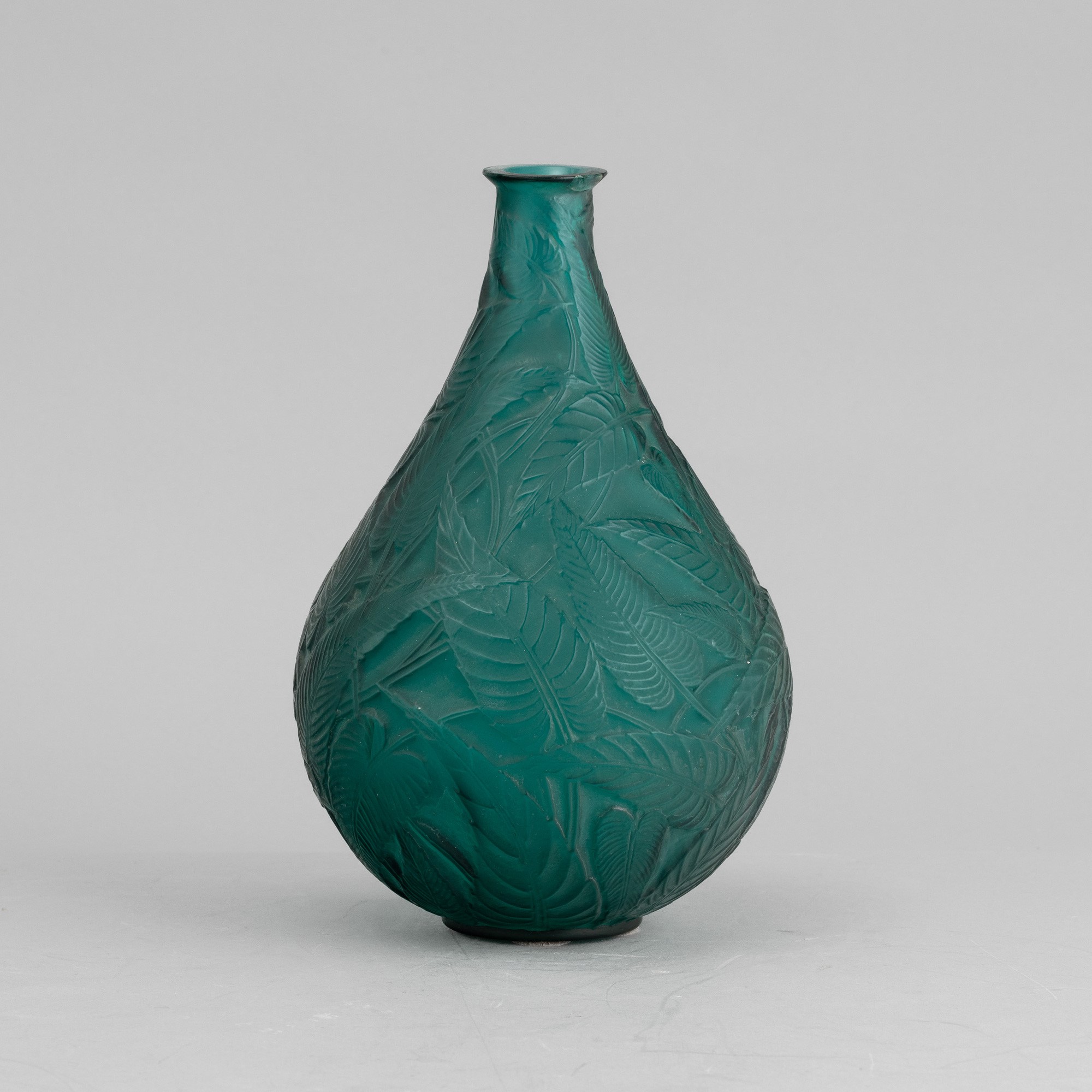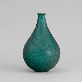 Vaso a goccia Sauge in cristallo stampato verde con decoro di foglie tropicali.