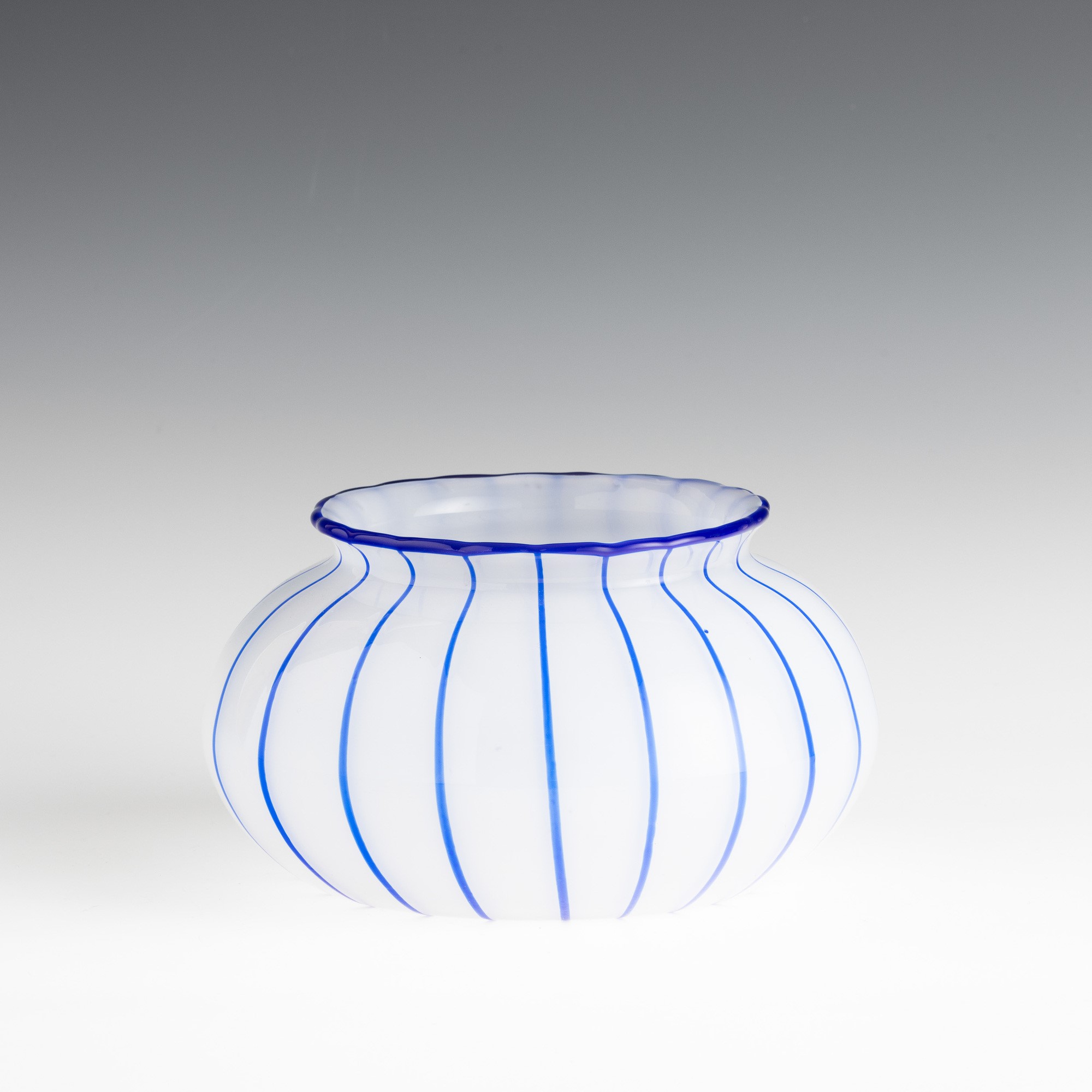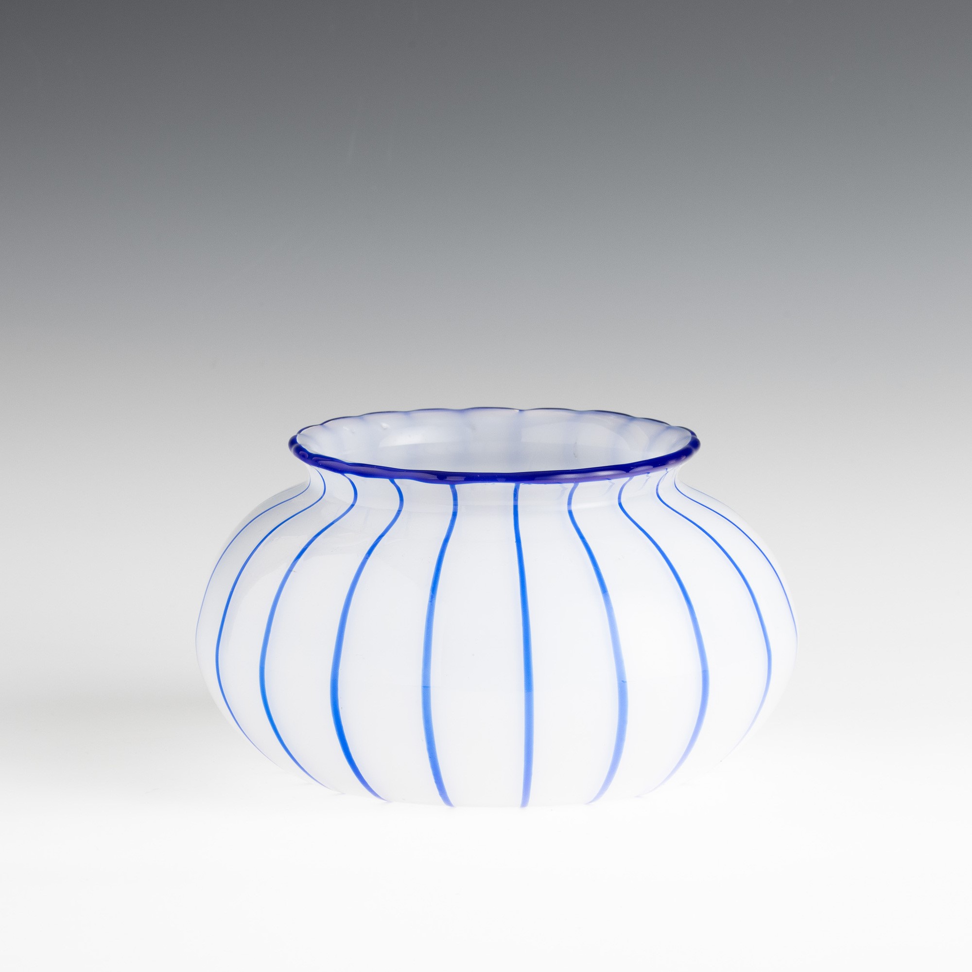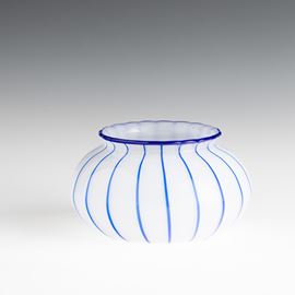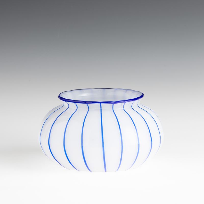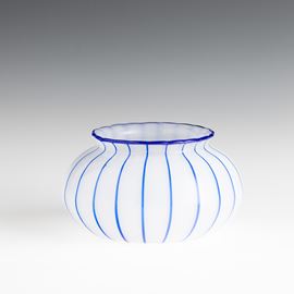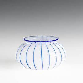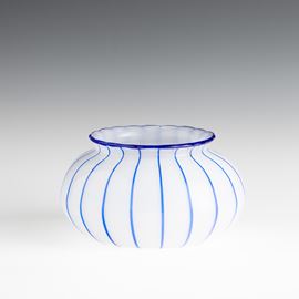 Vaso in vetro soffiato lattimo con decoro di canne applicate blu.