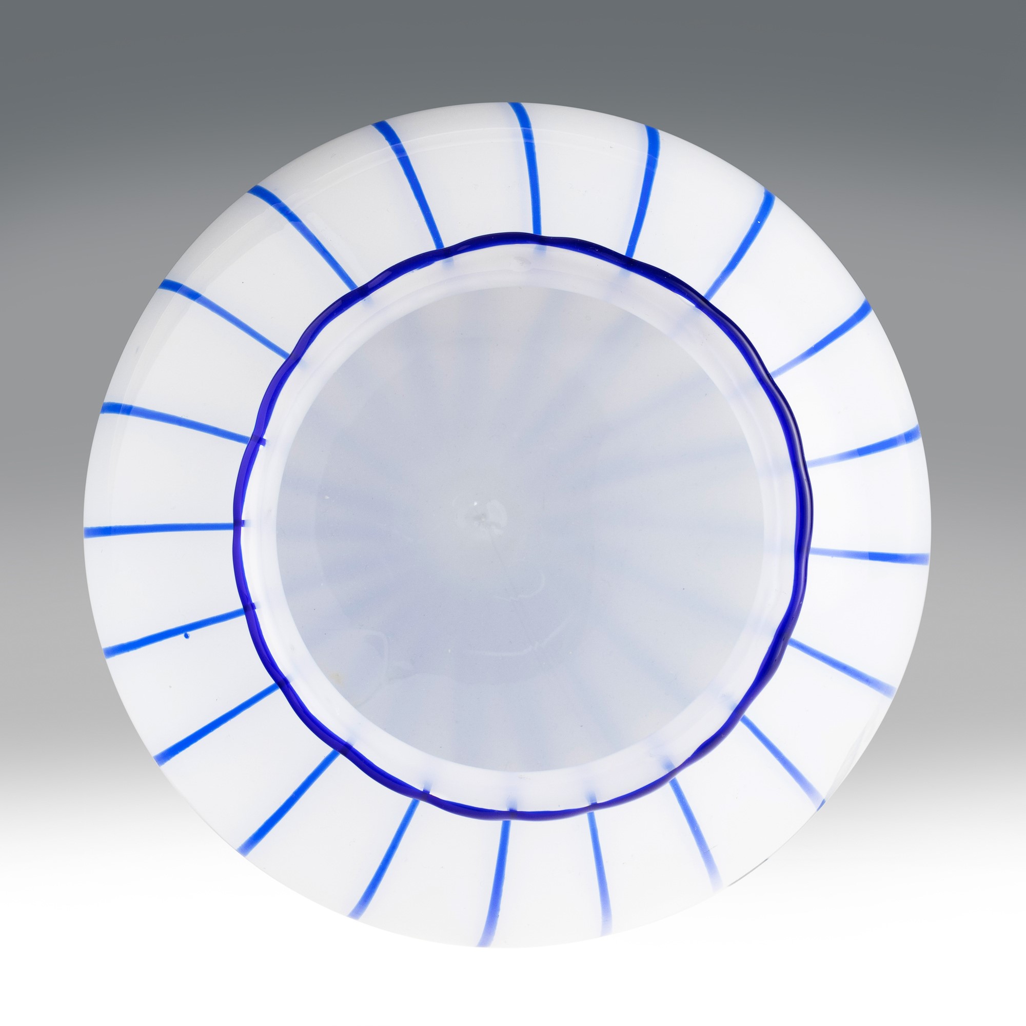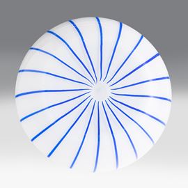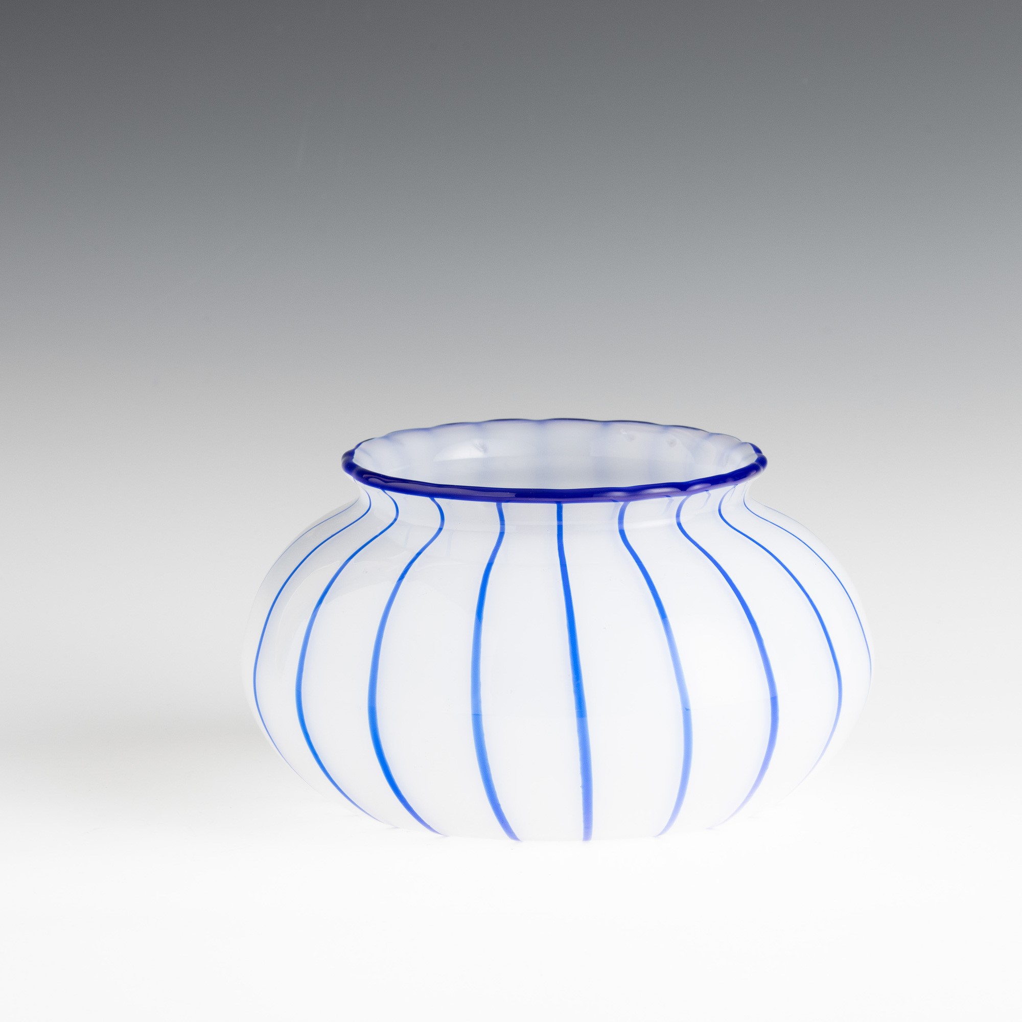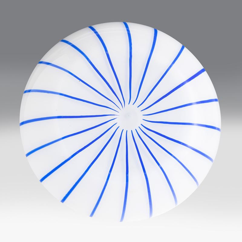 Vaso in vetro soffiato lattimo con decoro di canne applicate blu.