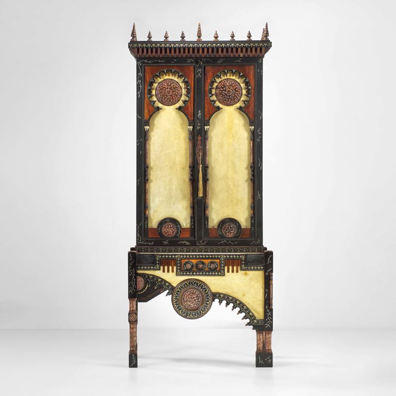 Intarsi in metallo e ottone. Applicazioni in rame sbalzato e in osso. Rivestimenti in pergamena.