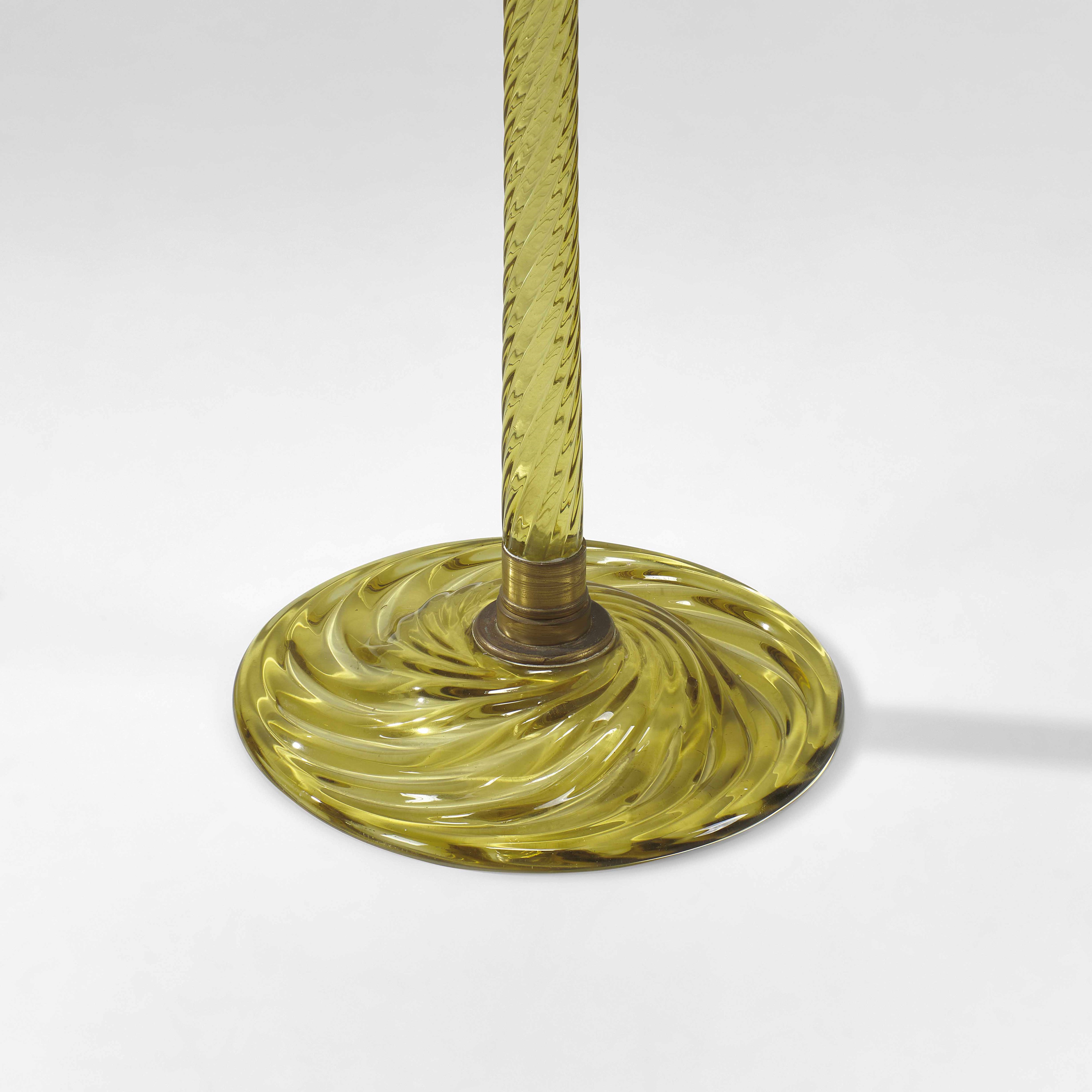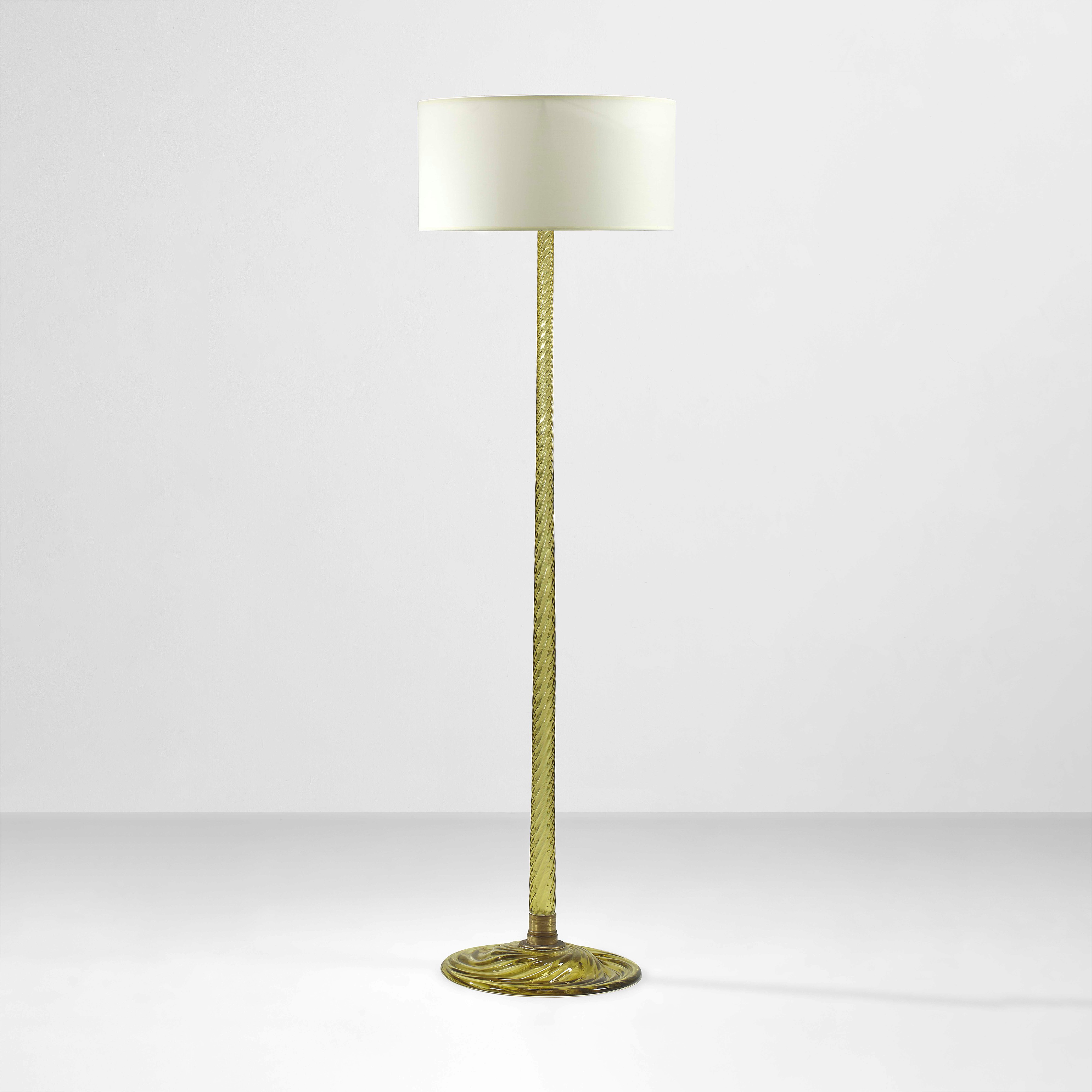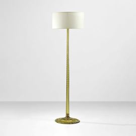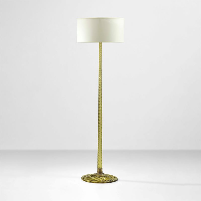 Struttura in vetro di Murano rigato e montatura in ottone. Paralume in tessuto.