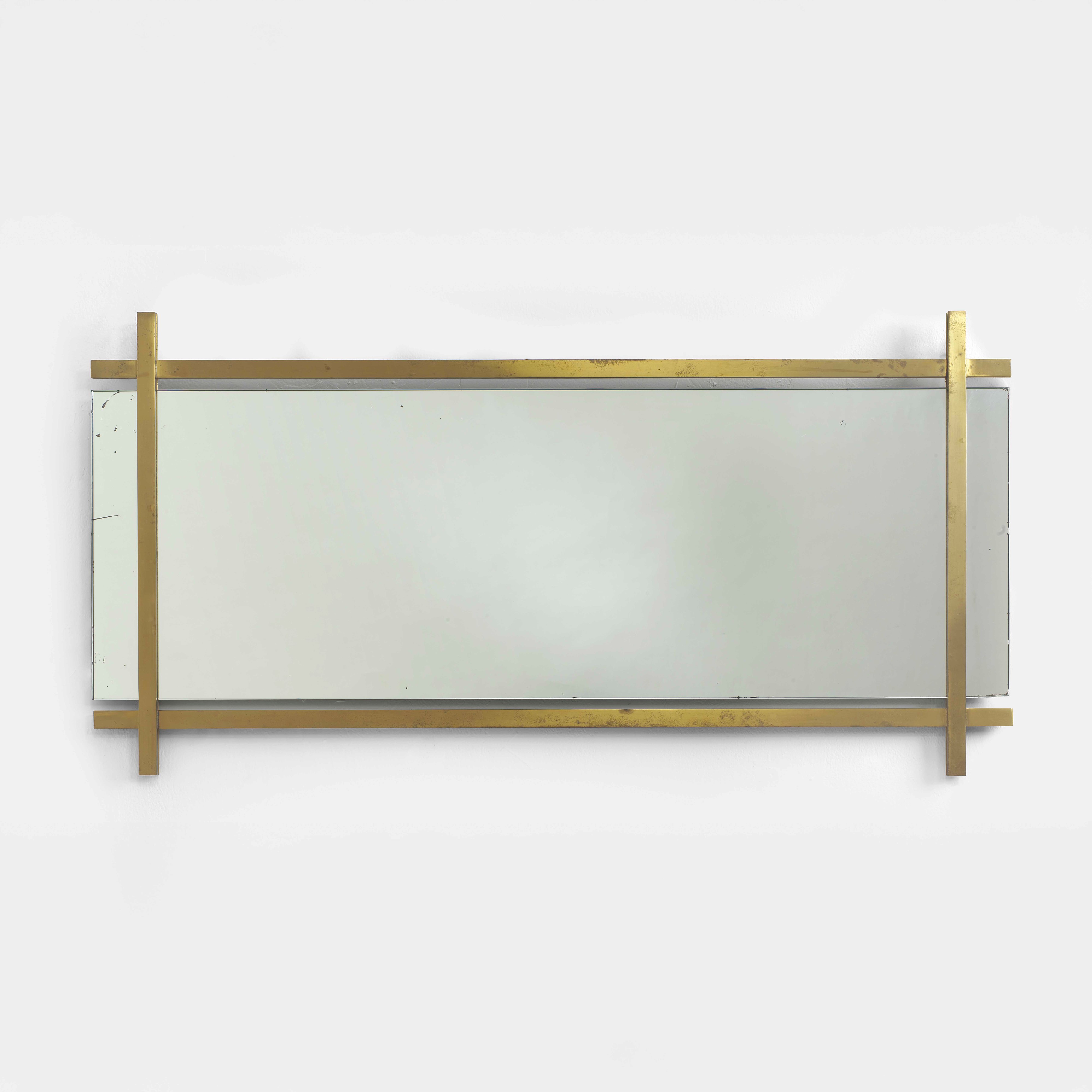Cornice in ottone spazzolato e specchio in cristallo molato a filo lucido.