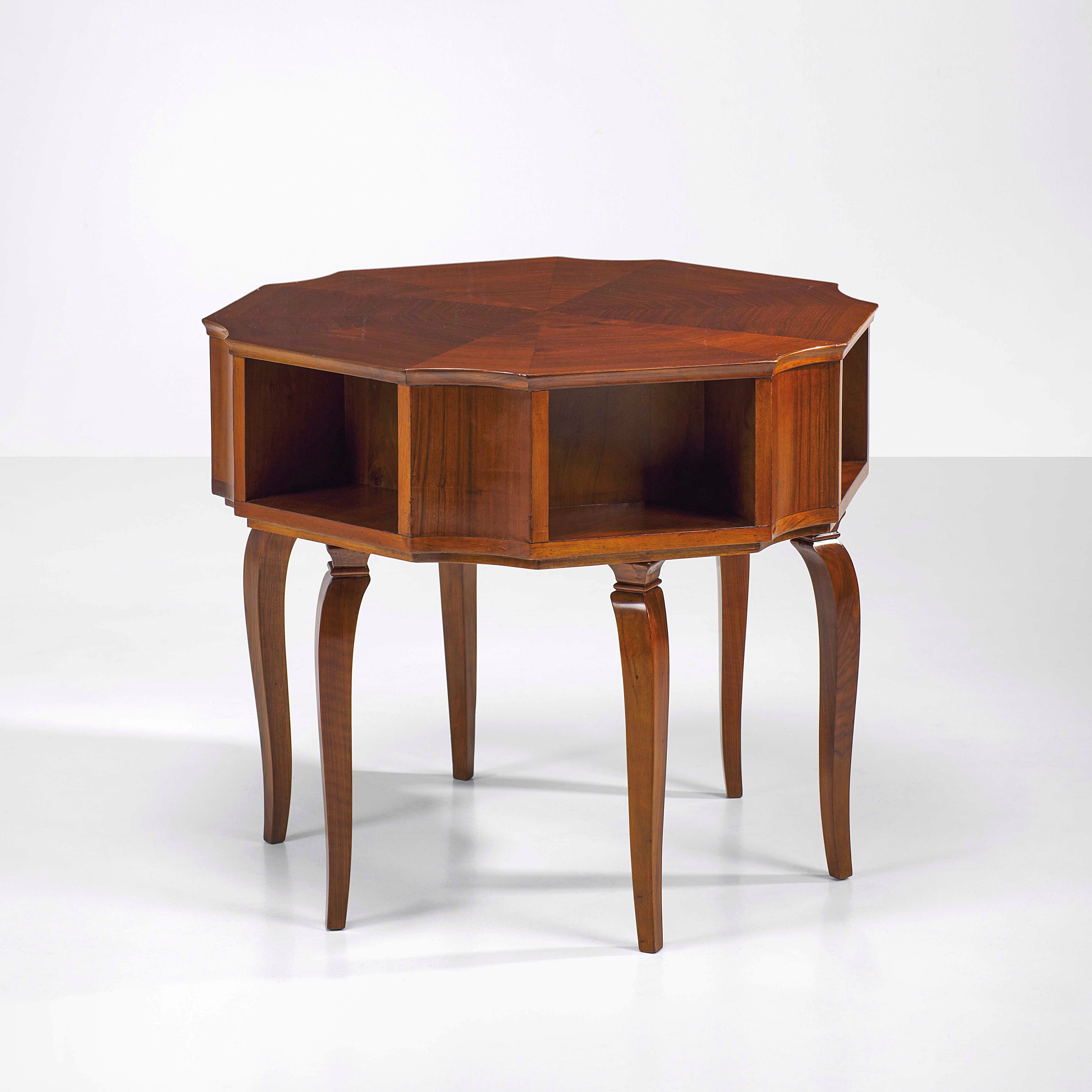 Struttura in legno con piano in legno impiallacciato e vani a giorno.