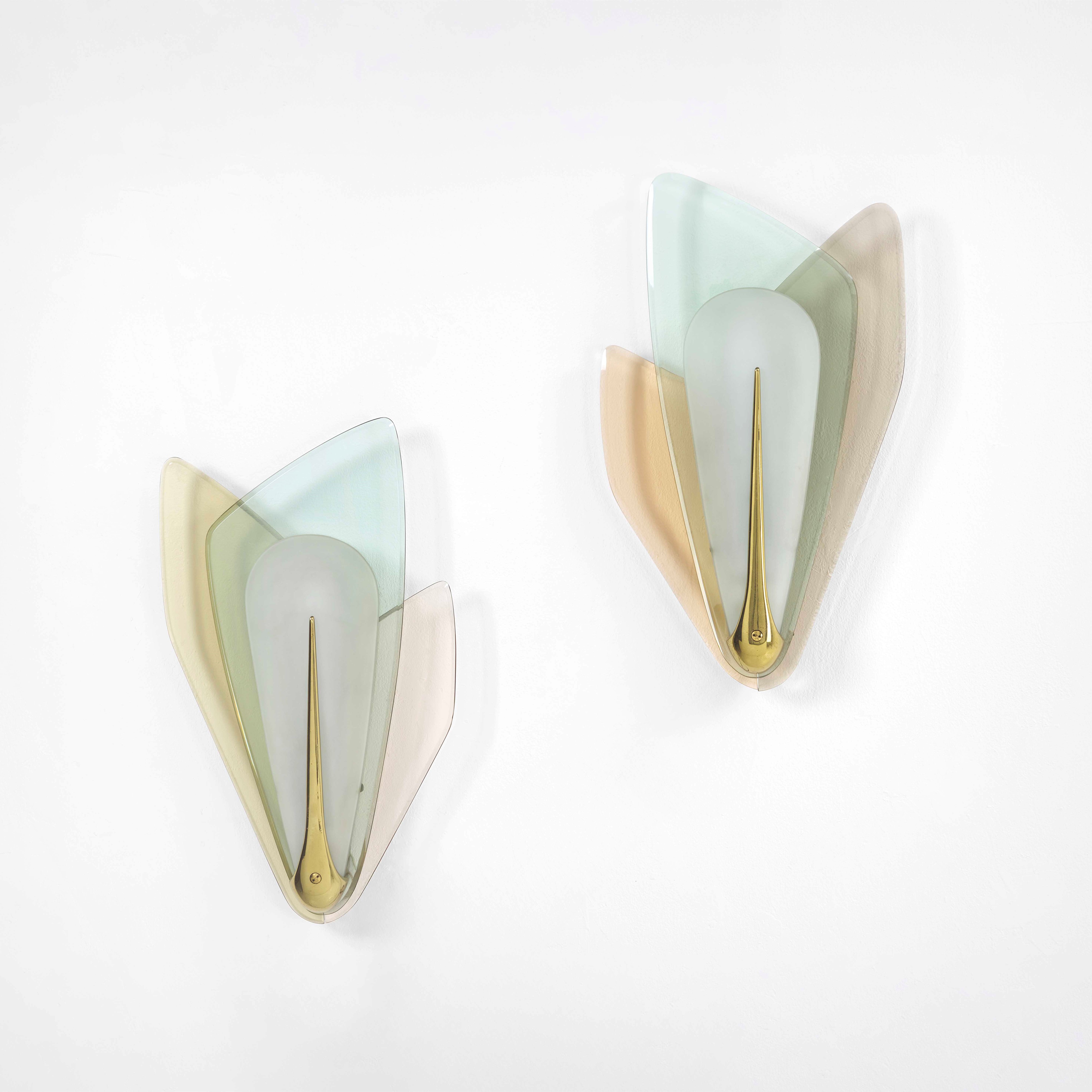 Struttura in ottone, cristalli colorati sagomati e diffusore in cristallo curvato satinato.