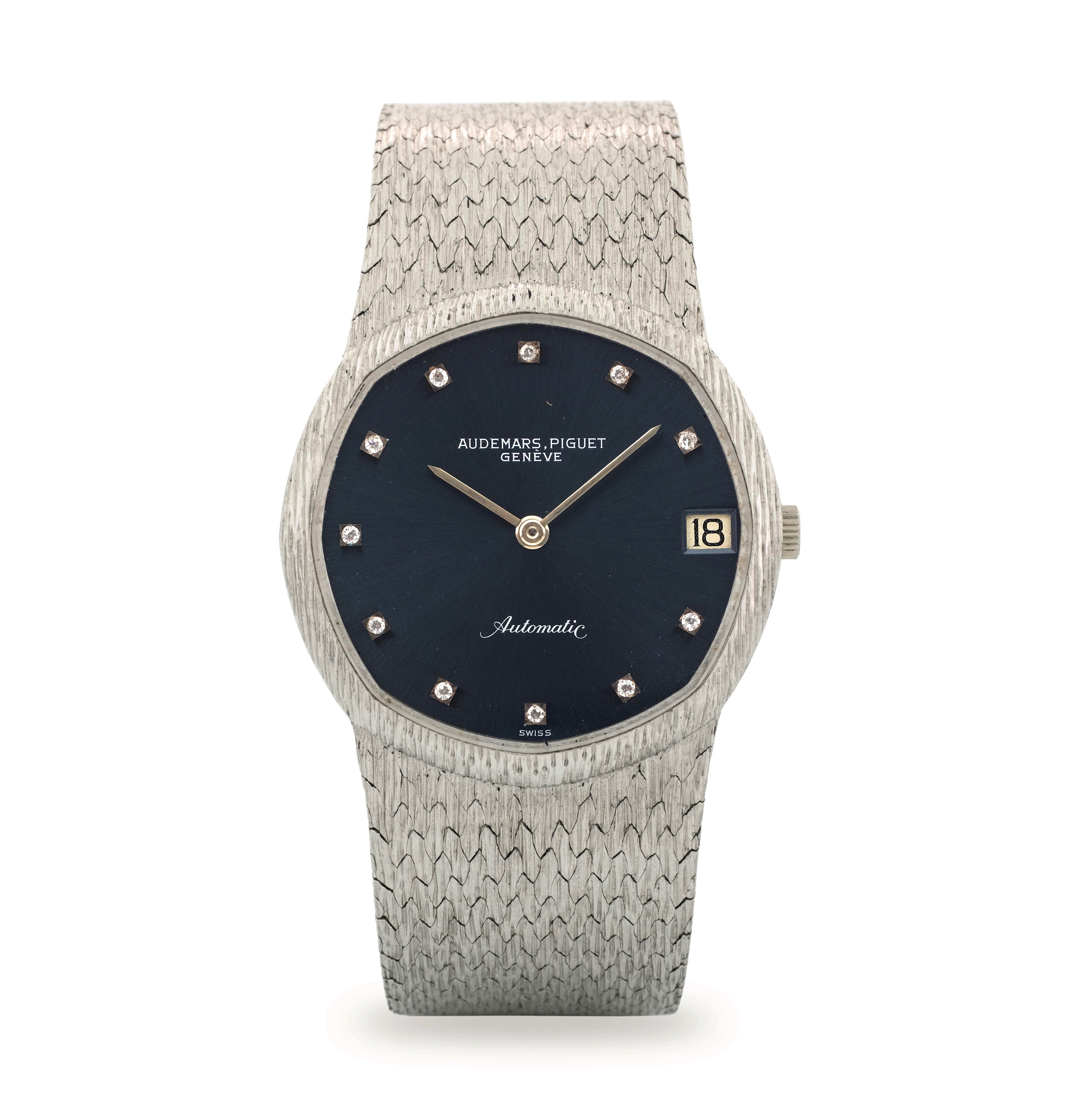 Automatic ref 5388 in oro bianco 18k con bracciale lavorato integrato, quadrante blu con indici in diamante e datario a ore 3, circa 1970